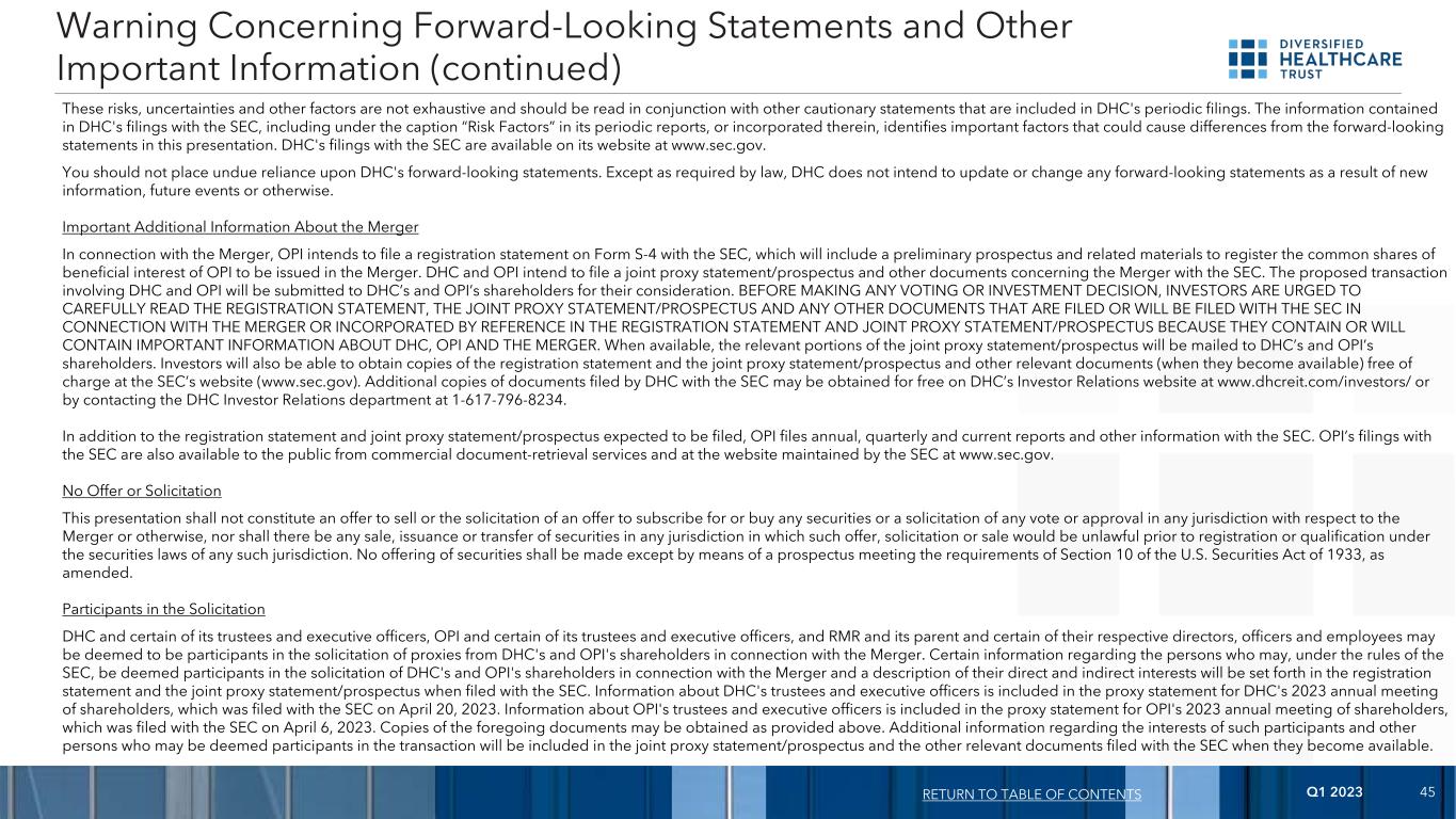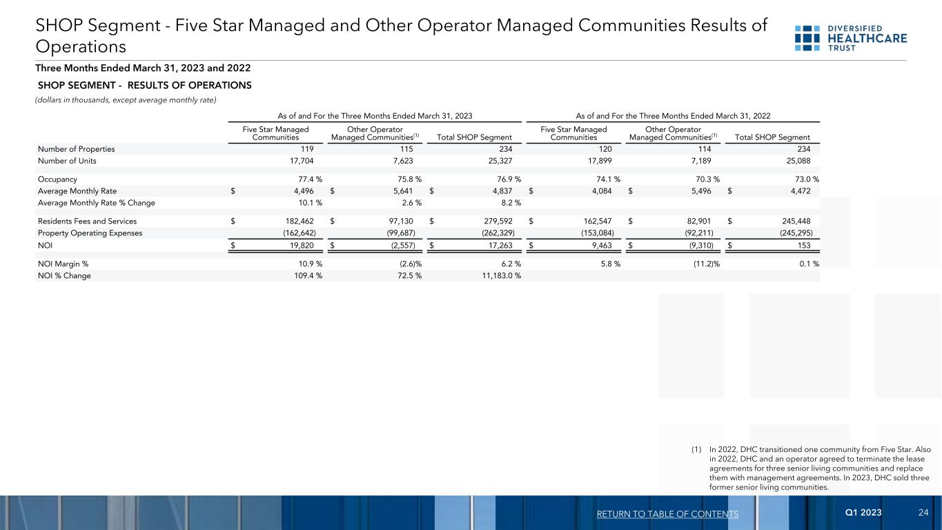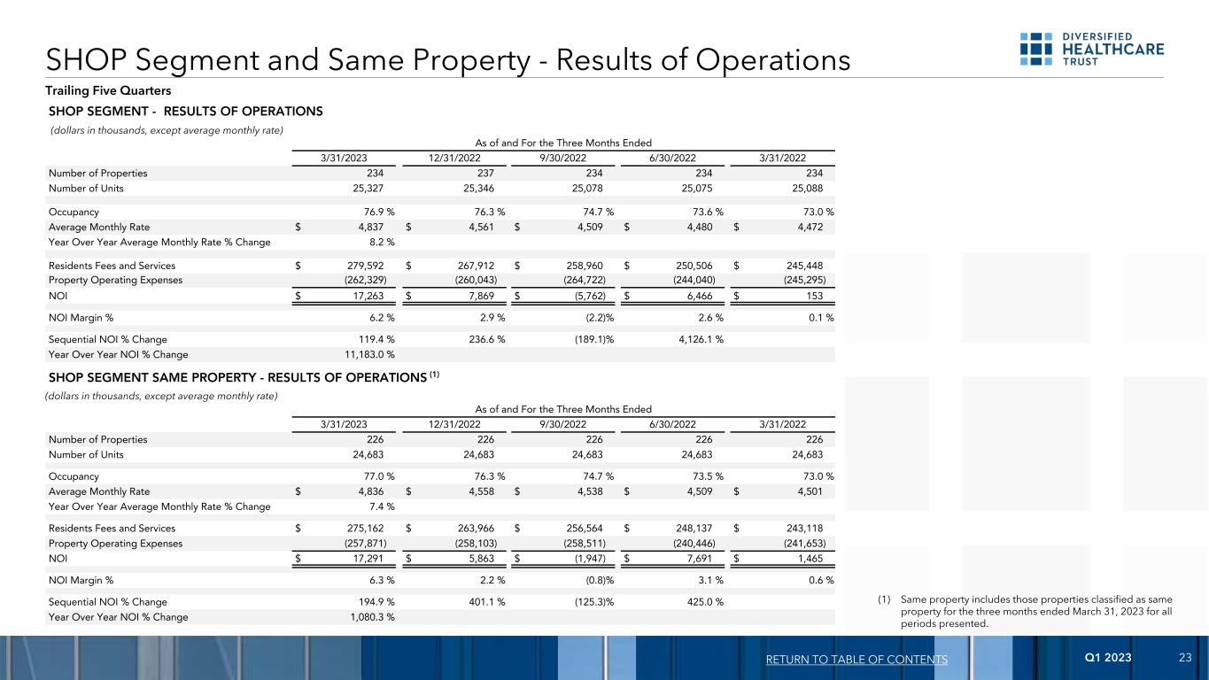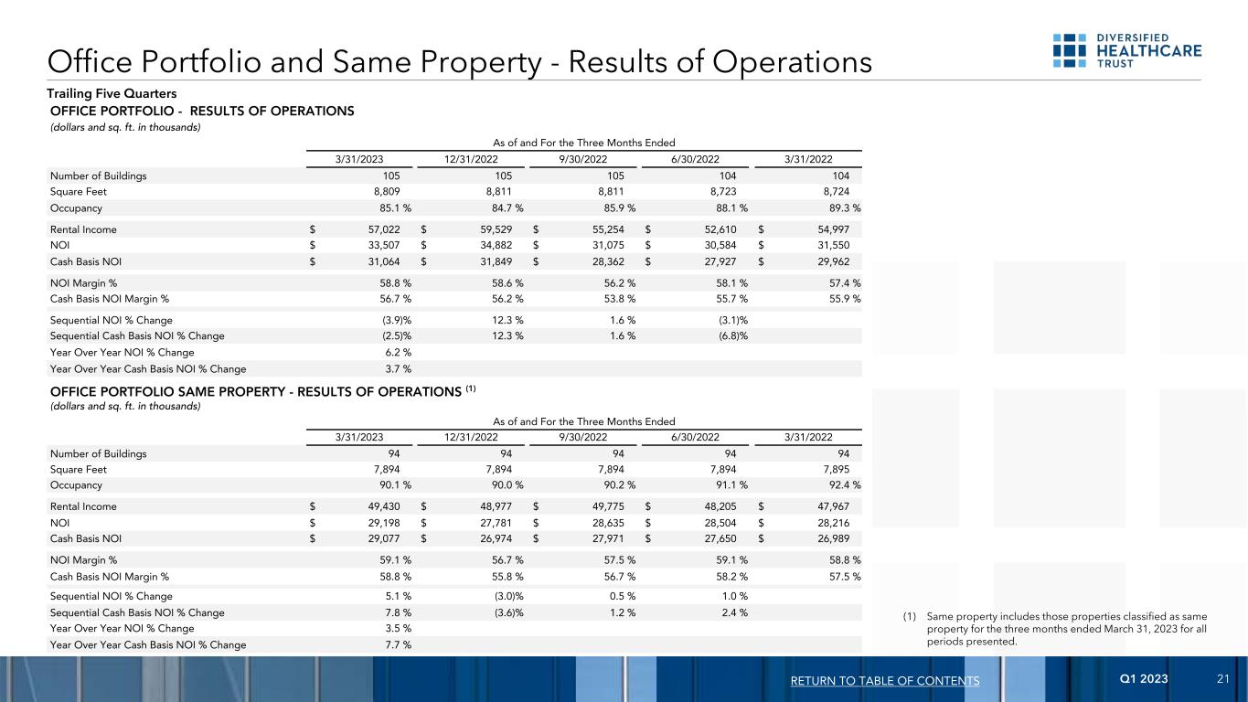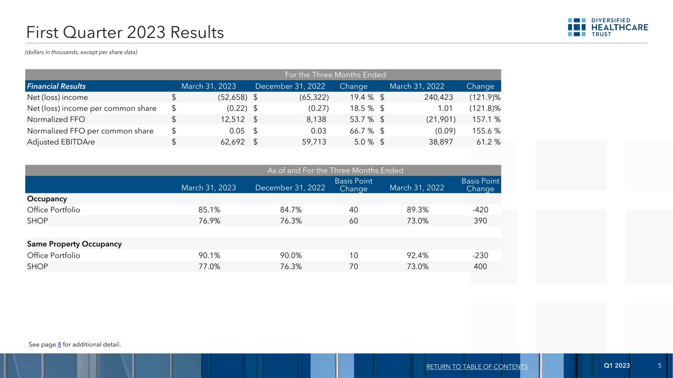 Q1 2023 4 Financial Results First Quarter 2023 Highlights RETURN TO TABLE OF CONTENTS Operating Update Financing Activities and Liquidity • Net loss of $52.7 million, or $0.22 per share. • Normalized FFO of $12.5 million, or $0.05 per share. • Leased 72,351 square feet in DHC's Office Portfolio at weighted average rents that were 17.9% higher than prior rents for the same space. • SHOP occupancy increased 390 basis points to 76.9% and average monthly rates increased by 8.2% year over year, resulting in a 13.9% increase in revenues. • Leased three wellness centers totaling 224,500 square feet soon after terminating previous leases following tenant defaults. • In January 2023, pursuant to the terms of the agreement governing its credit facility, or the credit agreement, DHC repaid $113.6 million in outstanding borrowings under its credit facility and the facility commitments were reduced to $586.4 million. • In February 2023, DHC and its lenders amended the credit agreement to, among other things, extend the waiver of the fixed charge coverage ratio covenant through January 15, 2024 and reduce the facility commitments to $450.0 million following DHC's repayment of $136.4 million in outstanding borrowings. • As of March 31, 2023, DHC had approximately $382.7 million of cash and cash equivalents and restricted cash. • DHC has concluded that there is substantial doubt about its ability to continue as a going concern for at least one year from the date of issuance of DHC's financial statements, or May 8, 2023. For further information, please refer to Note 1 to DHC's consolidated financial statements included in Part I, Item I of DHC's Quarterly Report on Form 10-Q for the quarter ended March 31, 2023, filed with the Securities and Exchange Commission, or SEC on May 8, 2023. Merger with Office Properties Income Trust (OPI) • On April 11, 2023, DHC and Office Properties Income Trust, or OPI, entered into an agreement and plan of merger, pursuant to which, DHC will be merged with and into OPI, with OPI continuing as the surviving entity in the merger, or the Merger. The Merger is subject to the approval of DHC and OPI shareholders and other customary closing conditions. For further information, please refer to DHC's Current Report on Form 8-K, including an investor presentation, filed with the SEC on April 11, 2023, available at www.sec.gov. Same Property Cash Basis NOI For the Three Months Ended (dollars in thousands) March 31, 2023 December 31, 2022 Change March 31, 2022 Change Office Portfolio $ 29,077 $ 26,974 7.8 % $ 26,989 7.7 % SHOP $ 17,291 $ 5,863 194.9 % $ 1,465 1,080.3 % Consolidated $ 55,033 $ 42,633 29.1 % $ 37,164 48.1 %