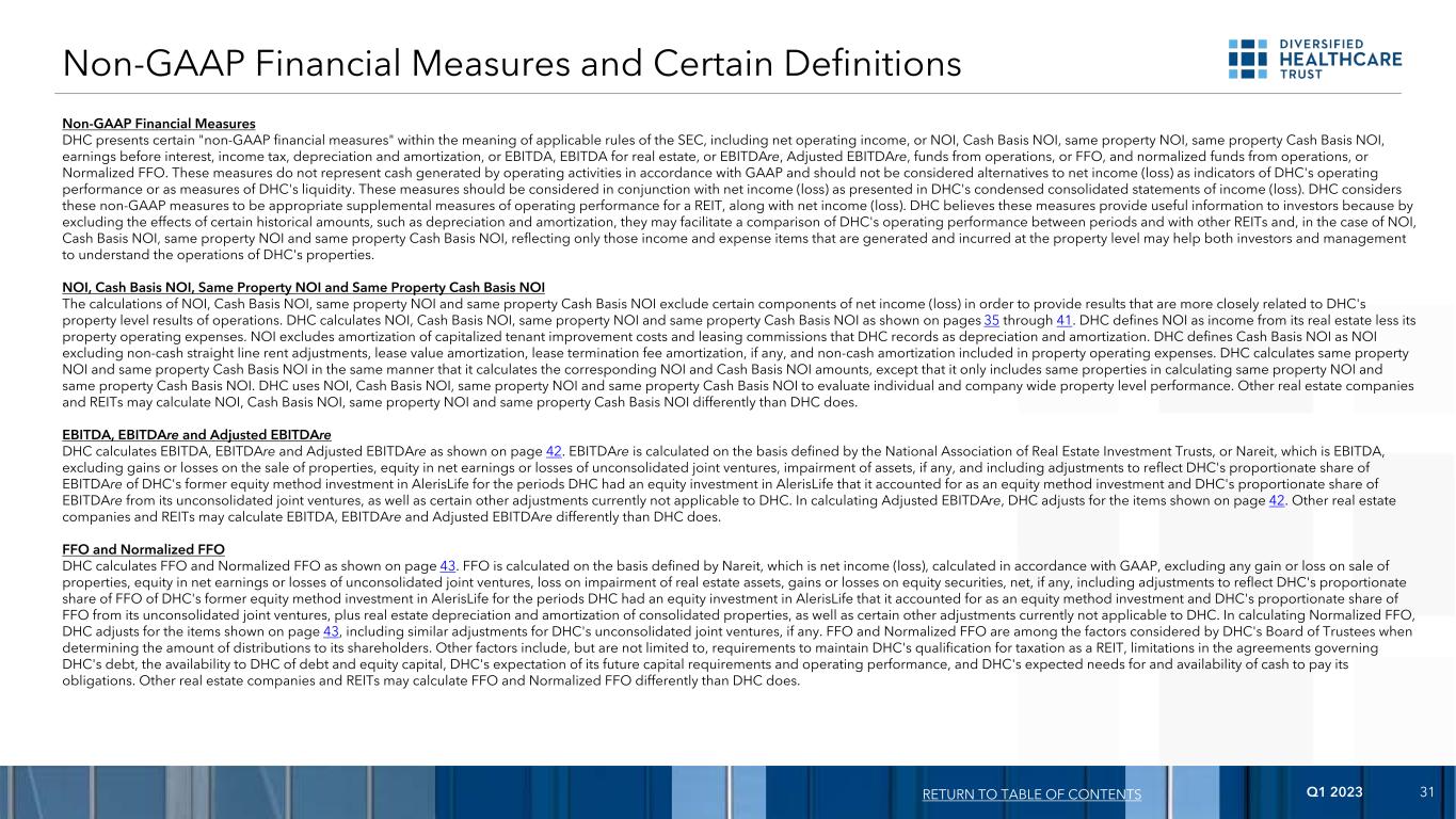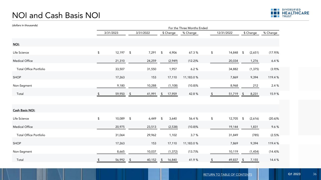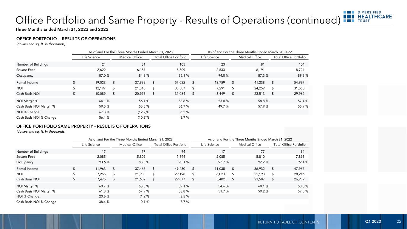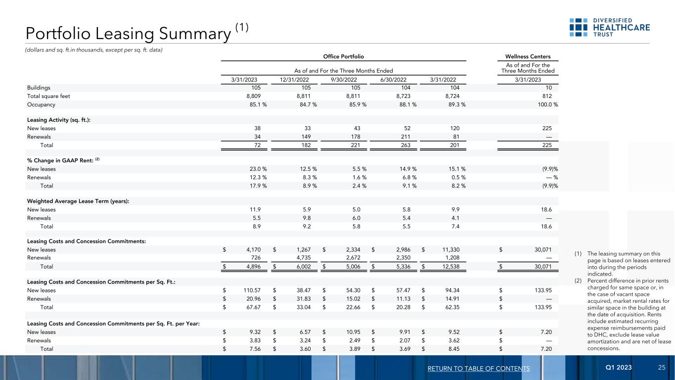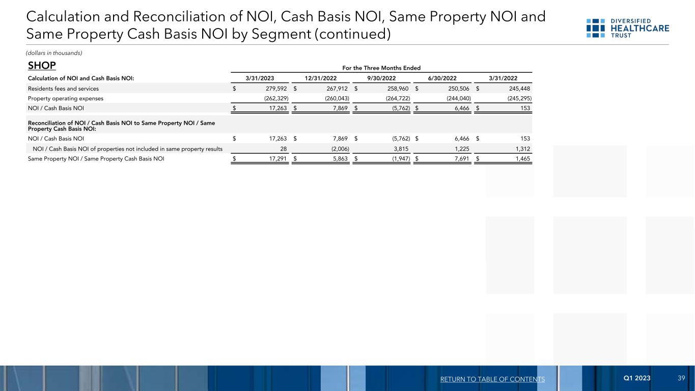 Q1 2023 4 Financial Results First Quarter 2023 Highlights RETURN TO TABLE OF CONTENTS Operating Update Financing Activities and Liquidity • Net loss of $52.7 million, or $0.22 per share. • Normalized FFO of $12.5 million, or $0.05 per share. • Leased 72,351 square feet in DHC's Office Portfolio at weighted average rents that were 17.9% higher than prior rents for the same space. • SHOP occupancy increased 390 basis points to 76.9% and average monthly rates increased by 8.2% year over year, resulting in a 13.9% increase in revenues. • Leased three wellness centers totaling 224,500 square feet soon after terminating previous leases following tenant defaults. • In January 2023, pursuant to the terms of the agreement governing its credit facility, or the credit agreement, DHC repaid $113.6 million in outstanding borrowings under its credit facility and the facility commitments were reduced to $586.4 million. • In February 2023, DHC and its lenders amended the credit agreement to, among other things, extend the waiver of the fixed charge coverage ratio covenant through January 15, 2024 and reduce the facility commitments to $450.0 million following DHC's repayment of $136.4 million in outstanding borrowings. • As of March 31, 2023, DHC had approximately $382.7 million of cash and cash equivalents and restricted cash. • DHC has concluded that there is substantial doubt about its ability to continue as a going concern for at least one year from the date of issuance of DHC's financial statements, or May 8, 2023. For further information, please refer to Note 1 to DHC's consolidated financial statements included in Part I, Item I of DHC's Quarterly Report on Form 10-Q for the quarter ended March 31, 2023, filed with the Securities and Exchange Commission, or SEC on May 8, 2023. Merger with Office Properties Income Trust (OPI) • On April 11, 2023, DHC and Office Properties Income Trust, or OPI, entered into an agreement and plan of merger, pursuant to which, DHC will be merged with and into OPI, with OPI continuing as the surviving entity in the merger, or the Merger. The Merger is subject to the approval of DHC and OPI shareholders and other customary closing conditions. For further information, please refer to DHC's Current Report on Form 8-K, including an investor presentation, filed with the SEC on April 11, 2023, available at www.sec.gov. Same Property Cash Basis NOI For the Three Months Ended (dollars in thousands) March 31, 2023 December 31, 2022 Change March 31, 2022 Change Office Portfolio $ 29,077 $ 26,974 7.8 % $ 26,989 7.7 % SHOP $ 17,291 $ 5,863 194.9 % $ 1,465 1,080.3 % Consolidated $ 55,033 $ 42,633 29.1 % $ 37,164 48.1 %