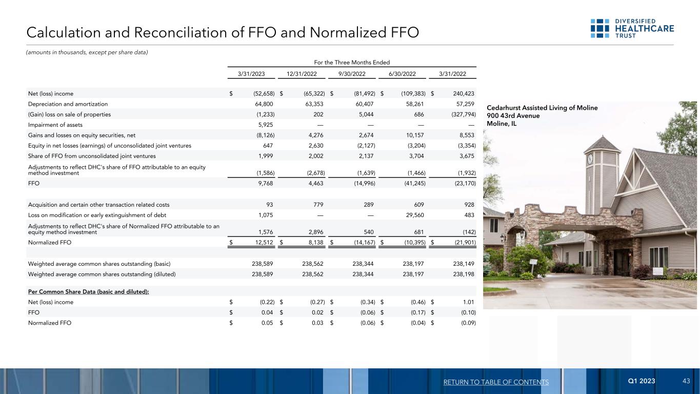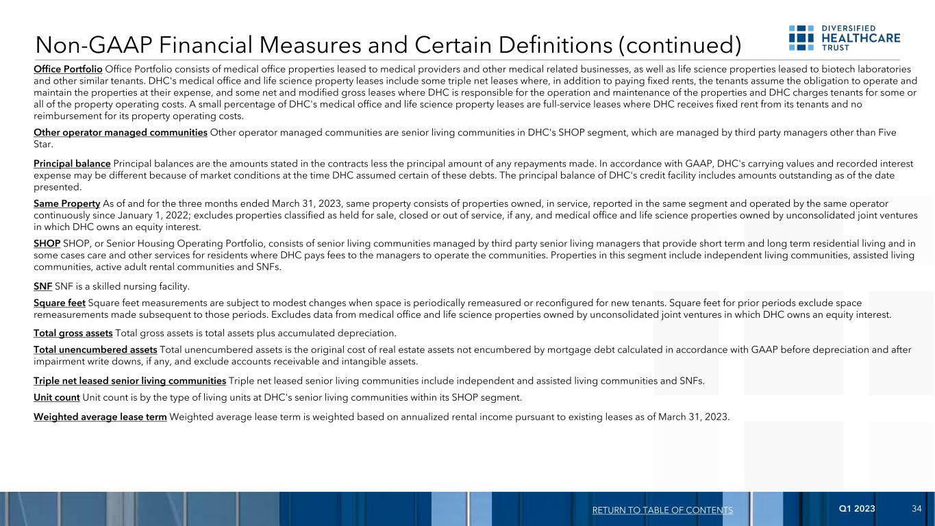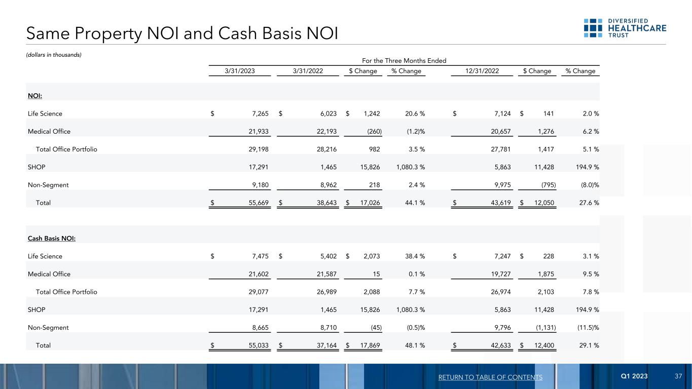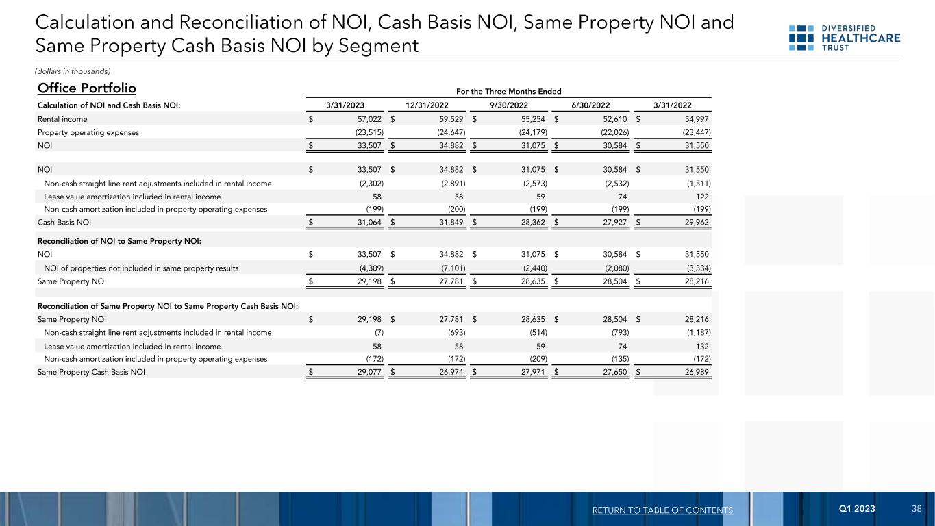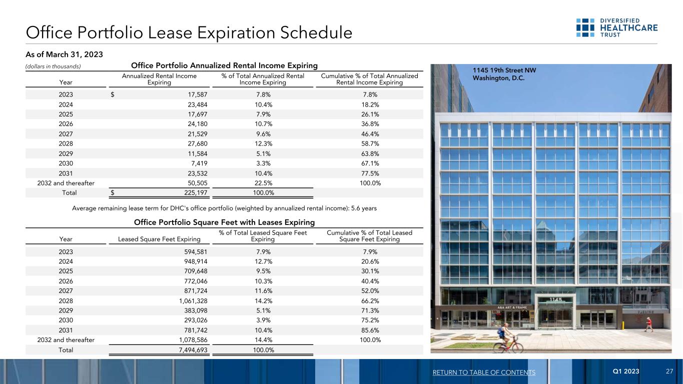 Q1 2023 4 Financial Results First Quarter 2023 Highlights RETURN TO TABLE OF CONTENTS Operating Update Financing Activities and Liquidity • Net loss of $52.7 million, or $0.22 per share. • Normalized FFO of $12.5 million, or $0.05 per share. • Leased 72,351 square feet in DHC's Office Portfolio at weighted average rents that were 17.9% higher than prior rents for the same space. • SHOP occupancy increased 390 basis points to 76.9% and average monthly rates increased by 8.2% year over year, resulting in a 13.9% increase in revenues. • Leased three wellness centers totaling 224,500 square feet soon after terminating previous leases following tenant defaults. • In January 2023, pursuant to the terms of the agreement governing its credit facility, or the credit agreement, DHC repaid $113.6 million in outstanding borrowings under its credit facility and the facility commitments were reduced to $586.4 million. • In February 2023, DHC and its lenders amended the credit agreement to, among other things, extend the waiver of the fixed charge coverage ratio covenant through January 15, 2024 and reduce the facility commitments to $450.0 million following DHC's repayment of $136.4 million in outstanding borrowings. • As of March 31, 2023, DHC had approximately $382.7 million of cash and cash equivalents and restricted cash. • DHC has concluded that there is substantial doubt about its ability to continue as a going concern for at least one year from the date of issuance of DHC's financial statements, or May 8, 2023. For further information, please refer to Note 1 to DHC's consolidated financial statements included in Part I, Item I of DHC's Quarterly Report on Form 10-Q for the quarter ended March 31, 2023, filed with the Securities and Exchange Commission, or SEC on May 8, 2023. Merger with Office Properties Income Trust (OPI) • On April 11, 2023, DHC and Office Properties Income Trust, or OPI, entered into an agreement and plan of merger, pursuant to which, DHC will be merged with and into OPI, with OPI continuing as the surviving entity in the merger, or the Merger. The Merger is subject to the approval of DHC and OPI shareholders and other customary closing conditions. For further information, please refer to DHC's Current Report on Form 8-K, including an investor presentation, filed with the SEC on April 11, 2023, available at www.sec.gov. Same Property Cash Basis NOI For the Three Months Ended (dollars in thousands) March 31, 2023 December 31, 2022 Change March 31, 2022 Change Office Portfolio $ 29,077 $ 26,974 7.8 % $ 26,989 7.7 % SHOP $ 17,291 $ 5,863 194.9 % $ 1,465 1,080.3 % Consolidated $ 55,033 $ 42,633 29.1 % $ 37,164 48.1 %