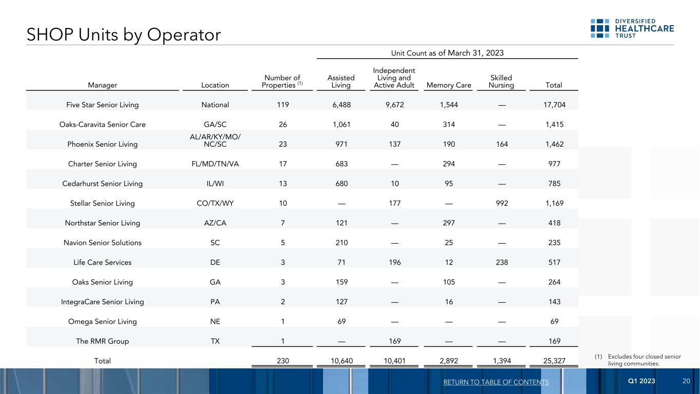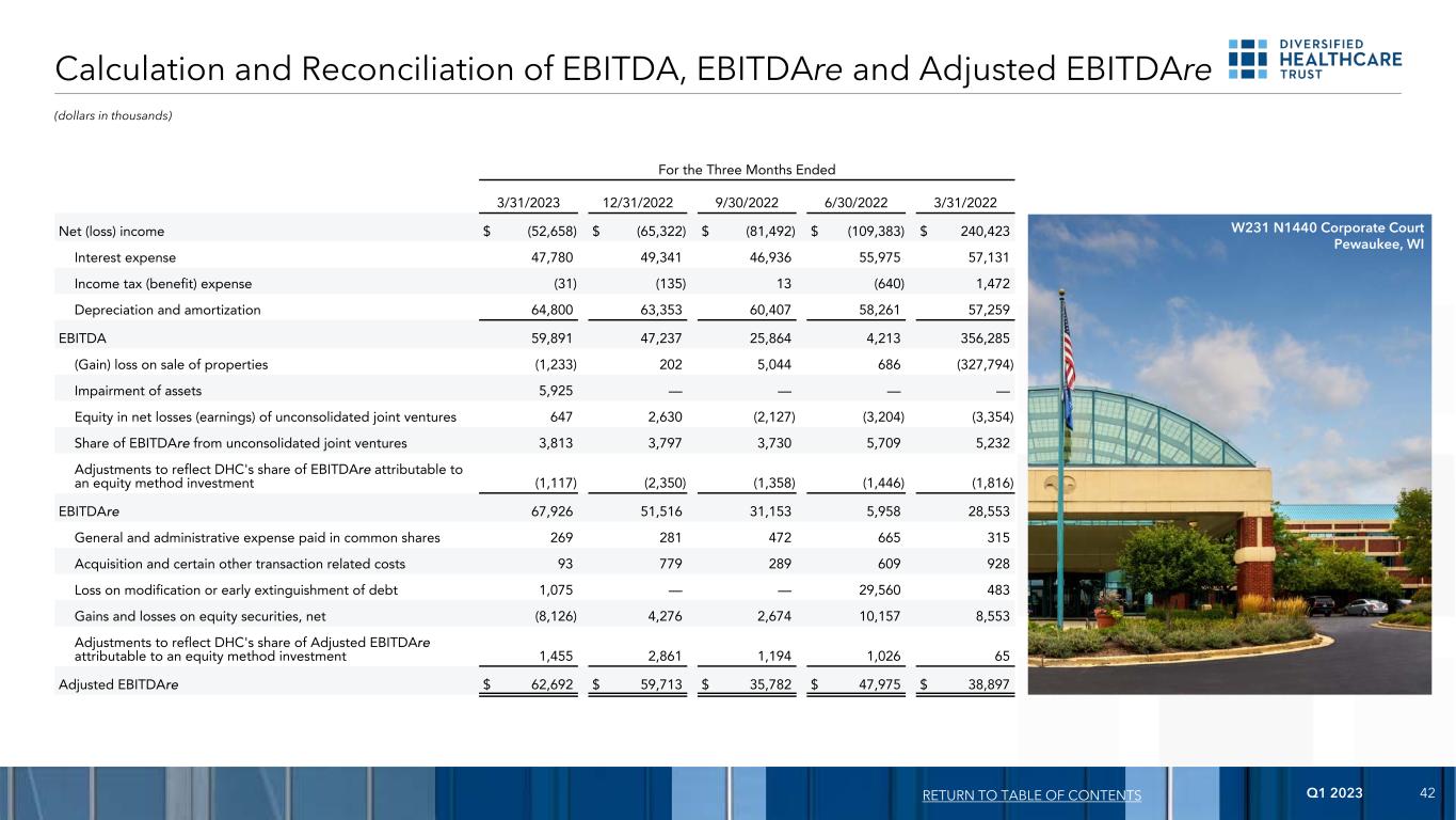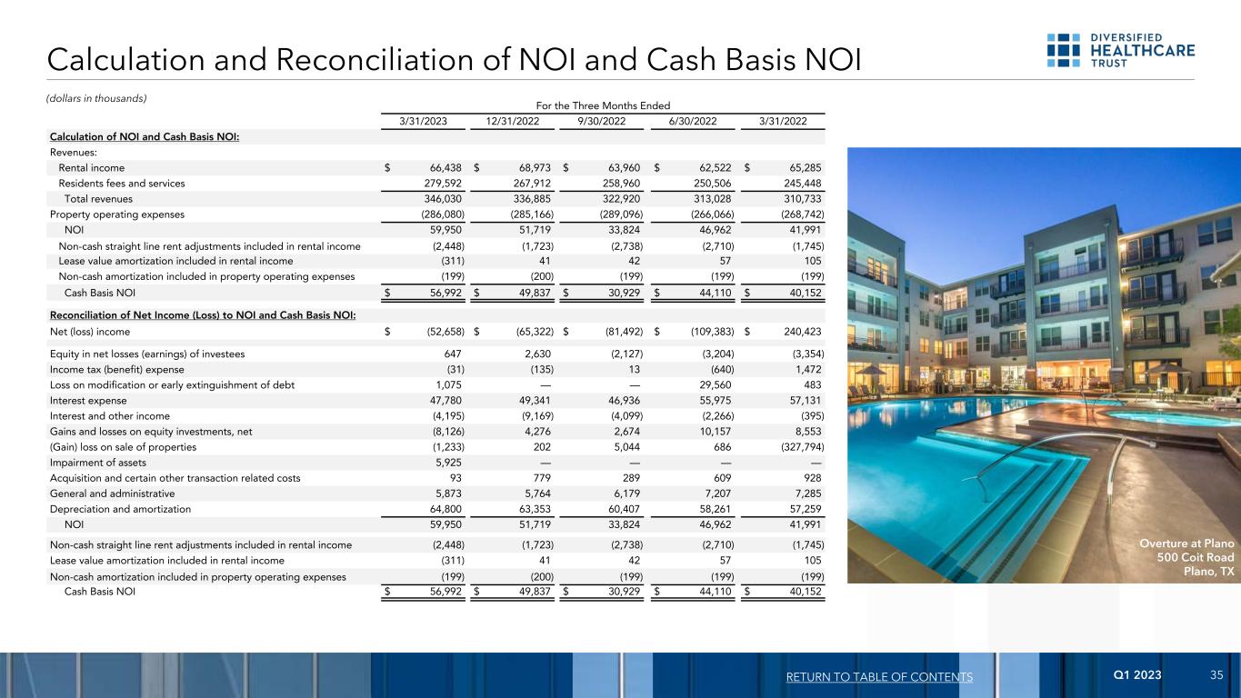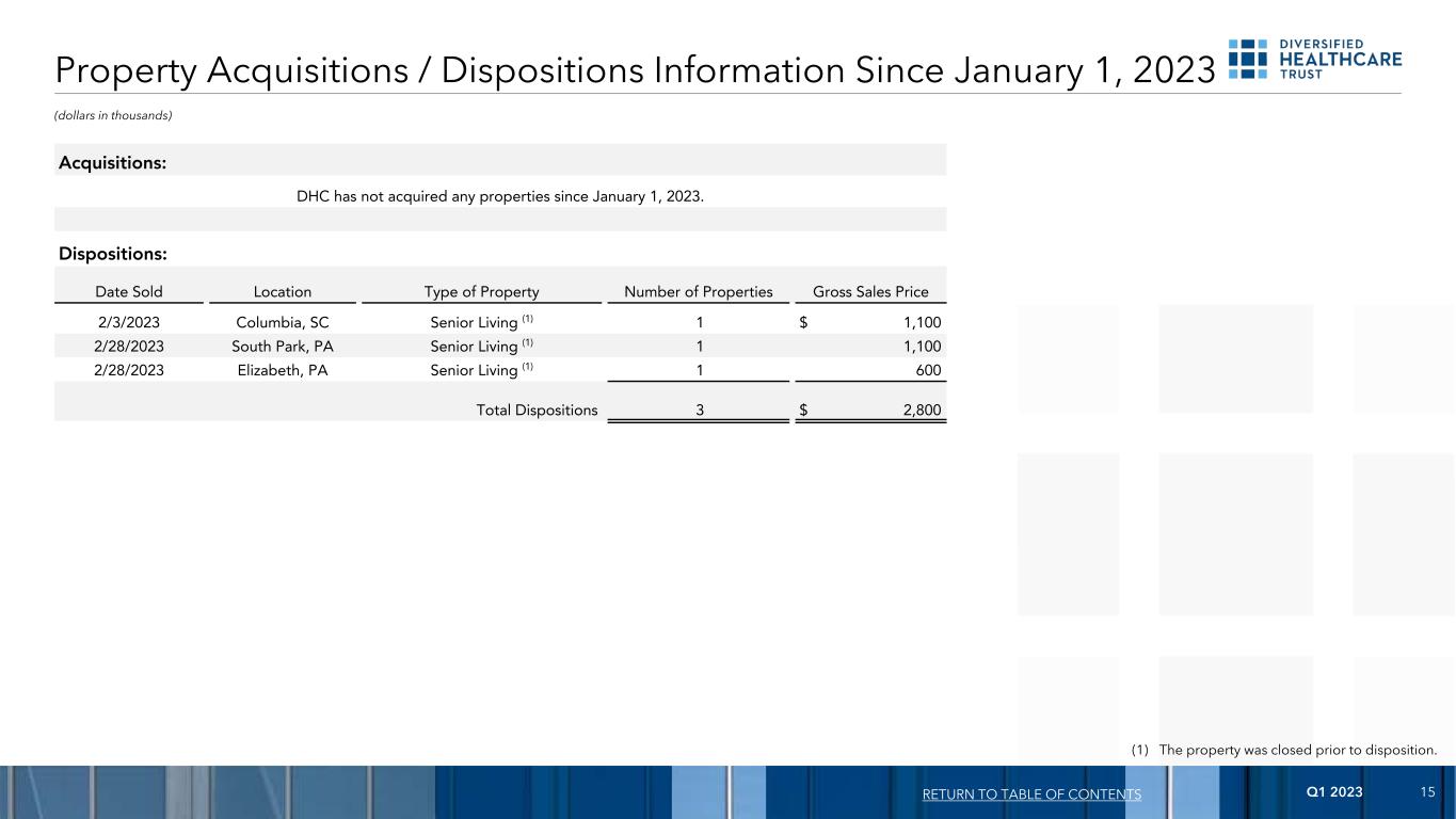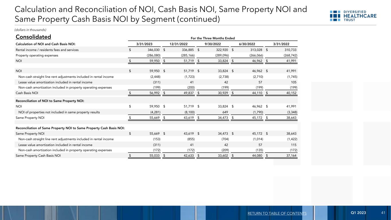 Q1 2023 4 Financial Results First Quarter 2023 Highlights RETURN TO TABLE OF CONTENTS Operating Update Financing Activities and Liquidity • Net loss of $52.7 million, or $0.22 per share. • Normalized FFO of $12.5 million, or $0.05 per share. • Leased 72,351 square feet in DHC's Office Portfolio at weighted average rents that were 17.9% higher than prior rents for the same space. • SHOP occupancy increased 390 basis points to 76.9% and average monthly rates increased by 8.2% year over year, resulting in a 13.9% increase in revenues. • Leased three wellness centers totaling 224,500 square feet soon after terminating previous leases following tenant defaults. • In January 2023, pursuant to the terms of the agreement governing its credit facility, or the credit agreement, DHC repaid $113.6 million in outstanding borrowings under its credit facility and the facility commitments were reduced to $586.4 million. • In February 2023, DHC and its lenders amended the credit agreement to, among other things, extend the waiver of the fixed charge coverage ratio covenant through January 15, 2024 and reduce the facility commitments to $450.0 million following DHC's repayment of $136.4 million in outstanding borrowings. • As of March 31, 2023, DHC had approximately $382.7 million of cash and cash equivalents and restricted cash. • DHC has concluded that there is substantial doubt about its ability to continue as a going concern for at least one year from the date of issuance of DHC's financial statements, or May 8, 2023. For further information, please refer to Note 1 to DHC's consolidated financial statements included in Part I, Item I of DHC's Quarterly Report on Form 10-Q for the quarter ended March 31, 2023, filed with the Securities and Exchange Commission, or SEC on May 8, 2023. Merger with Office Properties Income Trust (OPI) • On April 11, 2023, DHC and Office Properties Income Trust, or OPI, entered into an agreement and plan of merger, pursuant to which, DHC will be merged with and into OPI, with OPI continuing as the surviving entity in the merger, or the Merger. The Merger is subject to the approval of DHC and OPI shareholders and other customary closing conditions. For further information, please refer to DHC's Current Report on Form 8-K, including an investor presentation, filed with the SEC on April 11, 2023, available at www.sec.gov. Same Property Cash Basis NOI For the Three Months Ended (dollars in thousands) March 31, 2023 December 31, 2022 Change March 31, 2022 Change Office Portfolio $ 29,077 $ 26,974 7.8 % $ 26,989 7.7 % SHOP $ 17,291 $ 5,863 194.9 % $ 1,465 1,080.3 % Consolidated $ 55,033 $ 42,633 29.1 % $ 37,164 48.1 %