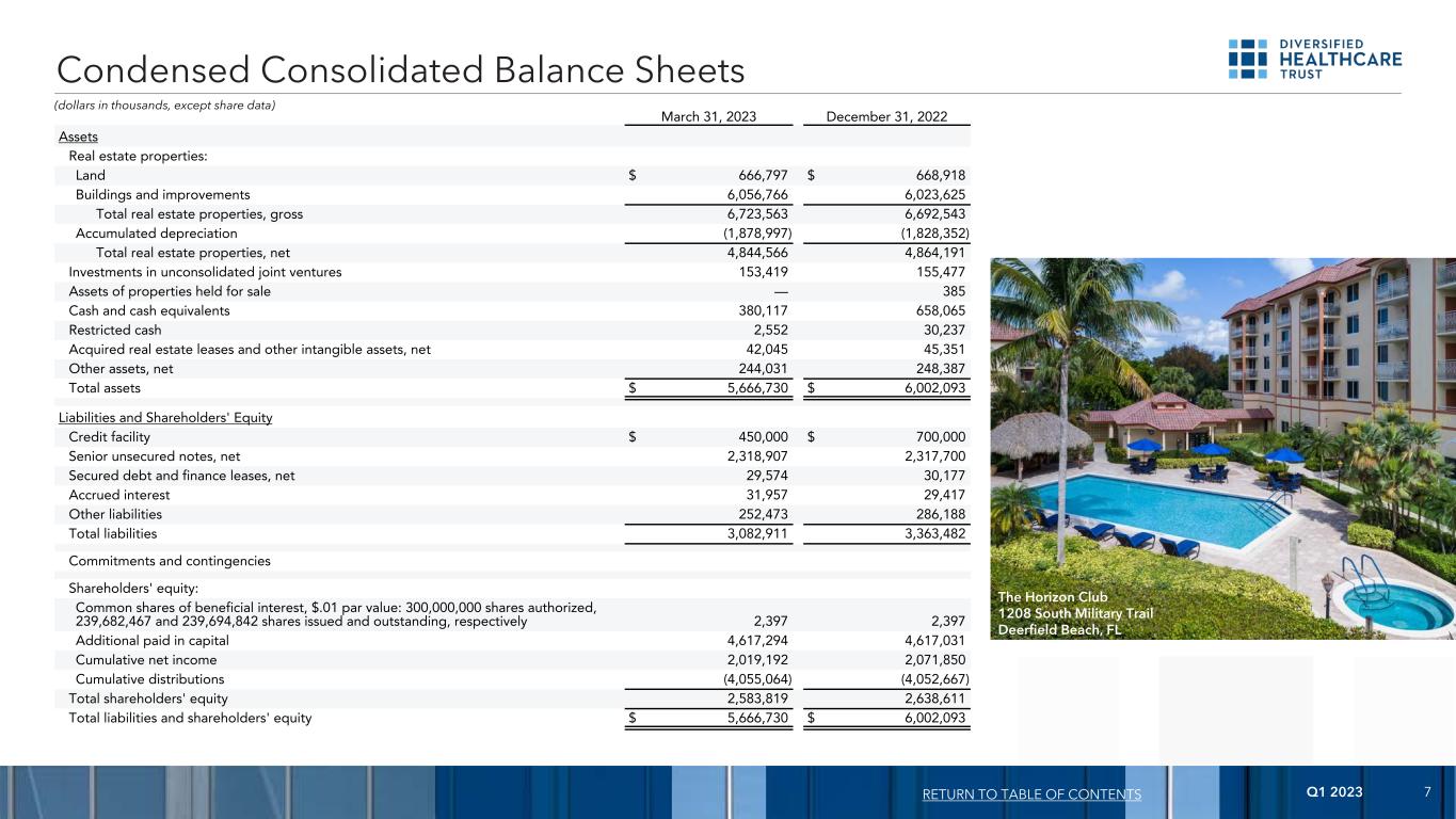 Q1 2023 7 March 31, 2023 December 31, 2022 Assets Real estate properties: Land $ 666,797 $ 668,918 Buildings and improvements 6,056,766 6,023,625 Total real estate properties, gross 6,723,563 6,692,543 Accumulated depreciation (1,878,997) (1,828,352) Total real estate properties, net 4,844,566 4,864,191 Investments in unconsolidated joint ventures 153,419 155,477 Assets of properties held for sale — 385 Cash and cash equivalents 380,117 658,065 Restricted cash 2,552 30,237 Acquired real estate leases and other intangible assets, net 42,045 45,351 Other assets, net 244,031 248,387 Total assets $ 5,666,730 $ 6,002,093 Liabilities and Shareholders' Equity Credit facility $ 450,000 $ 700,000 Senior unsecured notes, net 2,318,907 2,317,700 Secured debt and finance leases, net 29,574 30,177 Accrued interest 31,957 29,417 Other liabilities 252,473 286,188 Total liabilities 3,082,911 3,363,482 Commitments and contingencies Shareholders' equity: Common shares of beneficial interest, $.01 par value: 300,000,000 shares authorized, 239,682,467 and 239,694,842 shares issued and outstanding, respectively 2,397 2,397 Additional paid in capital 4,617,294 4,617,031 Cumulative net income 2,019,192 2,071,850 Cumulative distributions (4,055,064) (4,052,667) Total shareholders' equity 2,583,819 2,638,611 Total liabilities and shareholders' equity $ 5,666,730 $ 6,002,093 Condensed Consolidated Balance Sheets (dollars in thousands, except share data) The Horizon Club 1208 South Military Trail Deerfield Beach, FL RETURN TO TABLE OF CONTENTS