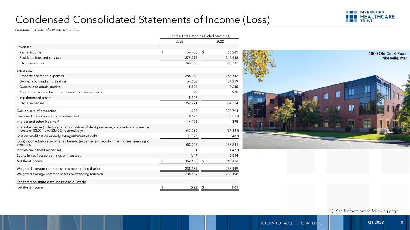 Q1 2023 8 For the Three Months Ended March 31, 2023 2022 Revenues: Rental income $ 66,438 $ 65,285 Residents fees and services 279,592 245,448 Total revenues 346,030 310,733 Expenses: Property operating expenses 286,080 268,742 Depreciation and amortization 64,800 57,259 General and administrative 5,873 7,285 Acquisition and certain other transaction related costs 93 928 Impairment of assets 5,925 — Total expenses 362,771 334,214 Gain on sale of properties 1,233 327,794 Gains and losses on equity securities, net 8,126 (8,553) Interest and other income (1) 4,195 395 Interest expense (including net amortization of debt premiums, discounts and issuance costs of $2,074 and $2,472, respectively) (47,780) (57,131) Loss on modification or early extinguishment of debt (1,075) (483) (Loss) income before income tax benefit (expense) and equity in net (losses) earnings of investees (52,042) 238,541 Income tax benefit (expense) 31 (1,472) Equity in net (losses) earnings of investees (647) 3,354 Net (loss) income $ (52,658) $ 240,423 Weighted average common shares outstanding (basic) 238,589 238,149 Weighted average common shares outstanding (diluted) 238,589 238,198 Per common share data (basic and diluted): Net (loss) income $ (0.22) $ 1.01 Condensed Consolidated Statements of Income (Loss) RETURN TO TABLE OF CONTENTS (1) See footnote on the following page. 4000 Old Court Road Pikesville, MD (amounts in thousands, except share data)