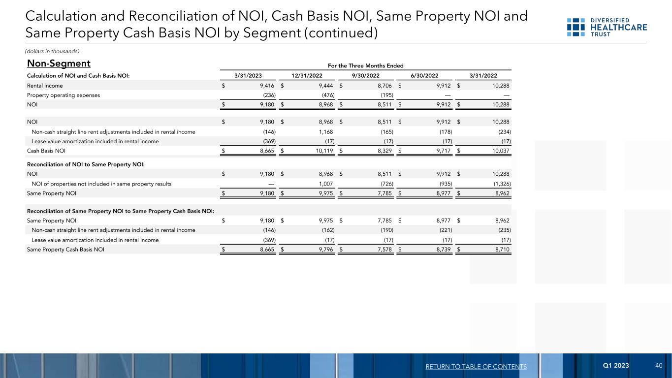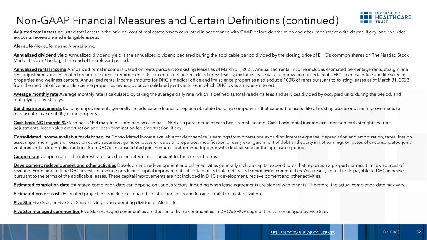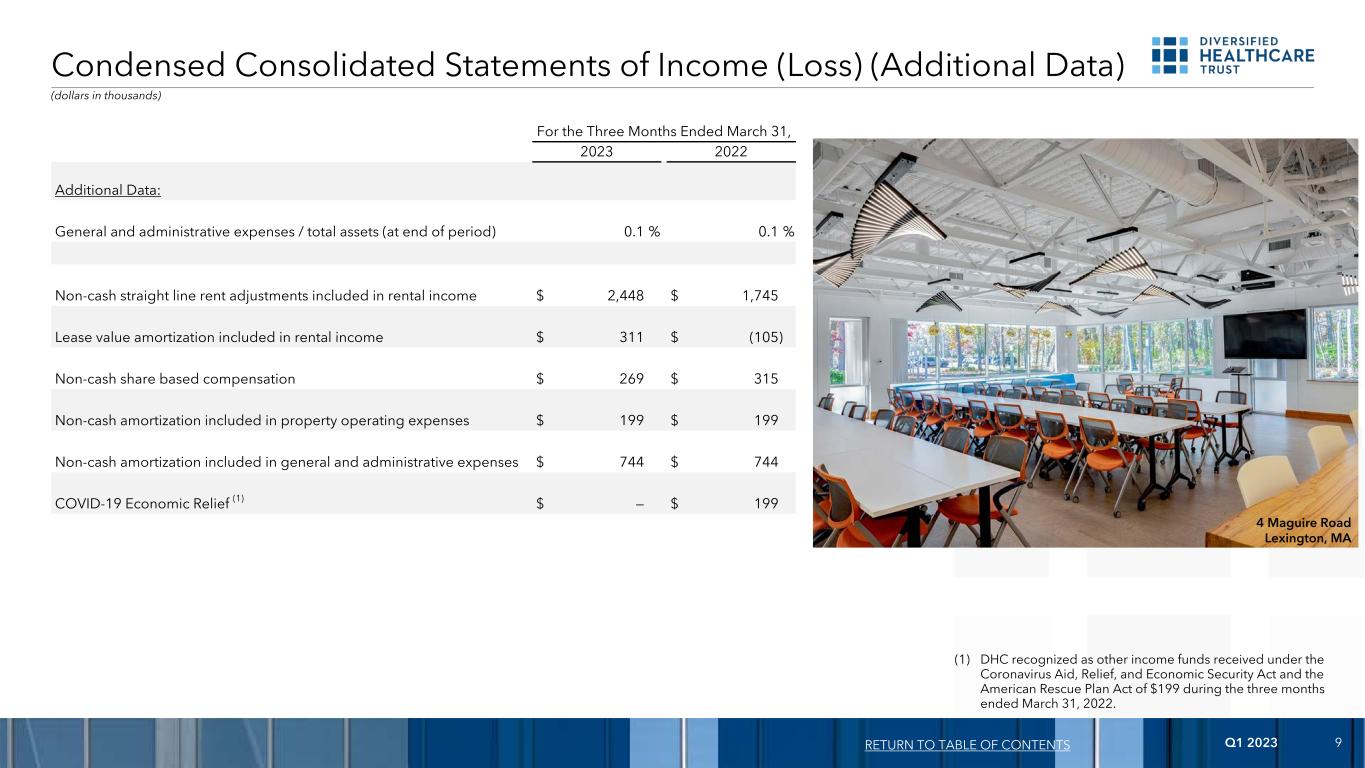 Q1 2023 9 For the Three Months Ended March 31, 2023 2022 Additional Data: General and administrative expenses / total assets (at end of period) 0.1 % 0.1 % Non-cash straight line rent adjustments included in rental income $ 2,448 $ 1,745 Lease value amortization included in rental income $ 311 $ (105) Non-cash share based compensation $ 269 $ 315 Non-cash amortization included in property operating expenses $ 199 $ 199 Non-cash amortization included in general and administrative expenses $ 744 $ 744 COVID-19 Economic Relief (1) $ — $ 199 Condensed Consolidated Statements of Income (Loss) (Additional Data) (dollars in thousands) RETURN TO TABLE OF CONTENTS (1) DHC recognized as other income funds received under the Coronavirus Aid, Relief, and Economic Security Act and the American Rescue Plan Act of $199 during the three months ended March 31, 2022. 4 Maguire Road Lexington, MA
