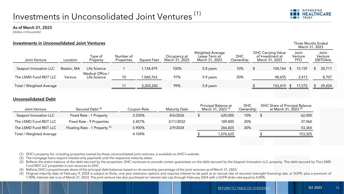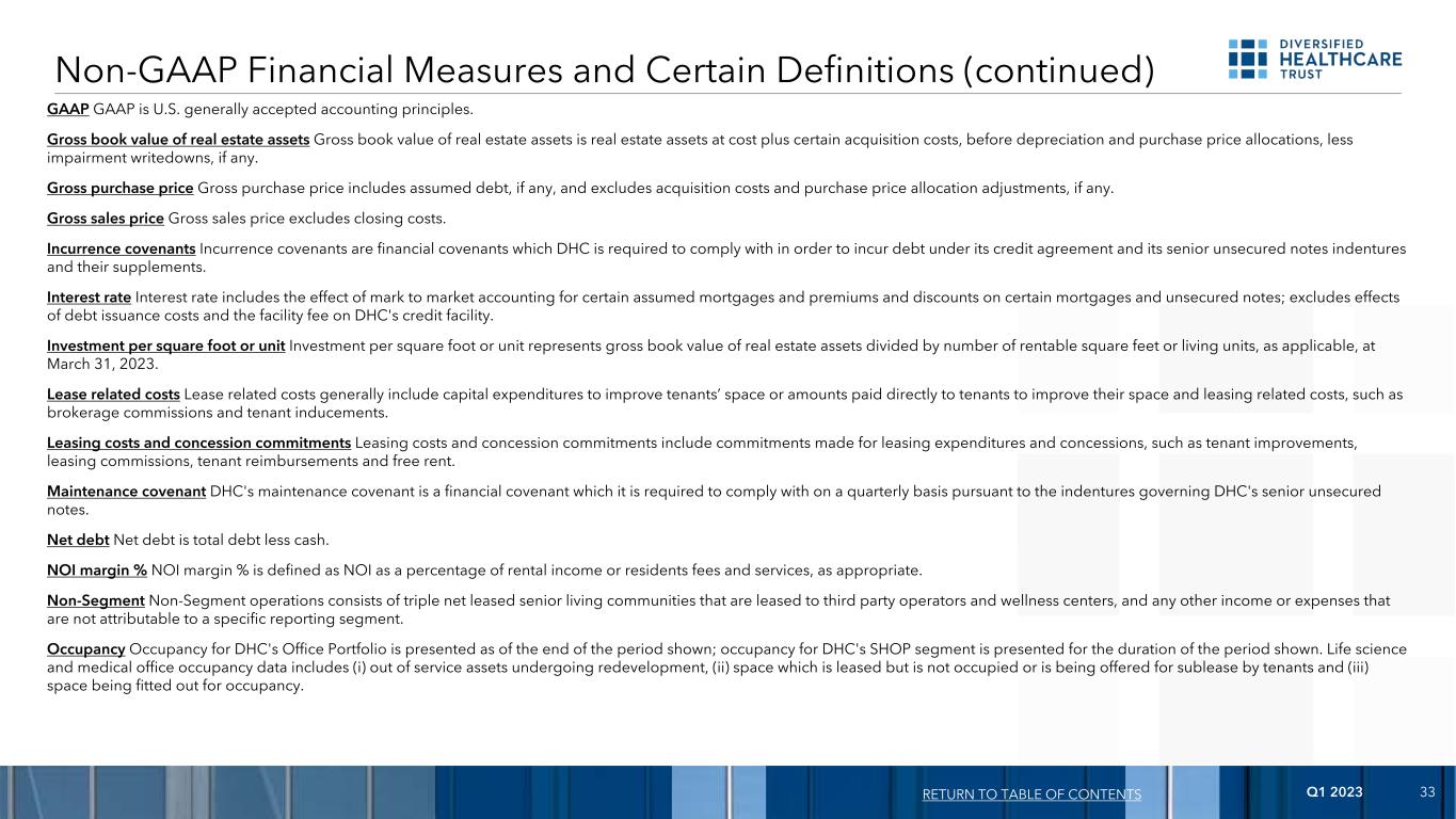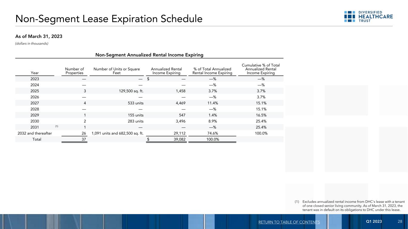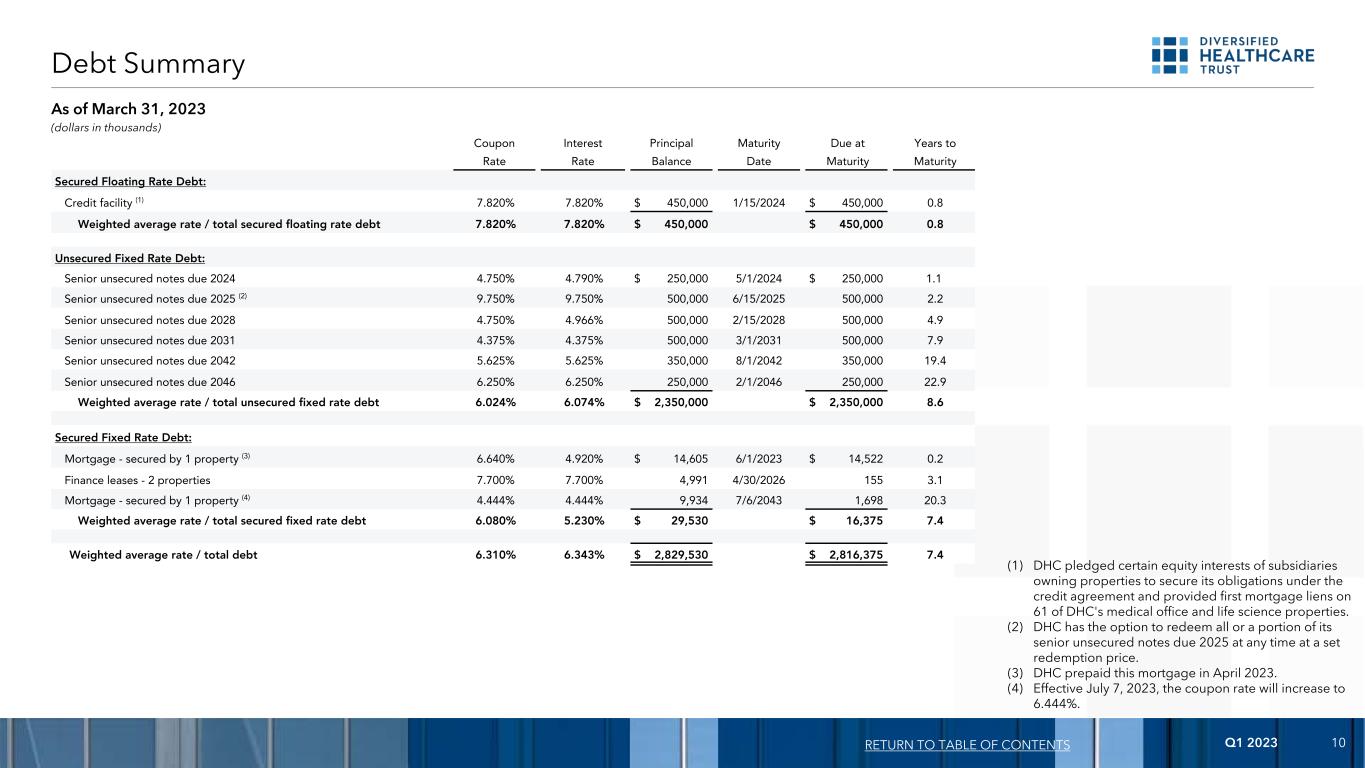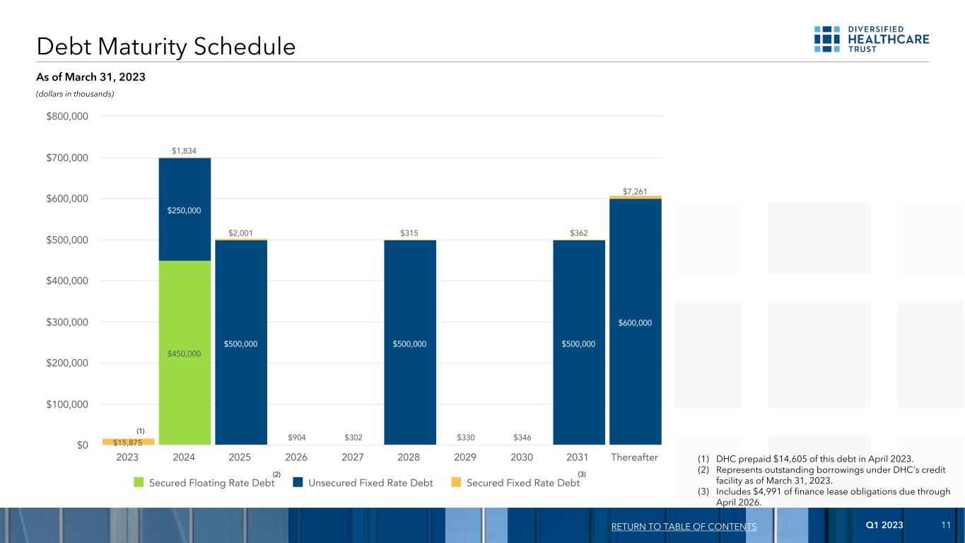 Q1 2023 10 Coupon Interest Principal Maturity Due at Years to Rate Rate Balance Date Maturity Maturity Secured Floating Rate Debt: Credit facility (1) 7.820% 7.820% $ 450,000 1/15/2024 $ 450,000 0.8 Weighted average rate / total secured floating rate debt 7.820% 7.820% $ 450,000 $ 450,000 0.8 Unsecured Fixed Rate Debt: Senior unsecured notes due 2024 4.750% 4.790% $ 250,000 5/1/2024 $ 250,000 1.1 Senior unsecured notes due 2025 (2) 9.750% 9.750% 500,000 6/15/2025 500,000 2.2 Senior unsecured notes due 2028 4.750% 4.966% 500,000 2/15/2028 500,000 4.9 Senior unsecured notes due 2031 4.375% 4.375% 500,000 3/1/2031 500,000 7.9 Senior unsecured notes due 2042 5.625% 5.625% 350,000 8/1/2042 350,000 19.4 Senior unsecured notes due 2046 6.250% 6.250% 250,000 2/1/2046 250,000 22.9 Weighted average rate / total unsecured fixed rate debt 6.024% 6.074% $ 2,350,000 $ 2,350,000 8.6 Secured Fixed Rate Debt: Mortgage - secured by 1 property (3) 6.640% 4.920% $ 14,605 6/1/2023 $ 14,522 0.2 Finance leases - 2 properties 7.700% 7.700% 4,991 4/30/2026 155 3.1 Mortgage - secured by 1 property (4) 4.444% 4.444% 9,934 7/6/2043 1,698 20.3 Weighted average rate / total secured fixed rate debt 6.080% 5.230% $ 29,530 $ 16,375 7.4 Weighted average rate / total debt 6.310% 6.343% $ 2,829,530 $ 2,816,375 7.4 Debt Summary (dollars in thousands) RETURN TO TABLE OF CONTENTS As of March 31, 2023 (1) DHC pledged certain equity interests of subsidiaries owning properties to secure its obligations under the credit agreement and provided first mortgage liens on 61 of DHC's medical office and life science properties. (2) DHC has the option to redeem all or a portion of its senior unsecured notes due 2025 at any time at a set redemption price. (3) DHC prepaid this mortgage in April 2023. (4) Effective July 7, 2023, the coupon rate will increase to 6.444%.