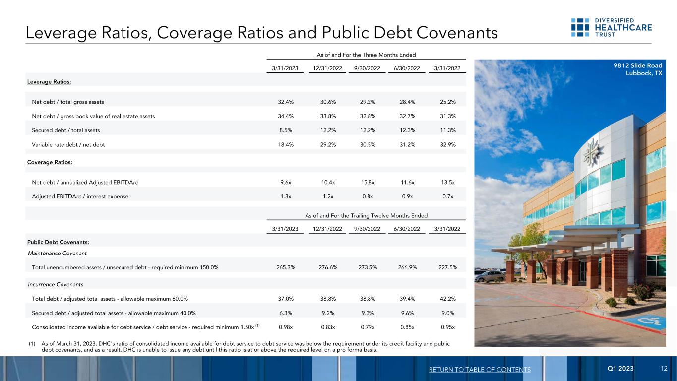 Q1 2023 12 Leverage Ratios, Coverage Ratios and Public Debt Covenants RETURN TO TABLE OF CONTENTS As of and For the Three Months Ended 3/31/2023 12/31/2022 9/30/2022 6/30/2022 3/31/2022 Leverage Ratios: Net debt / total gross assets 32.4% 30.6% 29.2% 28.4% 25.2% Net debt / gross book value of real estate assets 34.4% 33.8% 32.8% 32.7% 31.3% Secured debt / total assets 8.5% 12.2% 12.2% 12.3% 11.3% Variable rate debt / net debt 18.4% 29.2% 30.5% 31.2% 32.9% Coverage Ratios: Net debt / annualized Adjusted EBITDAre 9.6x 10.4x 15.8x 11.6x 13.5x Adjusted EBITDAre / interest expense 1.3x 1.2x 0.8x 0.9x 0.7x As of and For the Trailing Twelve Months Ended 3/31/2023 12/31/2022 9/30/2022 6/30/2022 3/31/2022 Public Debt Covenants: Maintenance Covenant Total unencumbered assets / unsecured debt - required minimum 150.0% 265.3% 276.6% 273.5% 266.9% 227.5% Incurrence Covenants Total debt / adjusted total assets - allowable maximum 60.0% 37.0% 38.8% 38.8% 39.4% 42.2% Secured debt / adjusted total assets - allowable maximum 40.0% 6.3% 9.2% 9.3% 9.6% 9.0% Consolidated income available for debt service / debt service - required minimum 1.50x (1) 0.98x 0.83x 0.79x 0.85x 0.95x (1) As of March 31, 2023, DHC's ratio of consolidated income available for debt service to debt service was below the requirement under its credit facility and public debt covenants, and as a result, DHC is unable to issue any debt until this ratio is at or above the required level on a pro forma basis. 9812 Slide Road Lubbock, TX