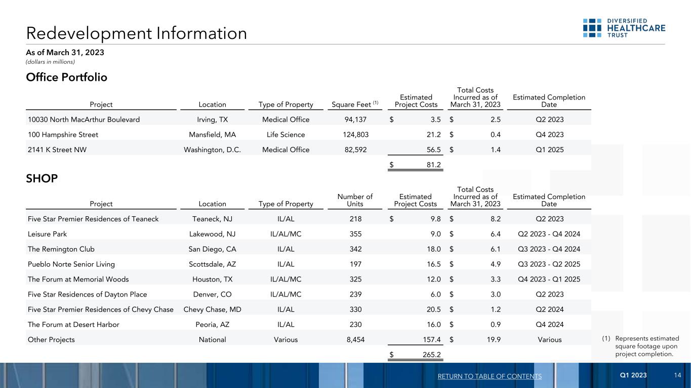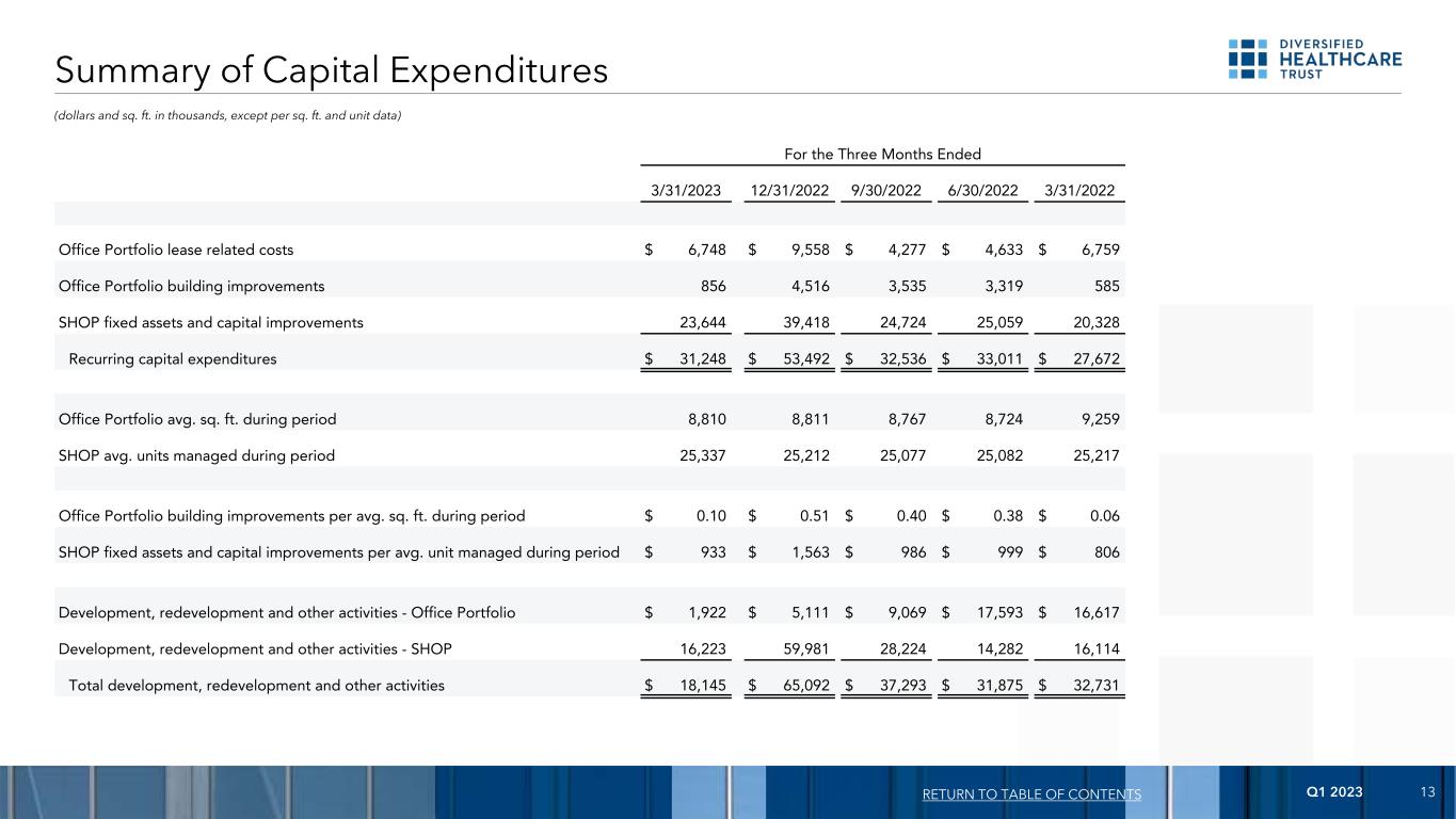 Q1 2023 13 (dollars and sq. ft. in thousands, except per sq. ft. and unit data) Summary of Capital Expenditures RETURN TO TABLE OF CONTENTS For the Three Months Ended 3/31/2023 12/31/2022 9/30/2022 6/30/2022 3/31/2022 Office Portfolio lease related costs $ 6,748 $ 9,558 $ 4,277 $ 4,633 $ 6,759 Office Portfolio building improvements 856 4,516 3,535 3,319 585 SHOP fixed assets and capital improvements 23,644 39,418 24,724 25,059 20,328 Recurring capital expenditures $ 31,248 $ 53,492 $ 32,536 $ 33,011 $ 27,672 Office Portfolio avg. sq. ft. during period 8,810 8,811 8,767 8,724 9,259 SHOP avg. units managed during period 25,337 25,212 25,077 25,082 25,217 Office Portfolio building improvements per avg. sq. ft. during period $ 0.10 $ 0.51 $ 0.40 $ 0.38 $ 0.06 SHOP fixed assets and capital improvements per avg. unit managed during period $ 933 $ 1,563 $ 986 $ 999 $ 806 Development, redevelopment and other activities - Office Portfolio $ 1,922 $ 5,111 $ 9,069 $ 17,593 $ 16,617 Development, redevelopment and other activities - SHOP 16,223 59,981 28,224 14,282 16,114 Total development, redevelopment and other activities $ 18,145 $ 65,092 $ 37,293 $ 31,875 $ 32,731