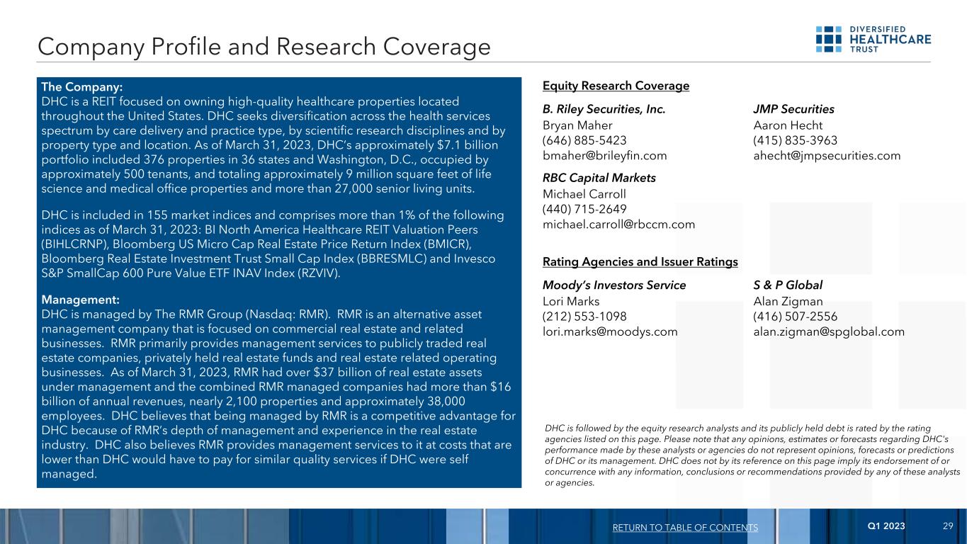 DHCは、米国全土に所在する高品質のヘルスケア物件を所有することに焦点を当てた不動産投資信託です。DHCは、医療サービスの提供形態や診療形態、科学的研究分野、不動産の種類や立地条件によって、医療サービス全般にわたる分散化を図っています。2023年3月31日現在、DHCのポートフォリオは約71億ドルで、36州とワシントンD.C.に376の物件を有し、約500のテナントが入居し、合計約900万平方フィートのライフサイエンスおよび医療オフィス物件と27000戸以上のシニアリビングを有しています。DHCは、2023年3月31日現在で370億ドル以上の運用資産を持ち、35年以上にわたって商業用不動産の売買、融資、運営に携わってきた機関投資家の経験を持つ米国の大手オルタナティブ資産運用会社、RMRグループ(Nasdaq:RMR)により運営されています。DHCは、マサチューセッツ州ニュートンに本社を構えています。詳細については、www.dhcreit.com。