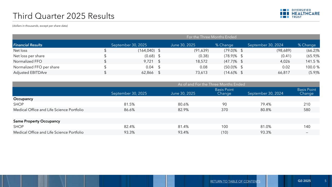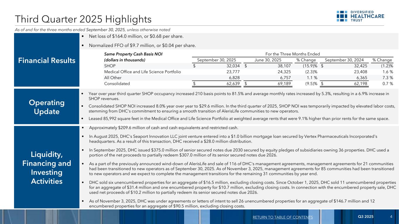 Q3 2025 4 Financial Results Third Quarter 2025 Highlights RETURN TO TABLE OF CONTENTS Operating Update Liquidity, Financing and Investing Activities • Net loss of $164.0 million, or $0.68 per share. • Normalized FFO of $9.7 million, or $0.04 per share. • Year over year third quarter SHOP occupancy increased 210 basis points to 81.5% and average monthly rates increased by 5.3%, resulting in a 6.9% increase in SHOP revenues. • Consolidated SHOP NOI increased 8.0% year over year to $29.6 million. In the third quarter of 2025, SHOP NOI was temporarily impacted by elevated labor costs, stemming from DHC's commitment to ensuring a smooth transition of AlerisLife communities to new operators. • Leased 85,992 square feet in the Medical Office and Life Science Portfolio at weighted average rents that were 9.1% higher than prior rents for the same space. • Approximately $209.6 million of cash and cash equivalents and restricted cash. • In August 2025, DHC's Seaport Innovation LLC joint venture entered into a $1.0 billion mortgage loan secured by Vertex Pharmaceuticals Incorporated's headquarters. As a result of this transaction, DHC received a $28.0 million distribution. • In September 2025, DHC issued $375.0 million of senior secured notes due 2030 secured by equity pledges of subsidiaries owning 36 properties. DHC used a portion of the net proceeds to partially redeem $307.0 million of its senior secured notes due 2026. • As a part of the previously announced wind-down of AlerisLife and sale of 116 of DHC's management agreements, management agreements for 21 communities had been transitioned to new operators as of September 30, 2025. As of November 3, 2025, management agreements for 85 communities had been transitioned to new operators and we expect to complete the management transitions for the remaining 31 communities by year end. • DHC sold six unencumbered properties for an aggregate of $16.5 million, excluding closing costs. Since October 1, 2025, DHC sold 11 unencumbered properties for an aggregate of $31.4 million and one encumbered property for $10.7 million, excluding closing costs. In connection with the encumbered property sale, DHC used net proceeds of $10.2 million to partially redeem its senior secured notes due 2026. • As of November 3, 2025, DHC was under agreements or letters of intent to sell 26 unencumbered properties for an aggregate of $146.7 million and 12 encumbered properties for an aggregate of $90.5 million, excluding closing costs. Same Property Cash Basis NOI For the Three Months Ended (dollars in thousands) September 30, 2025 June 30, 2025 % Change September 30, 2024 % Change SHOP $ 32,034 $ 38,107 (15.9) % $ 32,425 (1.2) % Medical Office and Life Science Portfolio 23,777 24,325 (2.3) % 23,408 1.6 % All Other 6,828 6,757 1.1 % 6,365 7.3 % Consolidated $ 62,639 $ 69,189 (9.5) % $ 62,198 0.7 % As of and for the three months ended September 30, 2025, unless otherwise noted