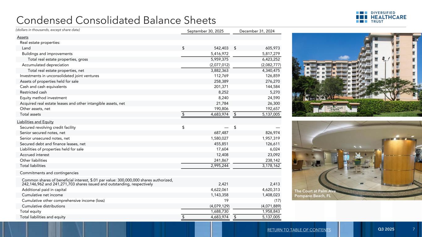 Q3 2025 6 Five Star Premier Residences of Pompano Beach Pompano Beach, FL Key Financial Data RETURN TO TABLE OF CONTENTS As of and For the Three Months Ended 9/30/2025 6/30/2025 3/31/2025 12/31/2024 9/30/2024 Selected Balance Sheet Data: Total gross assets $ 6,760,986 $ 6,886,404 $ 7,108,119 $ 7,219,782 $ 7,395,888 Total assets $ 4,683,974 $ 4,756,441 $ 4,995,843 $ 5,137,005 $ 5,285,196 Total liabilities $ 2,995,244 $ 2,901,468 $ 3,047,792 $ 3,178,162 $ 3,236,792 Total equity $ 1,688,730 $ 1,854,973 $ 1,948,051 $ 1,958,843 $ 2,048,404 Selected Income Statement Data: Total revenues $ 388,706 $ 382,712 $ 386,864 $ 379,619 $ 373,640 Net loss $ (164,040) $ (91,639) $ (8,986) $ (87,446) $ (98,689) NOI $ 63,319 $ 70,132 $ 72,538 $ 64,443 $ 63,943 Adjusted EBITDAre $ 62,866 $ 73,613 $ 75,109 $ 67,049 $ 66,817 FFO $ (5,886) $ 13,577 $ (10,006) $ 11,805 $ (3,366) Normalized FFO $ 9,721 $ 18,572 $ 14,305 $ 5,290 $ 4,026 CAD $ 17,218 $ 5,167 $ 25,985 $ (16,875) $ (12,807) Rolling four quarter CAD $ 31,495 $ 1,470 $ (9,463) $ (33,037) $ (61,168) Per Share Data (basic and diluted): Net loss $ (0.68) $ (0.38) $ (0.04) $ (0.36) $ (0.41) FFO $ (0.02) $ 0.06 $ (0.04) $ 0.05 $ (0.01) Normalized FFO $ 0.04 $ 0.08 $ 0.06 $ 0.02 $ 0.02 CAD $ 0.07 $ 0.02 $ 0.11 $ (0.07) $ (0.05) Rolling four quarter CAD $ 0.13 $ 0.01 $ (0.03) $ (0.13) $ (0.25) Dividends: Annualized dividend declared per common share $ 0.04 $ 0.04 $ 0.04 $ 0.04 $ 0.04 Annualized dividend yield (at end of period) 0.9 % 1.1 % 1.7 % 1.7 % 1.0 % Normalized FFO payout ratio 25.0 % 12.5 % 16.7 % 50.0 % 50.0 % CAD payout ratio 14.3 % 50.0 % 9.1 % (14.3) % (20.0) % Rolling four quarter CAD payout ratio 30.8 % 400.0 % (133.3) % (30.8) % (16.0) % (dollars in thousands, except per share data)