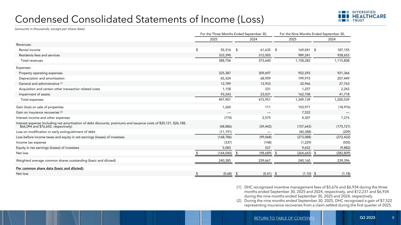 Q3 2025 8 For the Three Months Ended September 30, For the Nine Months Ended September 30, 2025 2024 2025 2024 Revenues: Rental income $ 55,316 $ 61,635 $ 169,041 $ 187,155 Residents fees and services 333,390 312,005 989,241 928,653 Total revenues 388,706 373,640 1,158,282 1,115,808 Expenses: Property operating expenses 325,387 309,697 952,293 921,366 Depreciation and amortization 65,324 68,959 199,915 207,449 General and administrative (1) 12,789 13,933 32,966 27,763 Acquisition and certain other transaction related costs 1,158 331 1,257 2,243 Impairment of assets 93,243 23,031 162,708 41,718 Total expenses 497,901 415,951 1,349,139 1,200,539 Gain (loss) on sale of properties 1,260 111 103,971 (18,976) Gain on insurance recoveries (2) — — 7,522 — Interest income and other expenses (774) 2,575 4,307 7,215 Interest expense (including net amortization of debt discounts, premiums and issuance costs of $20,121, $26,188, $66,094 and $76,642, respectively) (48,886) (59,443) (157,643) (175,721) Loss on modification or early extinguishment of debt (11,191) — (40,388) (209) Loss before income taxes and equity in net earnings (losses) of investees (168,786) (99,068) (273,088) (272,422) Income tax expense (337) (148) (1,229) (505) Equity in net earnings (losses) of investees 5,083 527 9,652 (9,882) Net loss $ (164,040) $ (98,689) $ (264,665) $ (282,809) Weighted average common shares outstanding (basic and diluted) 240,385 239,667 240,160 239,396 Per common share data (basic and diluted): Net loss $ (0.68) $ (0.41) $ (1.10) $ (1.18) Condensed Consolidated Statements of Income (Loss) RETURN TO TABLE OF CONTENTS (amounts in thousands, except per share data) (1) DHC recognized incentive management fees of $5,676 and $6,934 during the three months ended September 30, 2025 and 2024, respectively, and $12,231 and $6,934 during the nine months ended September 30, 2025 and 2024, respectively. (2) During the nine months ended September 30, 2025, DHC recognized a gain of $7,522 representing insurance recoveries from a claim settled during the first quarter of 2025.