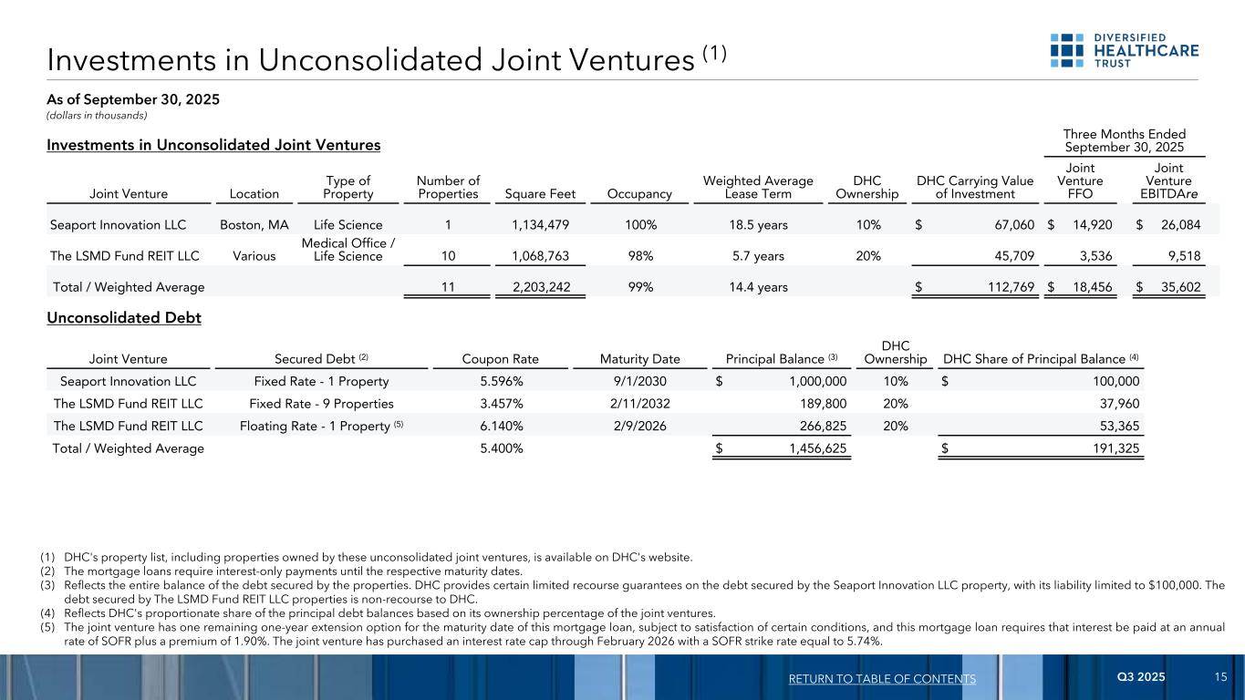 Q3 2025 14 Property Dispositions Information Since January 1, 2025 Dispositions: Date Sold Location Segment Number of Properties Gross Sales Price Gross Sales Price Per Square Foot or Unit (1) Occupancy (2) 1/21/2025 Wilmington, DE SHOP 1 $ 2,900 $ 28,431 0.0 % 1/31/2025 San Diego, CA Medical Office and Life Science Portfolio (3) 3 159,025 $ 855.07 49.2 % 2/24/2025 Tempe, AZ Medical Office and Life Science Portfolio 1 16,800 $ 204.22 0.0 % 2/27/2025 Various All Other (3) 18 135,000 $ 154,110 100.0 % 3/3/2025 Cromwell, CT Medical Office and Life Science Portfolio (3) 1 7,100 $ 109.57 100.0 % 5/2/2025 Nashville, TN SHOP 1 11,150 $ 92,917 0.0 % 5/16/2025 St. Louis, MO Medical Office and Life Science Portfolio 1 5,250 $ 23.90 0.0 % 7/7/2025 Glendale, WI Medical Office and Life Science Portfolio 1 500 $ 41.77 0.0 % 7/22/2025 Maryland Heights, MO Medical Office and Life Science Portfolio 1 4,300 $ 18.49 0.0 % 7/25/2025 Cherry Hill, NJ All Other 1 4,000 $ 41,237 0.0 % 8/6/2025 Pittsburgh, PA Medical Office and Life Science Portfolio 1 1,800 $ 13.64 23.0 % 9/2/2025 Macon, GA SHOP 1 1,600 $ 40,000 94.7 % 9/15/2025 Silver Spring, MD Medical Office and Life Science Portfolio 1 4,250 $ 46.11 0.0 % 10/1/2025 Various SHOP 3 15,430 $ 66,509 73.7 % 10/6/2025 Various SHOP 2 3,500 $ 35,354 65.5 % 10/7/2025 Mansfield, MA Medical Office and Life Science Portfolio (4) 1 10,700 $ 85.74 0.0 % 10/31/2025 Various - IN SHOP 2 2,500 $ 25,773 58.6 % 11/3/2025 Various - SC SHOP 2 4,375 $ 48,077 91.5 % 11/3/2025 Various - GA SHOP 2 5,625 $ 55,147 89.2 % Total Dispositions 44 $ 395,805 RETURN TO TABLE OF CONTENTS (dollars in thousands, except gross sales price per square foot or unit) (1) Represents gross sales price per square foot for the Medical Office and Life Science Portfolio and gross sales price per unit for the SHOP segment and All Other properties. (2) Occupancy is presented as of the month end prior to the date of sale for the Medical Office and Life Science Portfolio and All Other properties and for the one month ended prior to the date of sale for the SHOP segment. (3) DHC used aggregate net proceeds of $299,158 from the sales of these properties to partially redeem its senior secured notes due 2026. (4) DHC used net proceeds of $10,249 from the sale of this property to partially redeem its senior secured notes due 2026. (5) The net proceeds from the sale of 12 of these properties are required to be used to partially redeem DHC's senior secured notes due 2026. DHC expects to sell these properties during the fourth quarter of 2025 for an aggregate sales price of $90,529, excluding closing costs. Under Agreement or Letter of Intent as of November 3, 2025: Segment Number of Properties Estimated Gross Sales Price Gross Sales Price Per Square Foot or Unit (1) Occupancy (2) Medical Office and Life Science Portfolio (5) 20 $ 154,909 $ 124.07 75.6 % SHOP 18 82,310 $ 61,841 82.6 % Total Under Agreement or Letter of Intent 38 $ 237,219