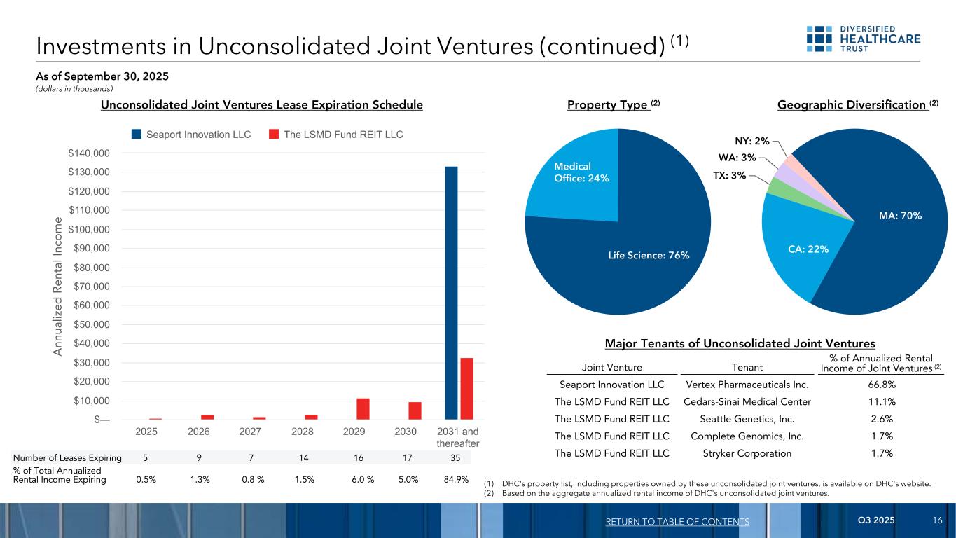 Q3 2025 15 Investments in Unconsolidated Joint Ventures (1) (dollars in thousands) RETURN TO TABLE OF CONTENTS As of September 30, 2025 Three Months Ended September 30, 2025 Joint Venture Location Type of Property Number of Properties Square Feet Occupancy Weighted Average Lease Term DHC Ownership DHC Carrying Value of Investment Joint Venture FFO Joint Venture EBITDAre Seaport Innovation LLC Boston, MA Life Science 1 1,134,479 100% 18.5 years 10% $ 67,060 $ 14,920 $ 26,084 The LSMD Fund REIT LLC Various Medical Office / Life Science 10 1,068,763 98% 5.7 years 20% 45,709 3,536 9,518 Total / Weighted Average 11 2,203,242 99% 14.4 years $ 112,769 $ 18,456 $ 35,602 Investments in Unconsolidated Joint Ventures Unconsolidated Debt Joint Venture Secured Debt (2) Coupon Rate Maturity Date Principal Balance (3) DHC Ownership DHC Share of Principal Balance (4) Seaport Innovation LLC Fixed Rate - 1 Property 5.596% 9/1/2030 $ 1,000,000 10% $ 100,000 The LSMD Fund REIT LLC Fixed Rate - 9 Properties 3.457% 2/11/2032 189,800 20% 37,960 The LSMD Fund REIT LLC Floating Rate - 1 Property (5) 6.140% 2/9/2026 266,825 20% 53,365 Total / Weighted Average 5.400% $ 1,456,625 $ 191,325 (1) DHC's property list, including properties owned by these unconsolidated joint ventures, is available on DHC's website. (2) The mortgage loans require interest-only payments until the respective maturity dates. (3) Reflects the entire balance of the debt secured by the properties. DHC provides certain limited recourse guarantees on the debt secured by the Seaport Innovation LLC property, with its liability limited to $100,000. The debt secured by The LSMD Fund REIT LLC properties is non-recourse to DHC. (4) Reflects DHC's proportionate share of the principal debt balances based on its ownership percentage of the joint ventures. (5) The joint venture has one remaining one-year extension option for the maturity date of this mortgage loan, subject to satisfaction of certain conditions, and this mortgage loan requires that interest be paid at an annual rate of SOFR plus a premium of 1.90%. The joint venture has purchased an interest rate cap through February 2026 with a SOFR strike rate equal to 5.74%.