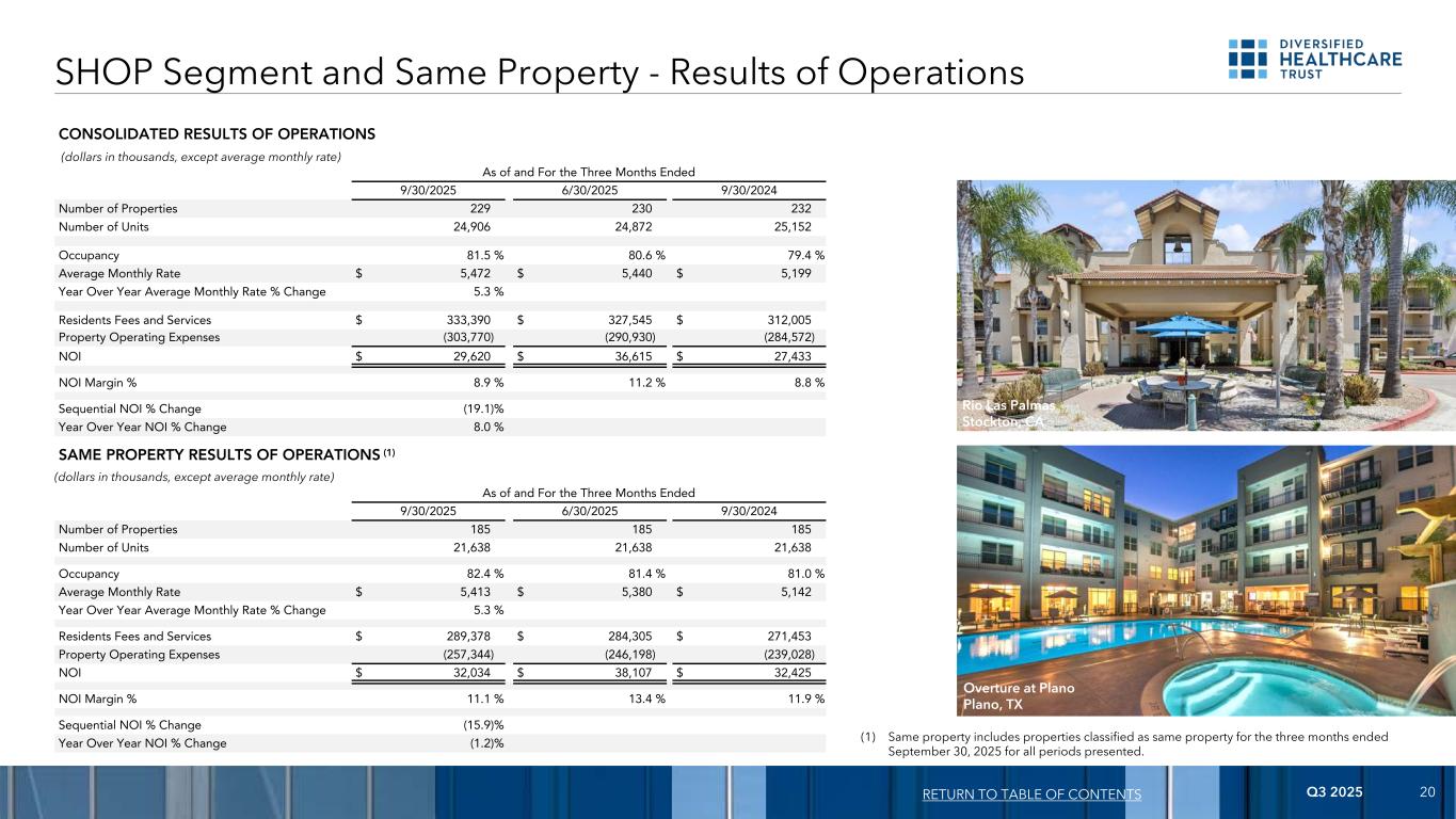Q3 2025 21RETURN TO TABLE OF CONTENTS As of and For the Three Months Ended September 30, 2025 Five Star Managed Communities - To Be Transitioned Communities Transitioned from Five Star to Other Operators in 2025 Other Operator Managed Communities Total SHOP Segment Number of Properties 97 21 111 229 Number of Units 14,609 2,722 7,575 24,906 Occupancy 80.9 % 86.3 % 80.9 % 81.5 % Average Monthly Rate $ 5,101 $ 4,739 $ 6,464 $ 5,472 Average Monthly Rate % Change 5.0 % 6.9 % 5.2 % 5.3 % Residents Fees and Services $ 180,903 $ 33,329 $ 119,158 $ 333,390 Property Operating Expenses (164,129) (27,670) (111,971) (303,770) NOI $ 16,774 $ 5,659 $ 7,187 $ 29,620 NOI Margin % 9.3 % 17.0 % 6.0 % 8.9 % NOI % Change 4.1 % (22.4) % 78.6 % 8.0 % As of and for the Three Months Ended September 30, 2024 Five Star Managed Communities - To Be Transitioned Communities Transitioned from Five Star to Other Operators in 2025 Other Operator Managed Communities Total SHOP Segment Number of Properties 97 21 114 232 Number of Units 14,764 2,722 7,666 25,152 Occupancy 78.6 % 85.2 % 79.0 % 79.4 % Average Monthly Rate $ 4,860 $ 4,432 $ 6,145 $ 5,199 Residents Fees and Services $ 169,615 $ 30,775 $ 111,615 $ 312,005 Property Operating Expenses (153,498) (23,482) (107,592) (284,572) NOI $ 16,117 $ 7,293 $ 4,023 $ 27,433 NOI Margin % 9.5 % 23.7 % 3.6 % 8.8 % SHOP Segment - Five Star and Other Operator Managed Communities Results of Operations CONSOLIDATED RESULTS OF OPERATIONS (dollars in thousands, except average monthly rate)