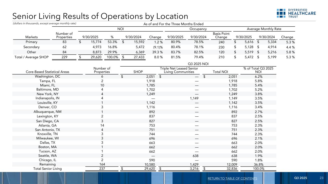 Q3 2025 23 Senior Living Results of Operations by Location RETURN TO TABLE OF CONTENTS Q3 2025 NOI Core-Based Statistical Areas Number of Properties SHOP Triple Net Leased Senior Living Communities Total NOI % of Total Q3 2025 NOI Washington, DC 6 $ 2,051 $ — $ 2,051 6.2% Tampa, FL 2 1,918 — 1,918 5.8% Miami, FL 10 1,785 — 1,785 5.4% Baltimore, MD 4 1,702 — 1,702 5.2% New York, NY 4 1,249 — 1,249 3.8% Indianapolis, IN 4 — 1,149 1,149 3.5% Louisville, KY 1 1,142 — 1,142 3.5% Denver, CO 3 1,116 — 1,116 3.4% Albuquerque, NM 1 892 — 892 2.7% Lexington, KY 2 837 — 837 2.5% San Diego, CA 3 827 — 827 2.5% Atlanta, GA 14 753 — 753 2.3% San Antonio, TX 4 751 — 751 2.3% Knoxville, TN 3 744 — 744 2.3% Milwaukee, WI 3 696 — 696 2.1% Dallas, TX 3 663 — 663 2.0% Boston, MA 1 662 — 662 2.0% Tucson, AZ 1 662 — 662 2.0% Seattle, WA 2 — 638 638 1.9% Chicago, IL 2 590 — 590 1.8% Remaining 164 10,580 1,429 12,009 36.8% Total Senior Living 237 $ 29,620 $ 3,216 $ 32,836 100.0% As of and For the Three Months Ended NOI Occupancy Average Monthly Rate Markets Number of Properties 9/30/2025 % 9/30/2024 Change 9/30/2025 9/30/2024 Basis Point Change 9/30/2025 9/30/2024 Change Primary 83 $ 15,774 53.3% $ 15,592 1.2 % 80.9% 78.5% 240 $ 5,616 $ 5,334 5.3 % Secondary 62 4,973 16.8% 5,472 (9.1) % 80.4% 78.1% 230 $ 5,128 $ 4,914 4.4 % Other 84 8,873 29.9% 6,369 39.3 % 83.7% 82.5% 120 $ 5,519 $ 5,216 5.8 % Total / Average SHOP 229 $ 29,620 100.0% $ 27,433 8.0 % 81.5% 79.4% 210 $ 5,472 $ 5,199 5.3 % (dollars in thousands, except average monthly rate)