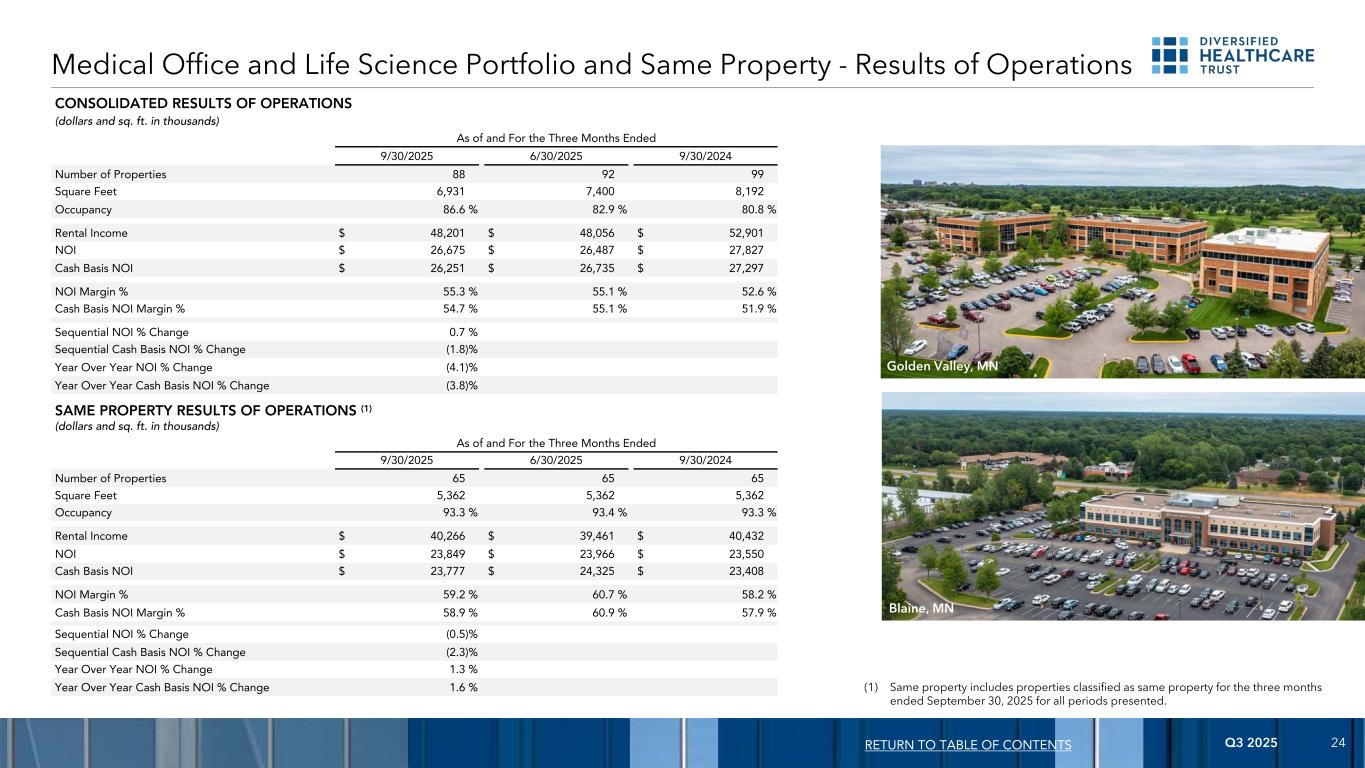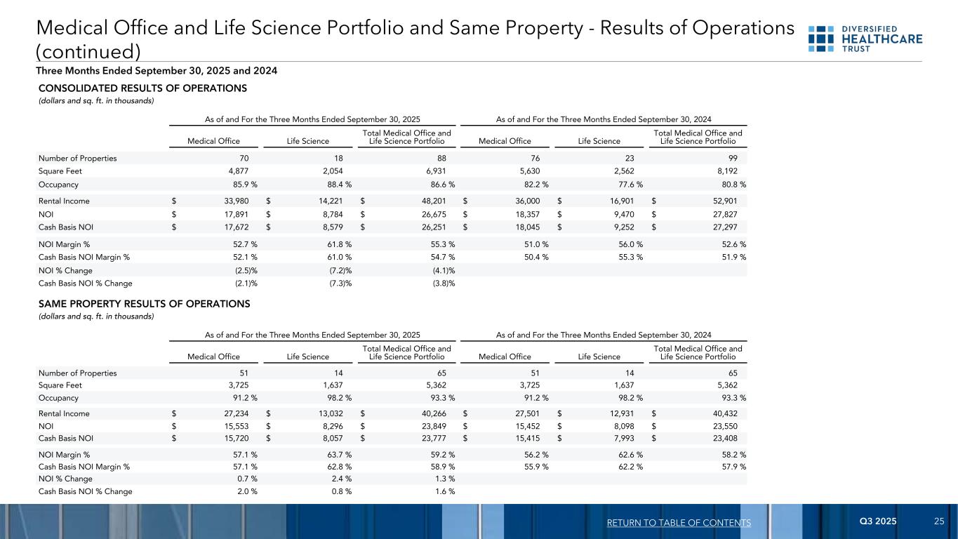 Q3 2025 24 (1) Same property includes properties classified as same property for the three months ended September 30, 2025 for all periods presented. RETURN TO TABLE OF CONTENTS CONSOLIDATED RESULTS OF OPERATIONS (dollars and sq. ft. in thousands) As of and For the Three Months Ended 9/30/2025 6/30/2025 9/30/2024 Number of Properties 88 92 99 Square Feet 6,931 7,400 8,192 Occupancy 86.6 % 82.9 % 80.8 % Rental Income $ 48,201 $ 48,056 $ 52,901 NOI $ 26,675 $ 26,487 $ 27,827 Cash Basis NOI $ 26,251 $ 26,735 $ 27,297 NOI Margin % 55.3 % 55.1 % 52.6 % Cash Basis NOI Margin % 54.7 % 55.1 % 51.9 % Sequential NOI % Change 0.7 % Sequential Cash Basis NOI % Change (1.8) % Year Over Year NOI % Change (4.1) % Year Over Year Cash Basis NOI % Change (3.8) % SAME PROPERTY RESULTS OF OPERATIONS (1) (dollars and sq. ft. in thousands) As of and For the Three Months Ended 9/30/2025 6/30/2025 9/30/2024 Number of Properties 65 65 65 Square Feet 5,362 5,362 5,362 Occupancy 93.3 % 93.4 % 93.3 % Rental Income $ 40,266 $ 39,461 $ 40,432 NOI $ 23,849 $ 23,966 $ 23,550 Cash Basis NOI $ 23,777 $ 24,325 $ 23,408 NOI Margin % 59.2 % 60.7 % 58.2 % Cash Basis NOI Margin % 58.9 % 60.9 % 57.9 % Sequential NOI % Change (0.5) % Sequential Cash Basis NOI % Change (2.3) % Year Over Year NOI % Change 1.3 % Year Over Year Cash Basis NOI % Change 1.6 % Medical Office and Life Science Portfolio and Same Property - Results of Operations Valencia, CA Golden Valley, MN Blaine, MN