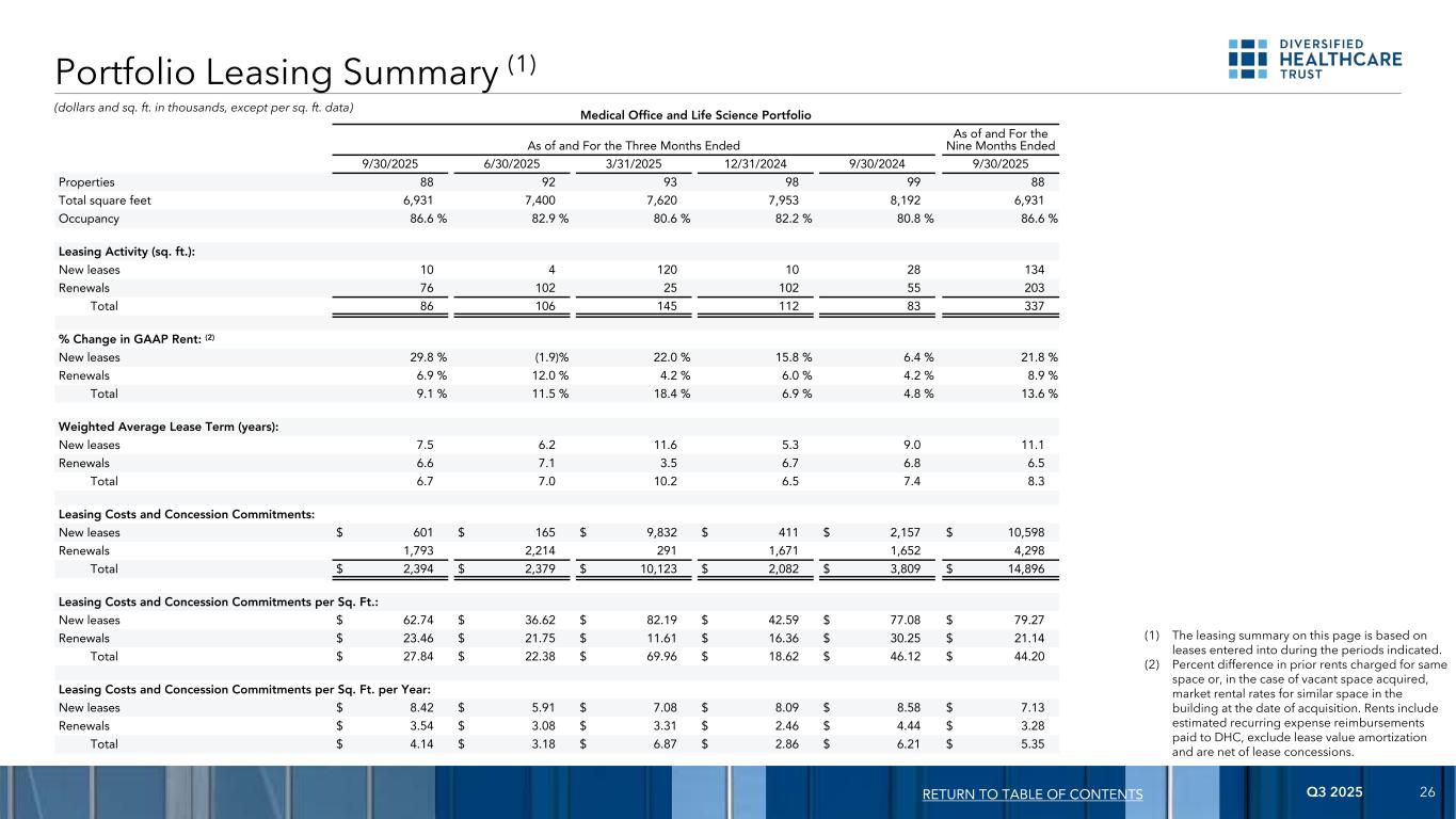 Q3 2025 25RETURN TO TABLE OF CONTENTS CONSOLIDATED RESULTS OF OPERATIONS (dollars and sq. ft. in thousands) As of and For the Three Months Ended September 30, 2025 As of and For the Three Months Ended September 30, 2024 Medical Office Life Science Total Medical Office and Life Science Portfolio Medical Office Life Science Total Medical Office and Life Science Portfolio Number of Properties 70 18 88 76 23 99 Square Feet 4,877 2,054 6,931 5,630 2,562 8,192 Occupancy 85.9 % 88.4 % 86.6 % 82.2 % 77.6 % 80.8 % Rental Income $ 33,980 $ 14,221 $ 48,201 $ 36,000 $ 16,901 $ 52,901 NOI $ 17,891 $ 8,784 $ 26,675 $ 18,357 $ 9,470 $ 27,827 Cash Basis NOI $ 17,672 $ 8,579 $ 26,251 $ 18,045 $ 9,252 $ 27,297 NOI Margin % 52.7 % 61.8 % 55.3 % 51.0 % 56.0 % 52.6 % Cash Basis NOI Margin % 52.1 % 61.0 % 54.7 % 50.4 % 55.3 % 51.9 % NOI % Change (2.5) % (7.2) % (4.1) % Cash Basis NOI % Change (2.1) % (7.3) % (3.8) % SAME PROPERTY RESULTS OF OPERATIONS (dollars and sq. ft. in thousands) As of and For the Three Months Ended September 30, 2025 As of and For the Three Months Ended September 30, 2024 Medical Office Life Science Total Medical Office and Life Science Portfolio Medical Office Life Science Total Medical Office and Life Science Portfolio Number of Properties 51 14 65 51 14 65 Square Feet 3,725 1,637 5,362 3,725 1,637 5,362 Occupancy 91.2 % 98.2 % 93.3 % 91.2 % 98.2 % 93.3 % Rental Income $ 27,234 $ 13,032 $ 40,266 $ 27,501 $ 12,931 $ 40,432 NOI $ 15,553 $ 8,296 $ 23,849 $ 15,452 $ 8,098 $ 23,550 Cash Basis NOI $ 15,720 $ 8,057 $ 23,777 $ 15,415 $ 7,993 $ 23,408 NOI Margin % 57.1 % 63.7 % 59.2 % 56.2 % 62.6 % 58.2 % Cash Basis NOI Margin % 57.1 % 62.8 % 58.9 % 55.9 % 62.2 % 57.9 % NOI % Change 0.7 % 2.4 % 1.3 % Cash Basis NOI % Change 2.0 % 0.8 % 1.6 % Medical Office and Life Science Portfolio and Same Property - Results of Operations (continued) Three Months Ended September 30, 2025 and 2024