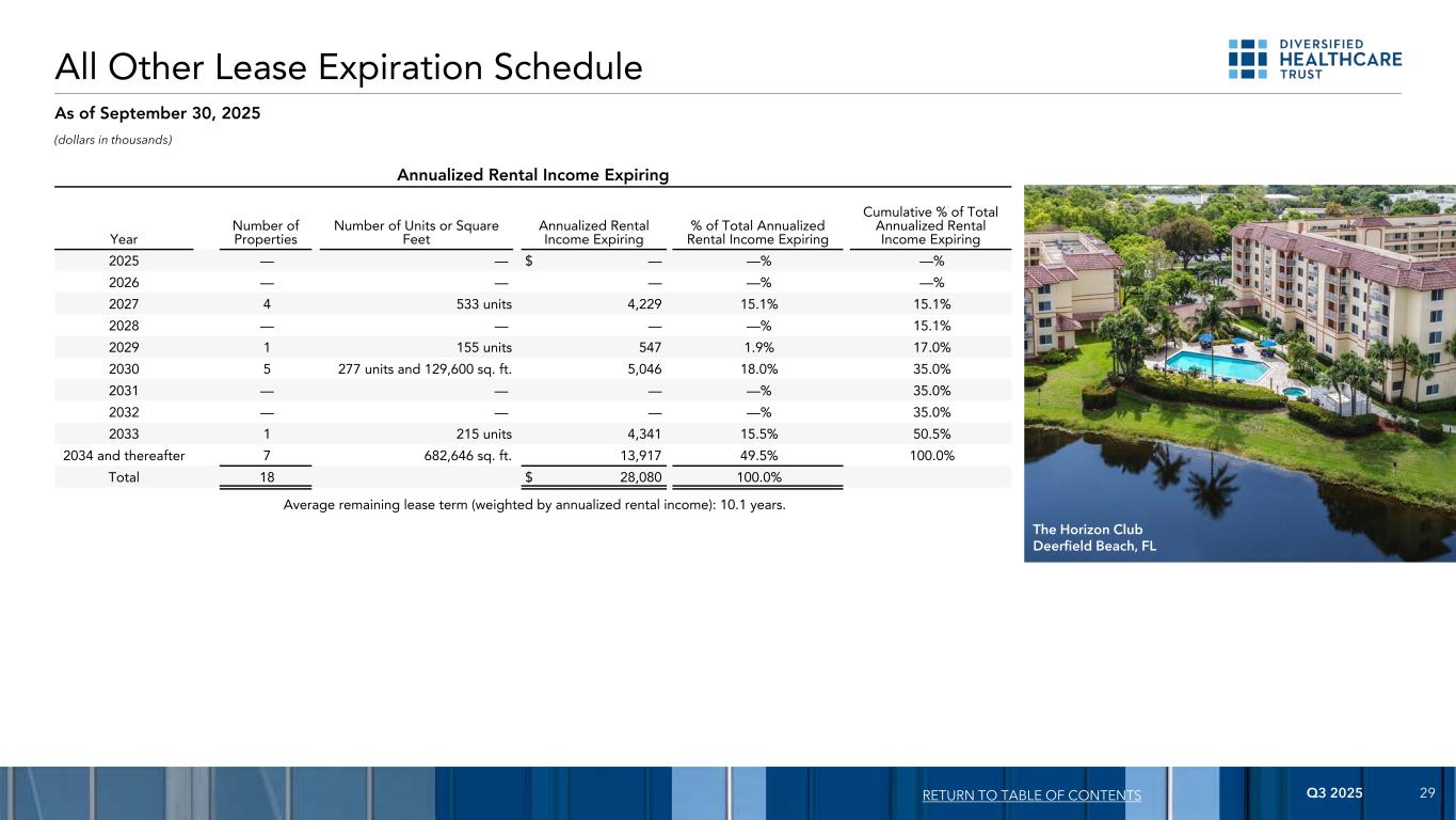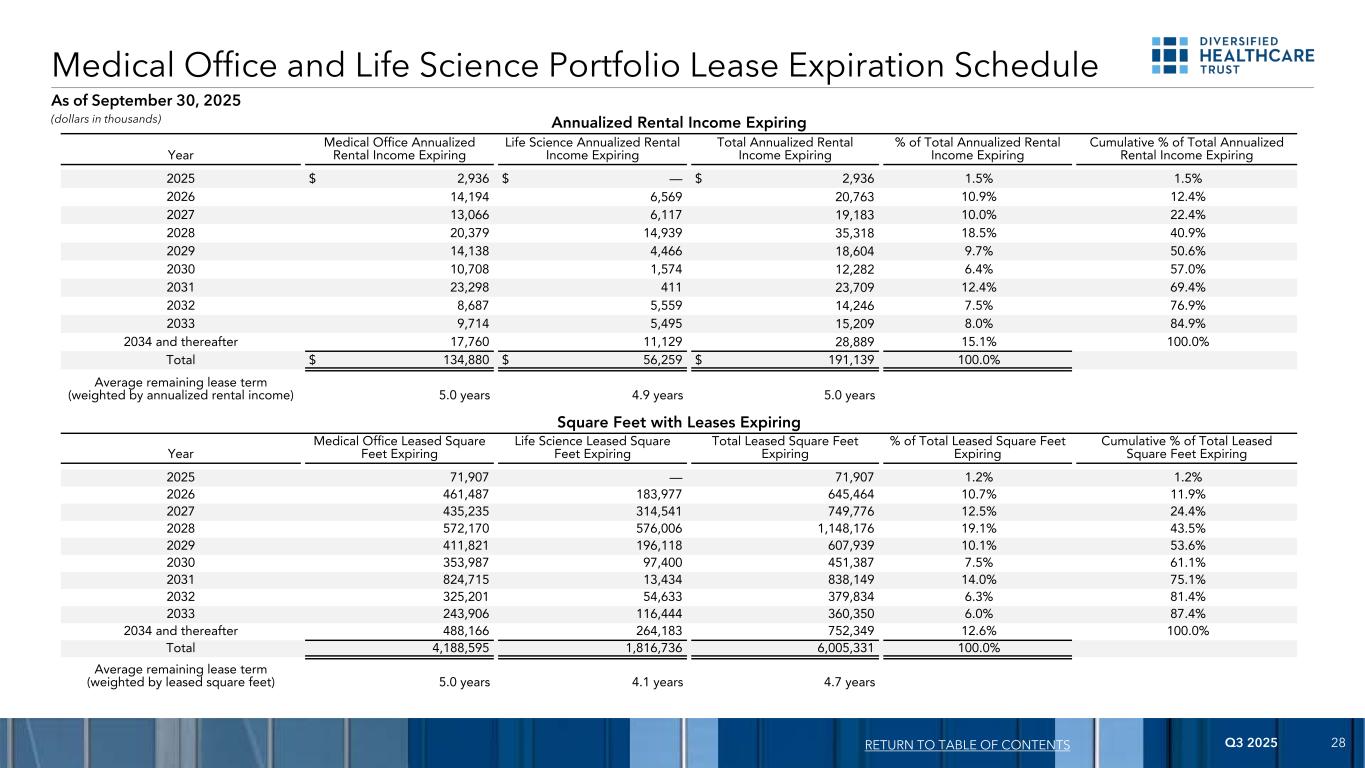 Q3 2025 28 Medical Office and Life Science Portfolio Lease Expiration Schedule RETURN TO TABLE OF CONTENTS (dollars in thousands) As of September 30, 2025 Annualized Rental Income Expiring Year Medical Office Annualized Rental Income Expiring Life Science Annualized Rental Income Expiring Total Annualized Rental Income Expiring % of Total Annualized Rental Income Expiring Cumulative % of Total Annualized Rental Income Expiring 2025 $ 2,936 $ — $ 2,936 1.5% 1.5% 2026 14,194 6,569 20,763 10.9% 12.4% 2027 13,066 6,117 19,183 10.0% 22.4% 2028 20,379 14,939 35,318 18.5% 40.9% 2029 14,138 4,466 18,604 9.7% 50.6% 2030 10,708 1,574 12,282 6.4% 57.0% 2031 23,298 411 23,709 12.4% 69.4% 2032 8,687 5,559 14,246 7.5% 76.9% 2033 9,714 5,495 15,209 8.0% 84.9% 2034 and thereafter 17,760 11,129 28,889 15.1% 100.0% Total $ 134,880 $ 56,259 $ 191,139 100.0% Average remaining lease term (weighted by annualized rental income) 5.0 years 4.9 years 5.0 years Square Feet with Leases Expiring Year Medical Office Leased Square Feet Expiring Life Science Leased Square Feet Expiring Total Leased Square Feet Expiring % of Total Leased Square Feet Expiring Cumulative % of Total Leased Square Feet Expiring 2025 71,907 — 71,907 1.2% 1.2% 2026 461,487 183,977 645,464 10.7% 11.9% 2027 435,235 314,541 749,776 12.5% 24.4% 2028 572,170 576,006 1,148,176 19.1% 43.5% 2029 411,821 196,118 607,939 10.1% 53.6% 2030 353,987 97,400 451,387 7.5% 61.1% 2031 824,715 13,434 838,149 14.0% 75.1% 2032 325,201 54,633 379,834 6.3% 81.4% 2033 243,906 116,444 360,350 6.0% 87.4% 2034 and thereafter 488,166 264,183 752,349 12.6% 100.0% Total 4,188,595 1,816,736 6,005,331 100.0% Average remaining lease term (weighted by leased square feet) 5.0 years 4.1 years 4.7 years