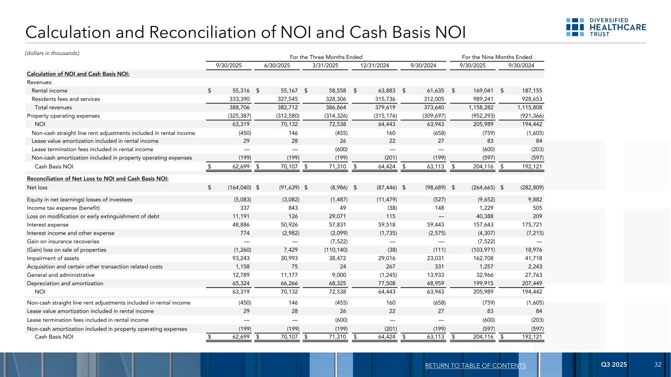 Q3 2025 32 Calculation and Reconciliation of NOI and Cash Basis NOI (dollars in thousands) RETURN TO TABLE OF CONTENTS For the Three Months Ended For the Nine Months Ended 9/30/2025 6/30/2025 3/31/2025 12/31/2024 9/30/2024 9/30/2025 9/30/2024 Calculation of NOI and Cash Basis NOI: Revenues: Rental income $ 55,316 $ 55,167 $ 58,558 $ 63,883 $ 61,635 $ 169,041 $ 187,155 Residents fees and services 333,390 327,545 328,306 315,736 312,005 989,241 928,653 Total revenues 388,706 382,712 386,864 379,619 373,640 1,158,282 1,115,808 Property operating expenses (325,387) (312,580) (314,326) (315,176) (309,697) (952,293) (921,366) NOI 63,319 70,132 72,538 64,443 63,943 205,989 194,442 Non-cash straight line rent adjustments included in rental income (450) 146 (455) 160 (658) (759) (1,605) Lease value amortization included in rental income 29 28 26 22 27 83 84 Lease termination fees included in rental income — — (600) — — (600) (203) Non-cash amortization included in property operating expenses (199) (199) (199) (201) (199) (597) (597) Cash Basis NOI $ 62,699 $ 70,107 $ 71,310 $ 64,424 $ 63,113 $ 204,116 $ 192,121 Reconciliation of Net Loss to NOI and Cash Basis NOI: Net loss $ (164,040) $ (91,639) $ (8,986) $ (87,446) $ (98,689) $ (264,665) $ (282,809) Equity in net (earnings) losses of investees (5,083) (3,082) (1,487) (11,479) (527) (9,652) 9,882 Income tax expense (benefit) 337 843 49 (38) 148 1,229 505 Loss on modification or early extinguishment of debt 11,191 126 29,071 115 — 40,388 209 Interest expense 48,886 50,926 57,831 59,518 59,443 157,643 175,721 Interest income and other expense 774 (2,982) (2,099) (1,735) (2,575) (4,307) (7,215) Gain on insurance recoveries — — (7,522) — — (7,522) — (Gain) loss on sale of properties (1,260) 7,429 (110,140) (38) (111) (103,971) 18,976 Impairment of assets 93,243 30,993 38,472 29,016 23,031 162,708 41,718 Acquisition and certain other transaction related costs 1,158 75 24 267 331 1,257 2,243 General and administrative 12,789 11,177 9,000 (1,245) 13,933 32,966 27,763 Depreciation and amortization 65,324 66,266 68,325 77,508 68,959 199,915 207,449 NOI 63,319 70,132 72,538 64,443 63,943 205,989 194,442 Non-cash straight line rent adjustments included in rental income (450) 146 (455) 160 (658) (759) (1,605) Lease value amortization included in rental income 29 28 26 22 27 83 84 Lease termination fees included in rental income — — (600) — — (600) (203) Non-cash amortization included in property operating expenses (199) (199) (199) (201) (199) (597) (597) Cash Basis NOI $ 62,699 $ 70,107 $ 71,310 $ 64,424 $ 63,113 $ 204,116 $ 192,121