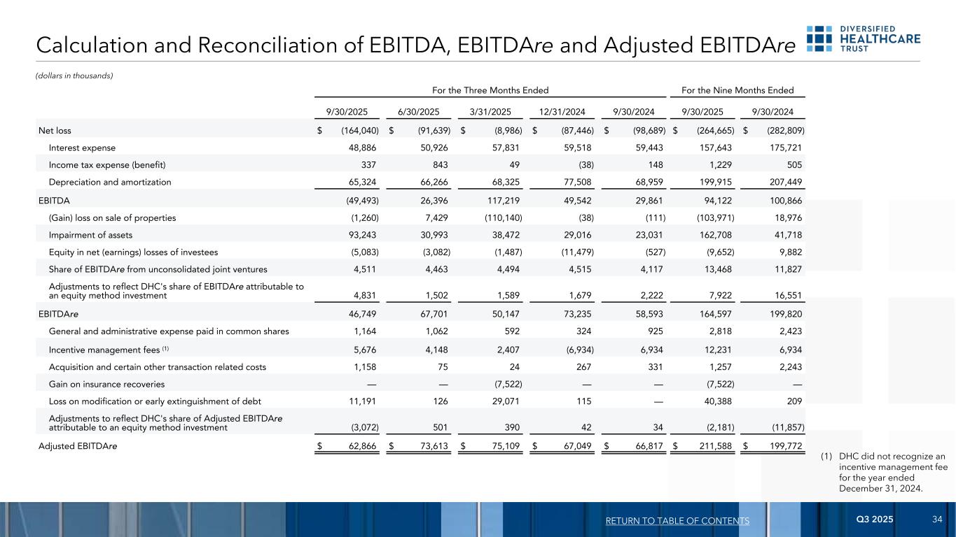 Q3 2025 34 Calculation and Reconciliation of EBITDA, EBITDAre and Adjusted EBITDAre (dollars in thousands) For the Three Months Ended For the Nine Months Ended 9/30/2025 6/30/2025 3/31/2025 12/31/2024 9/30/2024 9/30/2025 9/30/2024 Net loss $ (164,040) $ (91,639) $ (8,986) $ (87,446) $ (98,689) $ (264,665) $ (282,809) Interest expense 48,886 50,926 57,831 59,518 59,443 157,643 175,721 Income tax expense (benefit) 337 843 49 (38) 148 1,229 505 Depreciation and amortization 65,324 66,266 68,325 77,508 68,959 199,915 207,449 EBITDA (49,493) 26,396 117,219 49,542 29,861 94,122 100,866 (Gain) loss on sale of properties (1,260) 7,429 (110,140) (38) (111) (103,971) 18,976 Impairment of assets 93,243 30,993 38,472 29,016 23,031 162,708 41,718 Equity in net (earnings) losses of investees (5,083) (3,082) (1,487) (11,479) (527) (9,652) 9,882 Share of EBITDAre from unconsolidated joint ventures 4,511 4,463 4,494 4,515 4,117 13,468 11,827 Adjustments to reflect DHC's share of EBITDAre attributable to an equity method investment 4,831 1,502 1,589 1,679 2,222 7,922 16,551 EBITDAre 46,749 67,701 50,147 73,235 58,593 164,597 199,820 General and administrative expense paid in common shares 1,164 1,062 592 324 925 2,818 2,423 Incentive management fees (1) 5,676 4,148 2,407 (6,934) 6,934 12,231 6,934 Acquisition and certain other transaction related costs 1,158 75 24 267 331 1,257 2,243 Gain on insurance recoveries — — (7,522) — — (7,522) — Loss on modification or early extinguishment of debt 11,191 126 29,071 115 — 40,388 209 Adjustments to reflect DHC's share of Adjusted EBITDAre attributable to an equity method investment (3,072) 501 390 42 34 (2,181) (11,857) Adjusted EBITDAre $ 62,866 $ 73,613 $ 75,109 $ 67,049 $ 66,817 $ 211,588 $ 199,772 RETURN TO TABLE OF CONTENTS (1) DHC did not recognize an incentive management fee for the year ended December 31, 2024.