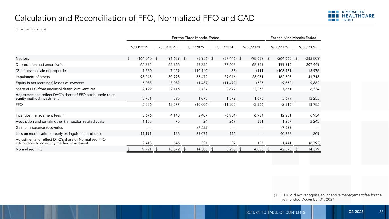 Q3 2025 35 Calculation and Reconciliation of FFO, Normalized FFO and CAD (dollars in thousands) RETURN TO TABLE OF CONTENTS For the Three Months Ended For the Nine Months Ended 9/30/2025 6/30/2025 3/31/2025 12/31/2024 9/30/2024 9/30/2025 9/30/2024 Net loss $ (164,040) $ (91,639) $ (8,986) $ (87,446) $ (98,689) $ (264,665) $ (282,809) Depreciation and amortization 65,324 66,266 68,325 77,508 68,959 199,915 207,449 (Gain) loss on sale of properties (1,260) 7,429 (110,140) (38) (111) (103,971) 18,976 Impairment of assets 93,243 30,993 38,472 29,016 23,031 162,708 41,718 Equity in net (earnings) losses of investees (5,083) (3,082) (1,487) (11,479) (527) (9,652) 9,882 Share of FFO from unconsolidated joint ventures 2,199 2,715 2,737 2,672 2,273 7,651 6,334 Adjustments to reflect DHC's share of FFO attributable to an equity method investment 3,731 895 1,073 1,572 1,698 5,699 12,235 FFO (5,886) 13,577 (10,006) 11,805 (3,366) (2,315) 13,785 Incentive management fees (1) 5,676 4,148 2,407 (6,934) 6,934 12,231 6,934 Acquisition and certain other transaction related costs 1,158 75 24 267 331 1,257 2,243 Gain on insurance recoveries — — (7,522) — — (7,522) — Loss on modification or early extinguishment of debt 11,191 126 29,071 115 — 40,388 209 Adjustments to reflect DHC's share of Normalized FFO attributable to an equity method investment (2,418) 646 331 37 127 (1,441) (8,792) Normalized FFO $ 9,721 $ 18,572 $ 14,305 $ 5,290 $ 4,026 $ 42,598 $ 14,379 (1) DHC did not recognize an incentive management fee for the year ended December 31, 2024.