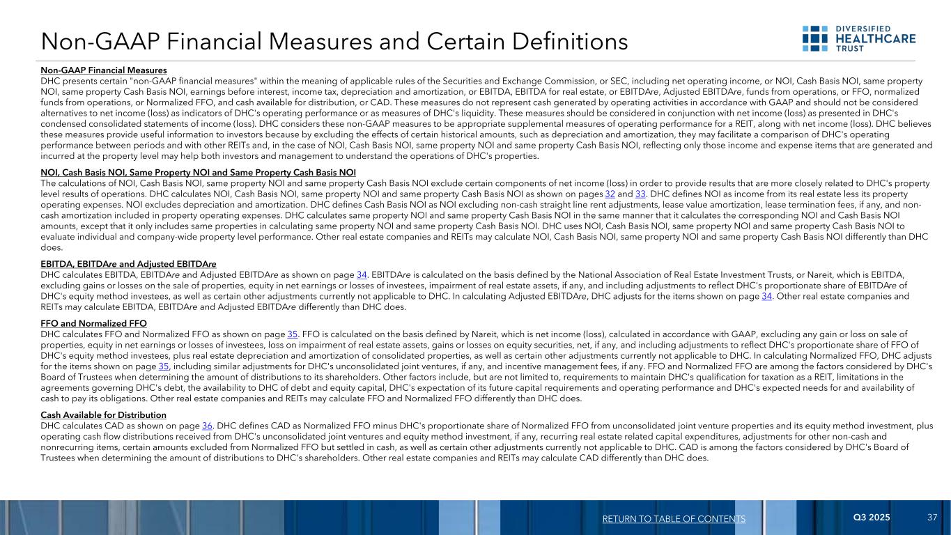 Q3 2025 37 Non-GAAP Financial Measures DHC presents certain "non-GAAP financial measures" within the meaning of applicable rules of the Securities and Exchange Commission, or SEC, including net operating income, or NOI, Cash Basis NOI, same property NOI, same property Cash Basis NOI, earnings before interest, income tax, depreciation and amortization, or EBITDA, EBITDA for real estate, or EBITDAre, Adjusted EBITDAre, funds from operations, or FFO, normalized funds from operations, or Normalized FFO, and cash available for distribution, or CAD. These measures do not represent cash generated by operating activities in accordance with GAAP and should not be considered alternatives to net income (loss) as indicators of DHC's operating performance or as measures of DHC's liquidity. These measures should be considered in conjunction with net income (loss) as presented in DHC's condensed consolidated statements of income (loss). DHC considers these non-GAAP measures to be appropriate supplemental measures of operating performance for a REIT, along with net income (loss). DHC believes these measures provide useful information to investors because by excluding the effects of certain historical amounts, such as depreciation and amortization, they may facilitate a comparison of DHC's operating performance between periods and with other REITs and, in the case of NOI, Cash Basis NOI, same property NOI and same property Cash Basis NOI, reflecting only those income and expense items that are generated and incurred at the property level may help both investors and management to understand the operations of DHC's properties. NOI, Cash Basis NOI, Same Property NOI and Same Property Cash Basis NOI The calculations of NOI, Cash Basis NOI, same property NOI and same property Cash Basis NOI exclude certain components of net income (loss) in order to provide results that are more closely related to DHC's property level results of operations. DHC calculates NOI, Cash Basis NOI, same property NOI and same property Cash Basis NOI as shown on pages 32 and 33. DHC defines NOI as income from its real estate less its property operating expenses. NOI excludes depreciation and amortization. DHC defines Cash Basis NOI as NOI excluding non-cash straight line rent adjustments, lease value amortization, lease termination fees, if any, and non- cash amortization included in property operating expenses. DHC calculates same property NOI and same property Cash Basis NOI in the same manner that it calculates the corresponding NOI and Cash Basis NOI amounts, except that it only includes same properties in calculating same property NOI and same property Cash Basis NOI. DHC uses NOI, Cash Basis NOI, same property NOI and same property Cash Basis NOI to evaluate individual and company-wide property level performance. Other real estate companies and REITs may calculate NOI, Cash Basis NOI, same property NOI and same property Cash Basis NOI differently than DHC does. EBITDA, EBITDAre and Adjusted EBITDAre DHC calculates EBITDA, EBITDAre and Adjusted EBITDAre as shown on page 34. EBITDAre is calculated on the basis defined by the National Association of Real Estate Investment Trusts, or Nareit, which is EBITDA, excluding gains or losses on the sale of properties, equity in net earnings or losses of investees, impairment of real estate assets, if any, and including adjustments to reflect DHC's proportionate share of EBITDAre of DHC's equity method investees, as well as certain other adjustments currently not applicable to DHC. In calculating Adjusted EBITDAre, DHC adjusts for the items shown on page 34. Other real estate companies and REITs may calculate EBITDA, EBITDAre and Adjusted EBITDAre differently than DHC does. FFO and Normalized FFO DHC calculates FFO and Normalized FFO as shown on page 35. FFO is calculated on the basis defined by Nareit, which is net income (loss), calculated in accordance with GAAP, excluding any gain or loss on sale of properties, equity in net earnings or losses of investees, loss on impairment of real estate assets, gains or losses on equity securities, net, if any, and including adjustments to reflect DHC's proportionate share of FFO of DHC's equity method investees, plus real estate depreciation and amortization of consolidated properties, as well as certain other adjustments currently not applicable to DHC. In calculating Normalized FFO, DHC adjusts for the items shown on page 35, including similar adjustments for DHC's unconsolidated joint ventures, if any, and incentive management fees, if any. FFO and Normalized FFO are among the factors considered by DHC's Board of Trustees when determining the amount of distributions to its shareholders. Other factors include, but are not limited to, requirements to maintain DHC's qualification for taxation as a REIT, limitations in the agreements governing DHC's debt, the availability to DHC of debt and equity capital, DHC's expectation of its future capital requirements and operating performance and DHC's expected needs for and availability of cash to pay its obligations. Other real estate companies and REITs may calculate FFO and Normalized FFO differently than DHC does. Cash Available for Distribution DHC calculates CAD as shown on page 36. DHC defines CAD as Normalized FFO minus DHC's proportionate share of Normalized FFO from unconsolidated joint venture properties and its equity method investment, plus operating cash flow distributions received from DHC's unconsolidated joint ventures and equity method investment, if any, recurring real estate related capital expenditures, adjustments for other non-cash and nonrecurring items, certain amounts excluded from Normalized FFO but settled in cash, as well as certain other adjustments currently not applicable to DHC. CAD is among the factors considered by DHC's Board of Trustees when determining the amount of distributions to DHC's shareholders. Other real estate companies and REITs may calculate CAD differently 