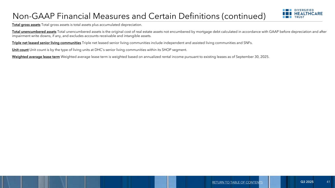 Q3 2025 41 Total gross assets Total gross assets is total assets plus accumulated depreciation. Total unencumbered assets Total unencumbered assets is the original cost of real estate assets not encumbered by mortgage debt calculated in accordance with GAAP before depreciation and after impairment write downs, if any, and excludes accounts receivable and intangible assets. Triple net leased senior living communities Triple net leased senior living communities include independent and assisted living communities and SNFs. Unit count Unit count is by the type of living units at DHC's senior living communities within its SHOP segment. Weighted average lease term Weighted average lease term is weighted based on annualized rental income pursuant to existing leases as of September 30, 2025. Non-GAAP Financial Measures and Certain Definitions (continued) RETURN TO TABLE OF CONTENTS
