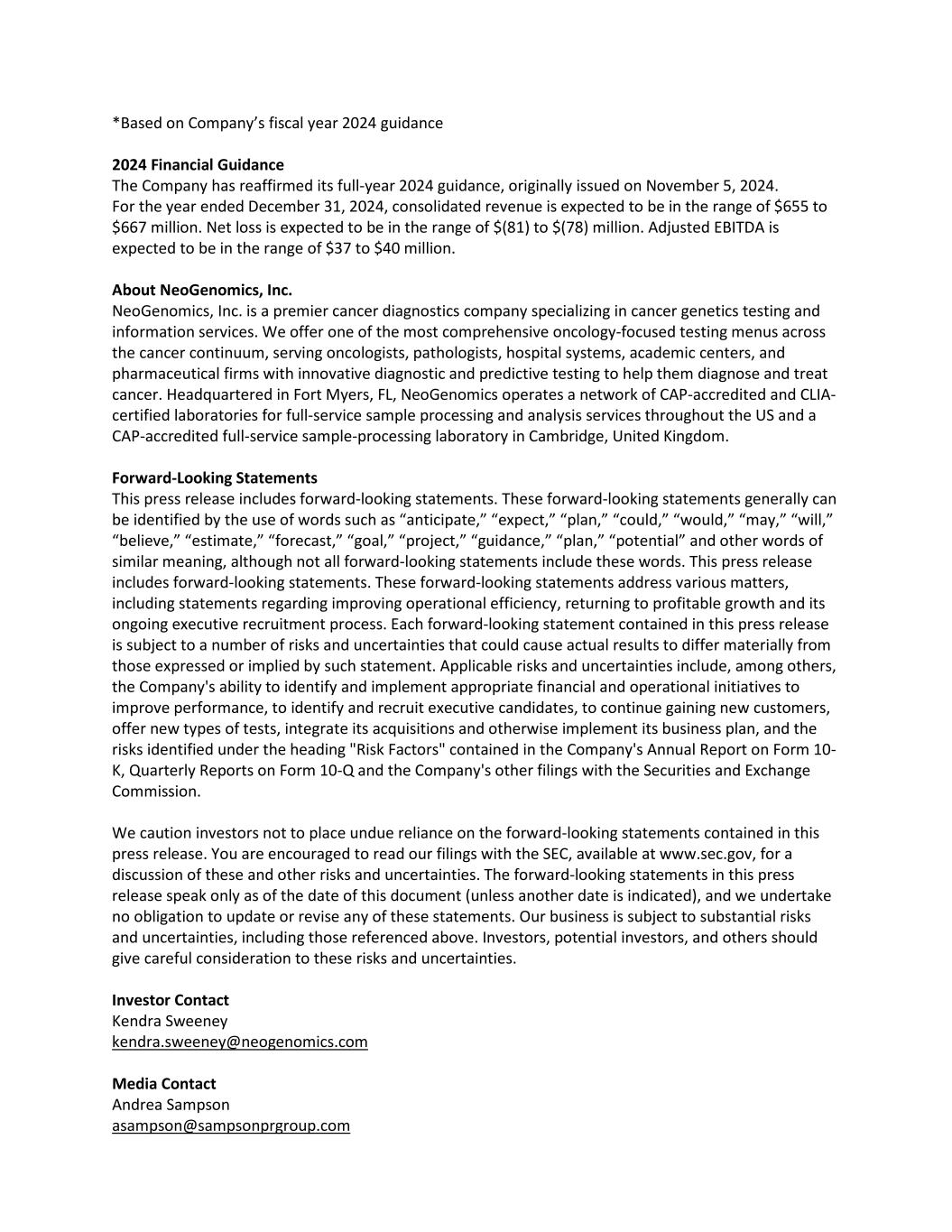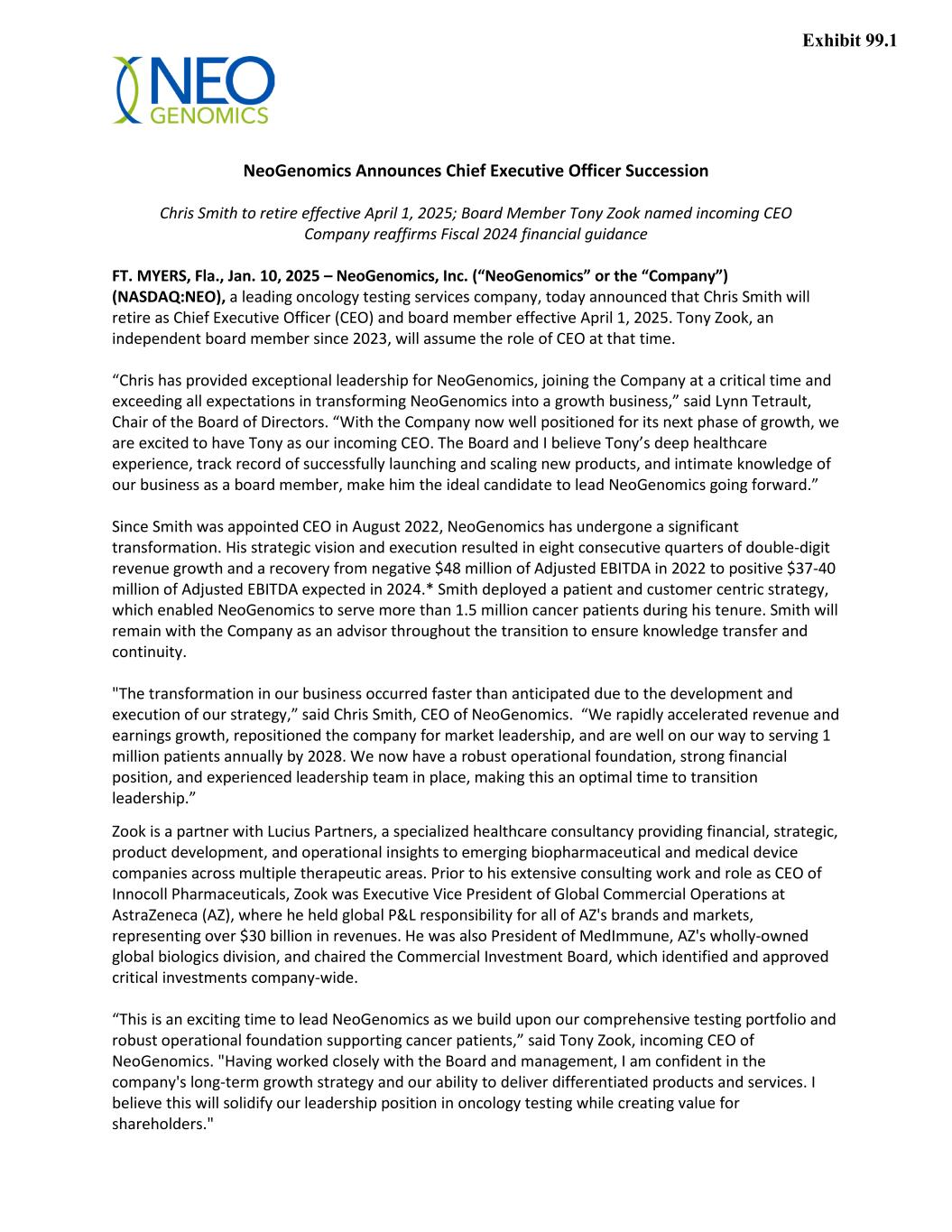 This special advisor agreement (the “Agreement”), effective April 1, 2025 (“Effective Date”) by and between Christopher Smith (“Advisor”), an individual whose address is 17409 Via Lugano Court, Miramar Lakes, Florida 33913 and NeoGenomics Laboratories, Inc., a Florida corporation with its principal office located at 9490 NeoGenomics Way, Fort Myers, FL 33912 together with its affiliates, including NeoGenomics, Inc., and subsidiaries (“NeoGenomics” or the “Company”).