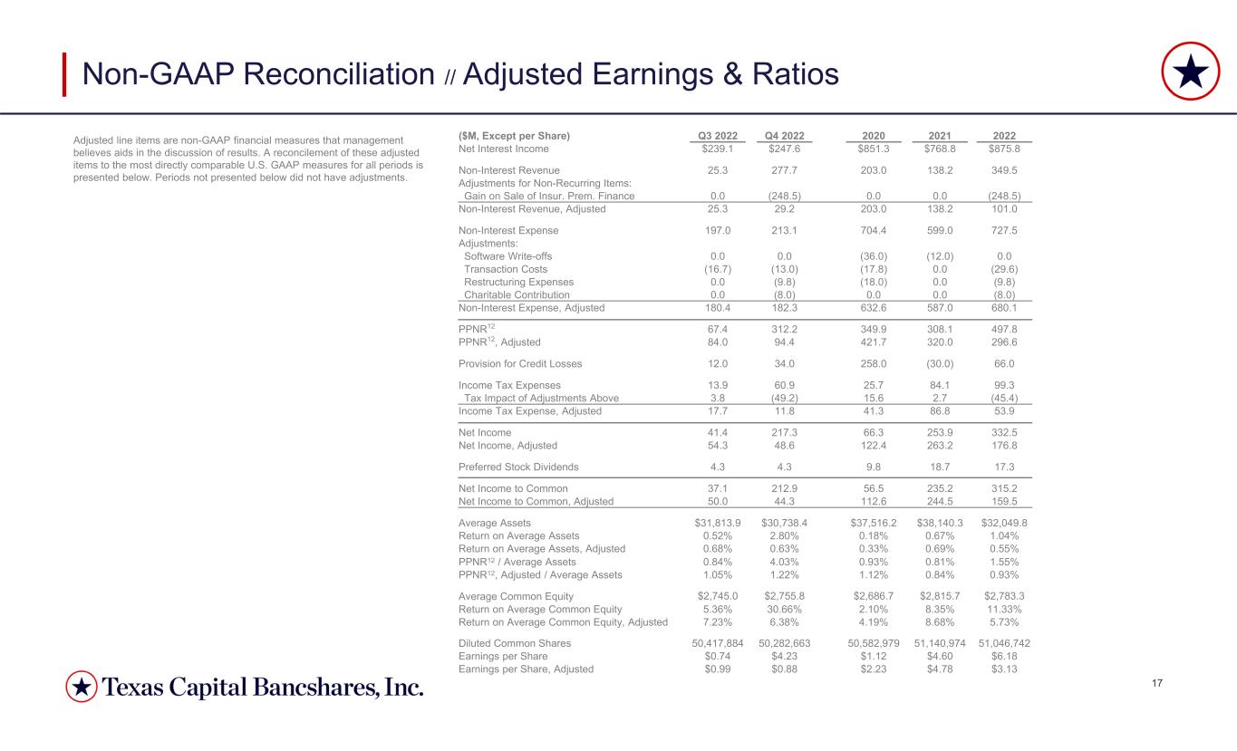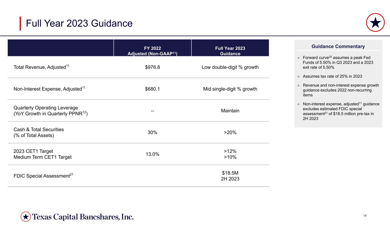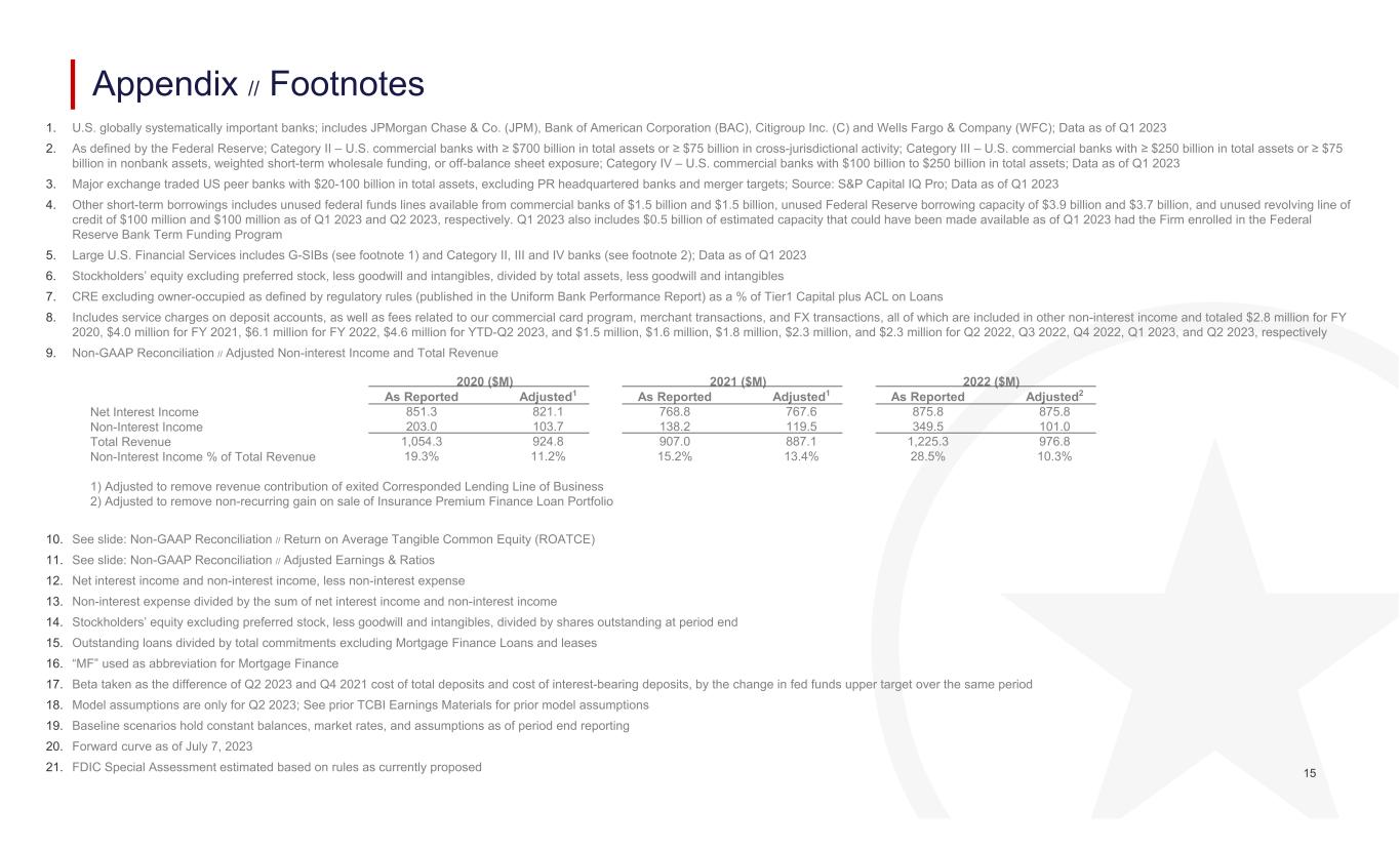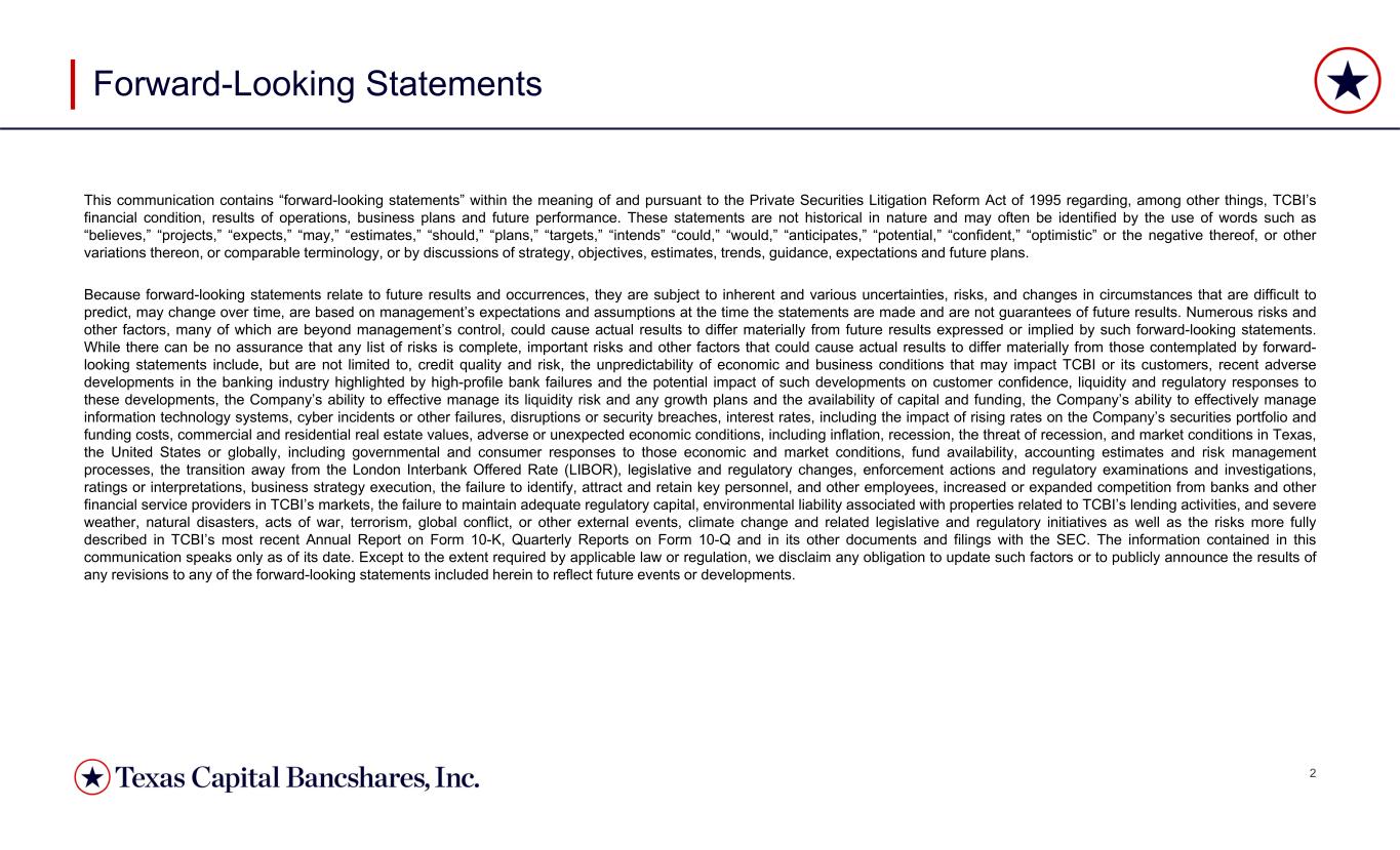 将来の見通しに関する記述は、将来の結果や事象に関するものであるため、固有のさまざまな不確実性、リスク、および予測困難な状況の変化の影響を受け、時間の経過とともに変化する可能性があり、記述が行われた時点における経営陣の予想および仮定に基づいており、将来の結果を保証するものではありません。数多くのリスクおよびその他の要因(その多くは経営陣が制御できないもの)により、実際の結果は、かかる将来見通しに関する記述により明示または暗示される将来の結果とは大きく異なる可能性があります。リスクのリストが完全であるという保証はありませんが、実際の結果が将来予想に関する記述で意図されたものと大きく異なる可能性のある重要なリスクやその他の要因には、信用度やリスク、TCBIやその顧客に影響を与える可能性のある経済状況や事業状況の予測不可能性、著名な銀行の破綻によって浮き彫りにされた銀行業界における最近の不利な展開、こうした展開が顧客の信頼や流動性、規制当局の対応に与える潜在的な影響などが含まれますが、これらに限定されるものではありません、流動性リスクおよび成長計画を効果的に管理する能力、資本および資金調達の可能性、情報技術システム、サイバー事件、その他の障害、混乱、セキュリティ侵害を効果的に管理する能力、金利(金利上昇が当社の証券ポートフォリオおよび資金調達コストに与える影響を含む)、商業用および住宅用不動産価値、インフレ、景気後退、景気後退の脅威を含む不利または予期せぬ経済状況、テキサス州、米国、または世界的な経済・市場情勢(これらの経済・市場情勢に対する政府および消費者の反応を含む)、資金調達可能性、会計上の見積もりおよびリスク管理プロセス、ロンドン銀行間取引金利(LIBOR)からの移行、法律および規制の変更、強制措置、規制当局による審査および調査、格付けまたは解釈、事業戦略の実行、主要な人材の特定、引き付け、維持の失敗、その他の従業員、TCBIの市場における銀行やその他の金融サービス業者との競争の激化または拡大、適切な規制資本を維持できない場合、TCBIの融資活動に関連する不動産に関連する環境責任、悪天候、自然災害、戦争行為、テロ行為、世界的な紛争、その他の外部事象、気候変動、関連する法律や規制イニシアチブ、およびTCBIの最新の年次報告書(Form 10-K)、四半期報告書(Form 10-Q)、その他の文書やSECへの提出書類に記載されているリスク。本コミュニケーションに含まれる情報は、その日付時点のものです。適用される法律または規則により要求される範囲を除き、当社はかかる要因を更新する義務、または将来の出来事や進展を反映するために本書に含まれる将来予想に関する記述を修正した結果を公表する義務を一切負いません。