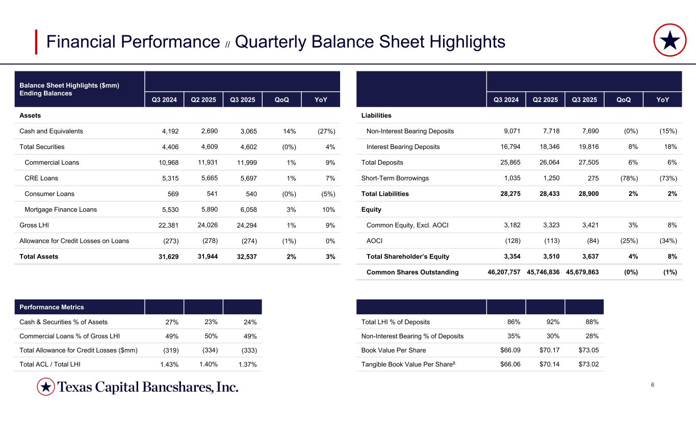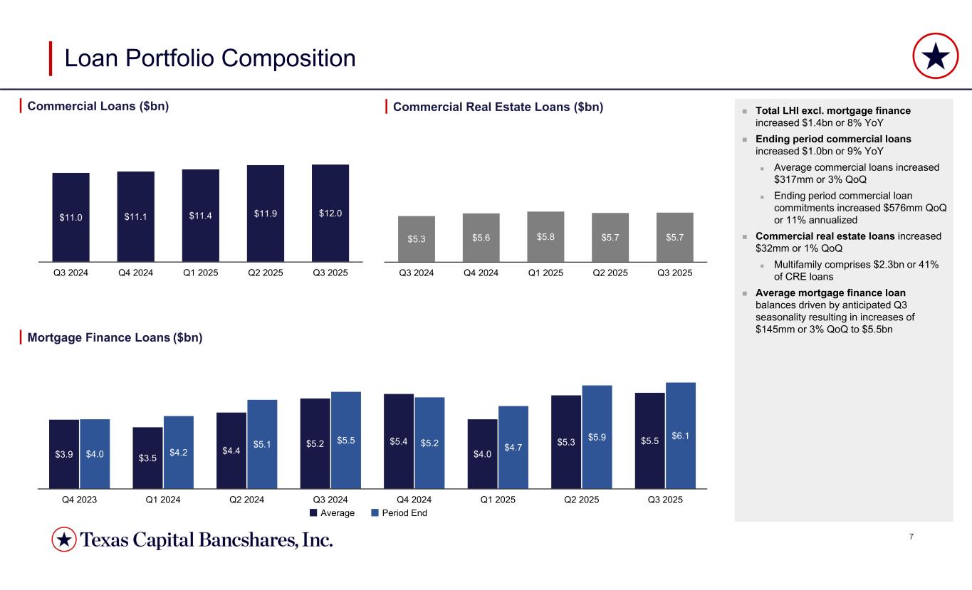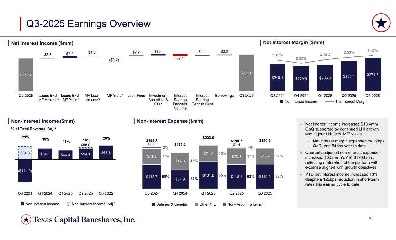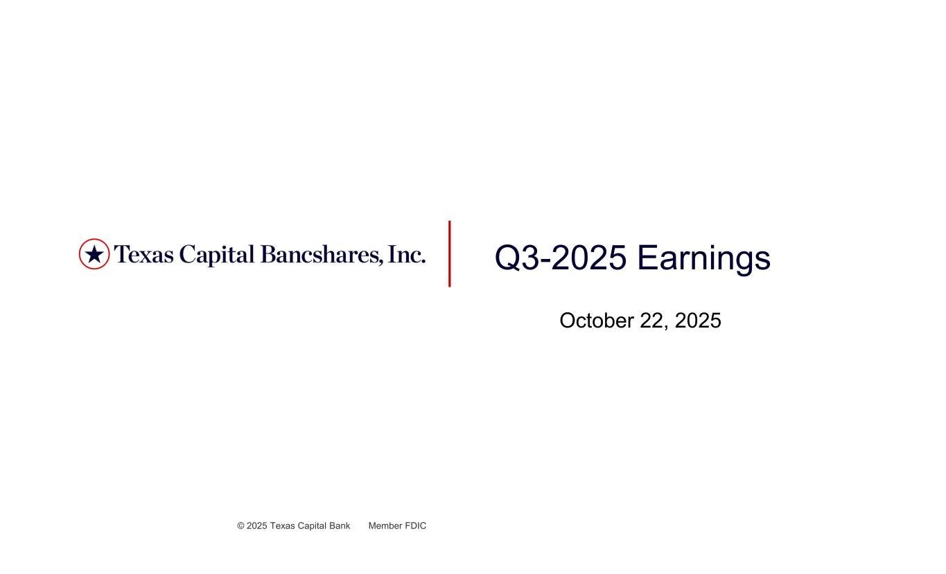 ダラス-2025 年 10 月 22 日-テキサス・キャピタル・バンクの親会社であるテキサス・キャピタル・バン クシェアーズ・インク(NASDAQ: TCBI)は、2025 年第 3 四半期の営業実績を発表した。