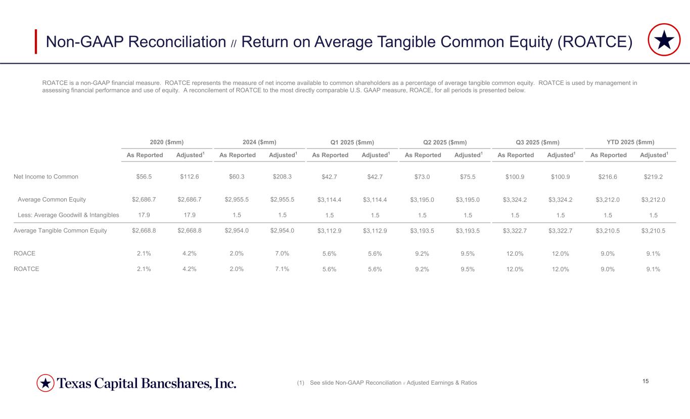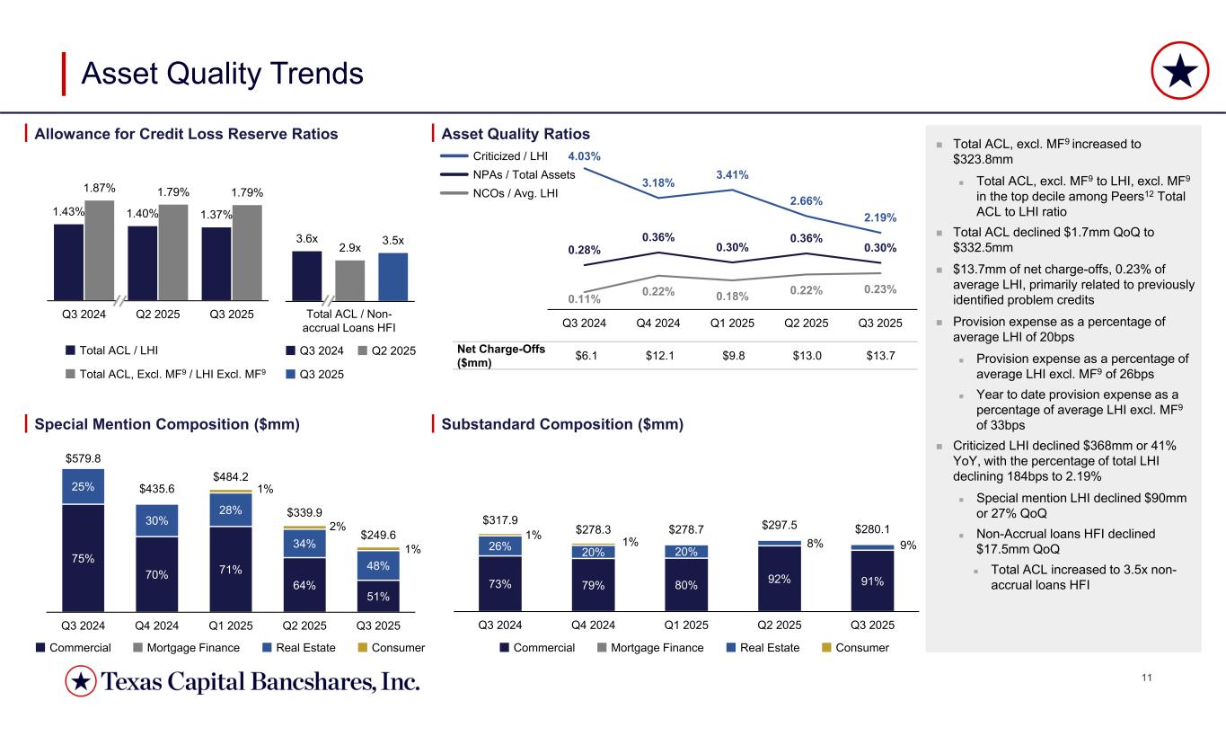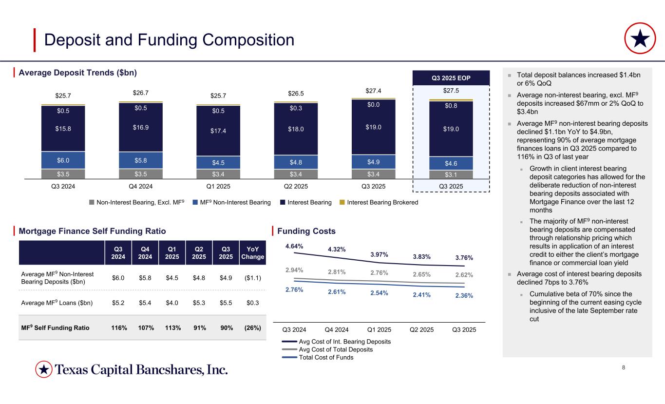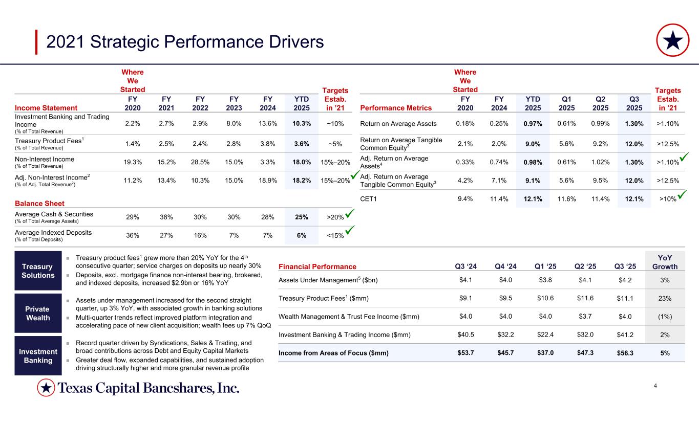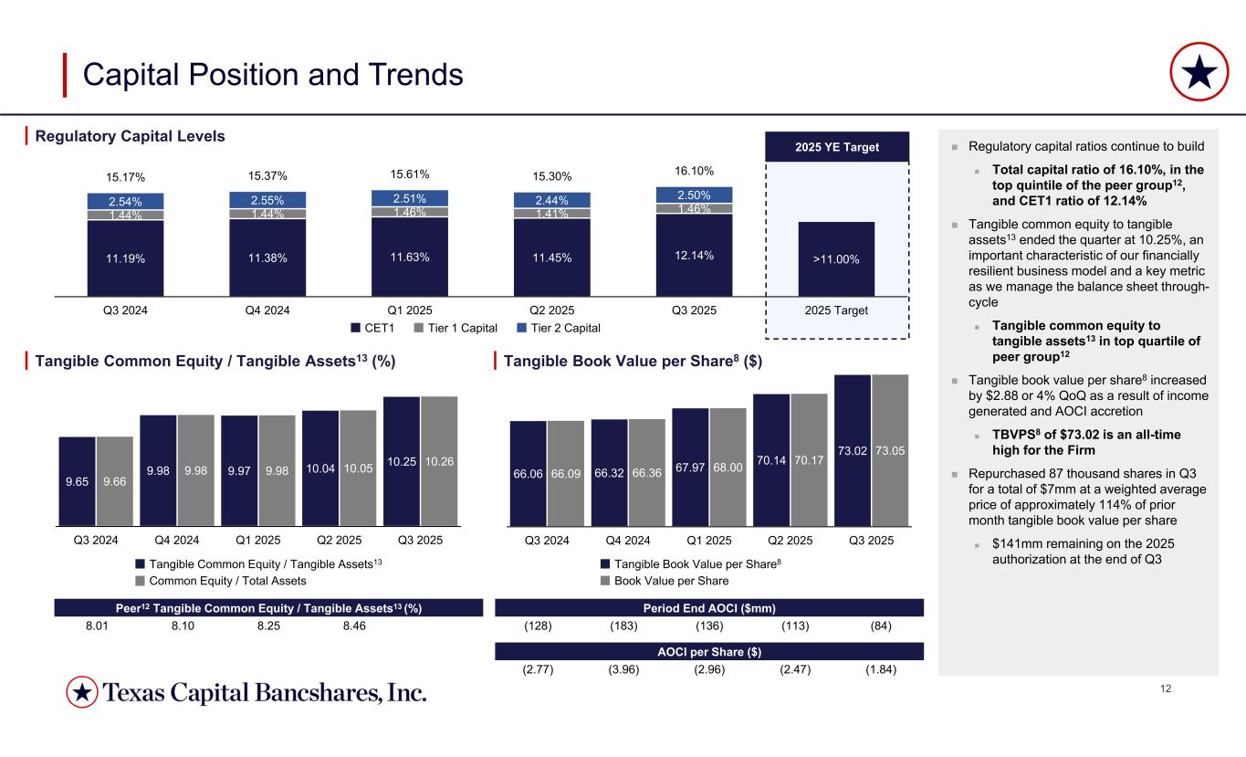 ダラス-2025 年 10 月 22 日-テキサス・キャピタル・バンクの親会社であるテキサス・キャピタル・バン クシェアーズ・インク(NASDAQ: TCBI)は、2025 年第 3 四半期の営業実績を発表した。