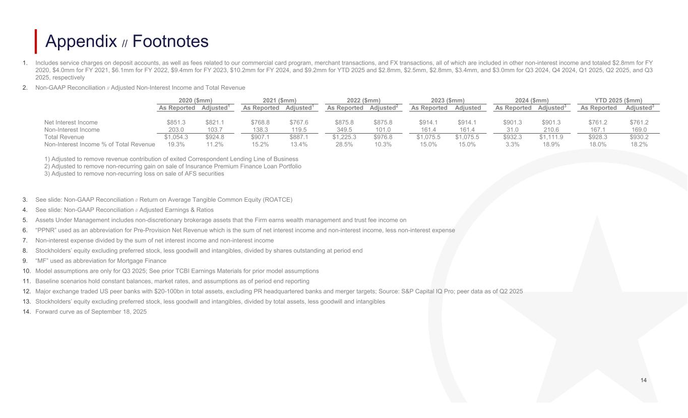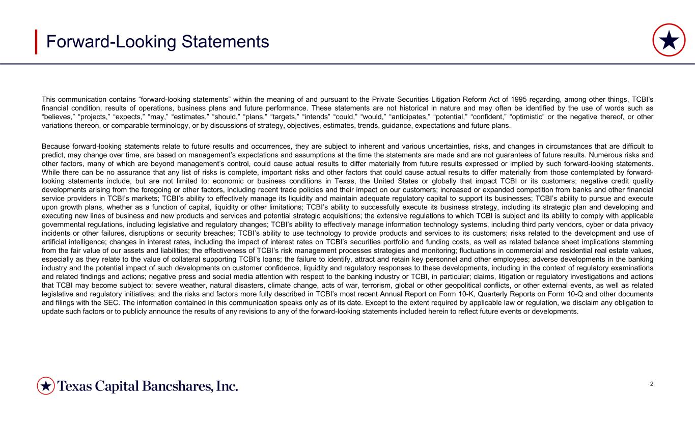 将来の見通しに関する記述は、将来の結果や事象に関するものであるため、固有のさまざまな不確実性、リスク、および予測困難な状況の変化の影響を受け、時間の経過とともに変化する可能性があり、記述が行われた時点における経営陣の予想および仮定に基づいており、将来の結果を保証するものではありません。数多くのリスクおよびその他の要因(その多くは経営陣が制御できないもの)により、実際の結果は、かかる将来見通しに関する記述により明示または暗示される将来の結果とは大きく異なる可能性があります。リスクのリストが完全である保証はありませんが、実際の結果が将来の見通しに関する記述で意図されたものと大きく異なる可能性のある重要なリスクおよびその他の要因には、以下のものが含まれますが、これらに限定されるものではありません:TCBIまたはその顧客に影響を与えるテキサス州、米国、または世界的な経済・経営状況、最近の貿易政策やその顧客に対する影響など、上記またはその他の要因から生じる信用度の低下、TCBIの市場における銀行やその他の金融サービス業者との競争の激化または拡大、TCBIの流動性を効果的に管理し、事業を支援するために適切な規制資本を維持する能力、資本、流動性、その他の制限の有無にかかわらず、TCBIが成長計画を追求し実行する能力;TCBIの事業戦略を成功裏に実行する能力(戦略計画、新事業・新商品・新サービスの開発・実行、戦略的買収の可能性を含む)、TCBIが従う広範な規制、および適用される政府規制を遵守する能力(法律や規制の変更を含む)、TCBIが第三者ベンダーを含む情報技術システムを効果的に管理する能力、サイバーまたはデータプライバシー事件、その他の障害、混乱、セキュリティ侵害、TCBIが技術を利用して顧客に商品・サービスを提供する能力、人工知能の開発・利用に関するリスク;金利の変動(金利がTCBIの証券ポートフォリオや資金調達コストに与える影響、資産・負債の公正価値に起因するバランスシートへの影響も含む)、TCBIのリスク管理プロセス戦略およびモニタリングの有効性、商業用不動産および住宅用不動産の価値の変動(特にTCBIのローンを支える担保の価値に関連する);銀行業界における不利な展開、およびそのような展開が顧客の信頼、流動性、規制当局の対応に与える潜在的な影響;特に銀行業界やTCBIに関する否定的な報道や社会的な注目、TCBIが受ける可能性のあるクレーム、訴訟、規制当局による調査や措置、悪天候、自然災害、気候変動、戦争行為、テロ行為、世界的またはその他の地政学的紛争、その他の外部事象、関連する法律や規制の取り組み、TCBIの最新の年次報告書(Form 10-K)、四半期報告書(Form 10-Q)、その他の文書やSECへの提出書類に詳細に記載されているリスクや要因。本コミュニケーションに含まれる情報は、その日付時点のものです。適用される法律または規則により要求される範囲を除き、当社はかかる要因を更新する義務、または将来の出来事や進展を反映するために本書に含まれる将来の見通しに関する記述を修正した結果を公表する義務を一切負いません。