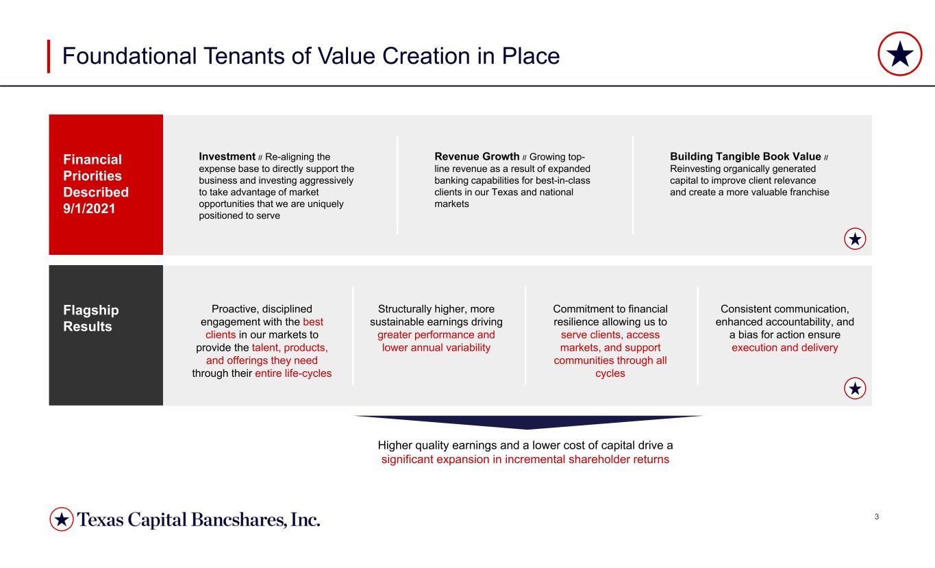 「テキサス・キャピタルは、2021 年 9 月 1 日付の戦略更新で掲げた戦略的・財務的成果を達成し、 過去 20 年間で最も成功した銀行改革を実現し、収益力を構造的に高め、手数料収入、総資産利益率、 バランスシートの回復力において業界をリードする成長を達成しました。「今後とも、顧客に対する揺るぎないコミットメントと確かな実行力により、当行はテキサス州を代表する金融サービス企業として、すべてのステークホルダーに長期的な価値を提供し続けます。