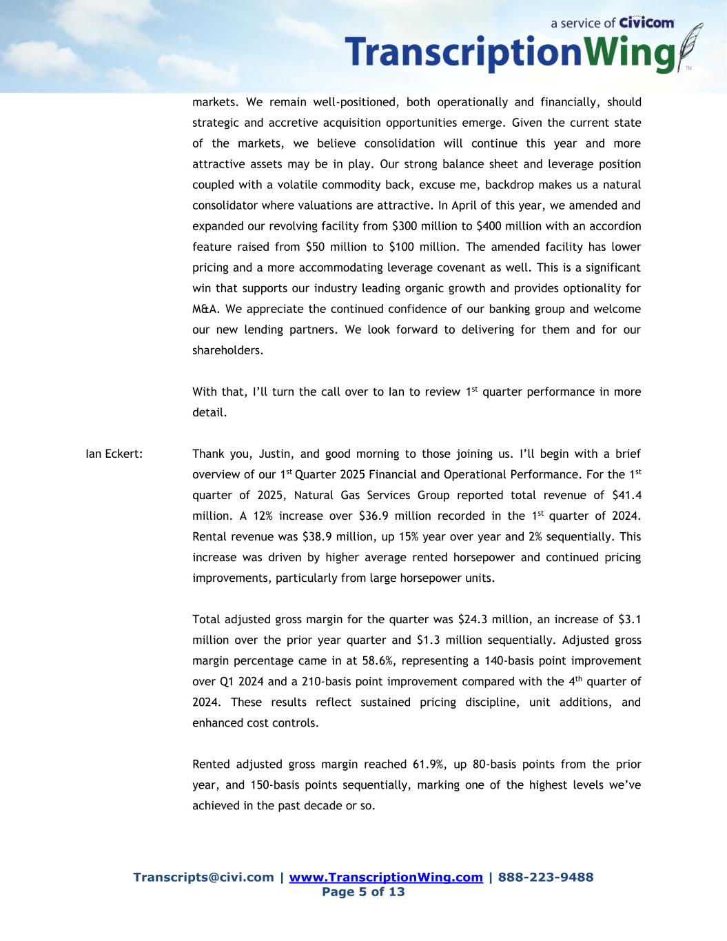 ナチュラル・ガス・サービス・グループは、エネルギー業界向けに天然ガス圧縮装置、技術、サービスを提供するリーディング・カンパニーである。石油・天然ガス生産およびプラント設備用の天然ガス圧縮機の設計、レンタル、販売、メンテナンスを行っている。テキサス州ミッドランドに本社を置き、オクラホマ州タルサに製造施設、米国の主要な石油・天然ガス生産盆地にサービス施設を持つ。詳細情報はwww.ngsgi.com。