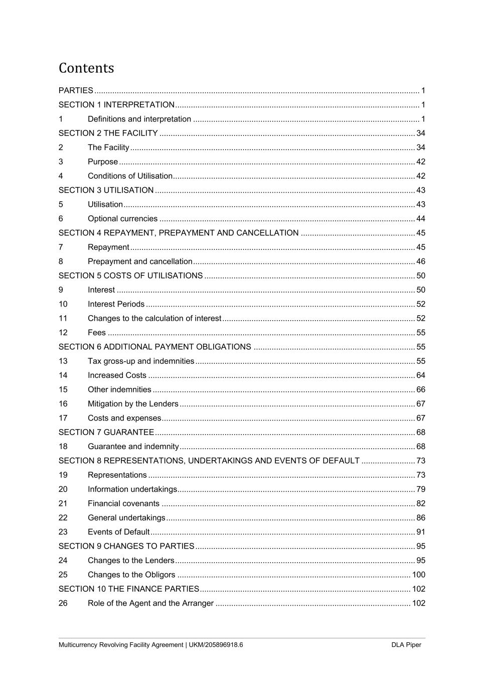 Multicurrency Revolving Facility Agreement | UKM/205896918.6 DLA Piper Contents PARTIES ................................................................................................................................................. 1 SECTION 1 INTERPRETATION ............................................................................................................. 1 1 Definitions and interpretation ..................................................................................................... 1 SECTION 2 THE FACILITY .................................................................................................................. 34 2 The Facility ............................................................................................................................... 34 3 Purpose .................................................................................................................................... 42 4 Conditions of Utilisation............................................................................................................ 42 SECTION 3 UTILISATION .................................................................................................................... 43 5 Utilisation .................................................................................................................................. 43 6 Optional currencies .................................................................................................................. 44 SECTION 4 REPAYMENT, PREPAYMENT AND CANCELLATION ................................................... 45 7 Repayment ............................................................................................................................... 45 8 Prepayment and cancellation ................................................................................................... 46 SECTION 5 COSTS OF UTILISATIONS .............................................................................................. 50 9 Interest ..................................................................................................................................... 50 10 Interest Periods ........................................................................................................................ 52 11 Changes to the calculation of interest ...................................................................................... 52 12 Fees ......................................................................................................................................... 55 SECTION 6 ADDITIONAL PAYMENT OBLIGATIONS ........................................................................ 55 13 Tax gross-up and indemnities .................................................................................................. 55 14 Increased Costs ....................................................................................................................... 64 15 Other indemnities ..................................................................................................................... 66 16 Mitigation by the Lenders ......................................................................................................... 67 17 Costs and expenses ................................................................................................................. 67 SECTION 7 GUARANTEE .................................................................................................................... 68 18 Guarantee and indemnity ......................................................................................................... 68 SECTION 8 REPRESENTATIONS, UNDERTAKINGS AND EVENTS OF DEFAULT ........................ 73 19 Representations ....................................................................................................................... 73 20 Information undertakings.......................................................................................................... 79 21 Financial covenants ................................................................................................................. 82 22 General undertakings ............................................................................................................... 86 23 Events of Default ...................................................................................................................... 91 SECTION 9 CHANGES TO PARTIES .................................................................................................. 95 24 Changes to the Lenders ........................................................................................................... 95 25 Changes to the Obligors ........................................................................................................ 100 SECTION 10 THE FINANCE PARTIES .............................................................................................. 102 26 Role of the Agent and the Arranger ....................................................................................... 102