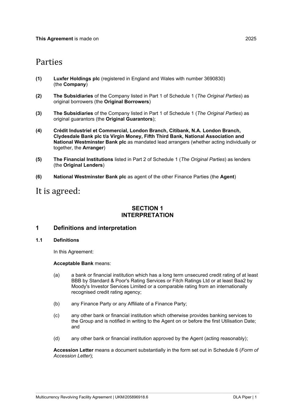 Multicurrency Revolving Facility Agreement | UKM/205896918.6 DLA Piper | 1 This Agreement is made on 2025 Parties (1) Luxfer Holdings plc (registered in England and Wales with number 3690830) (the Company) (2) The Subsidiaries of the Company listed in Part 1 of Schedule 1 (The Original Parties) as original borrowers (the Original Borrowers) (3) The Subsidiaries of the Company listed in Part 1 of Schedule 1 (The Original Parties) as original guarantors (the Original Guarantors); (4) Crédit Industriel et Commercial, London Branch, Citibank, N.A. London Branch, Clydesdale Bank plc t/a Virgin Money, Fifth Third Bank, National Association and National Westminster Bank plc as mandated lead arrangers (whether acting individually or together, the Arranger) (5) The Financial Institutions listed in Part 2 of Schedule 1 (The Original Parties) as lenders (the Original Lenders) (6) National Westminster Bank plc as agent of the other Finance Parties (the Agent) It is agreed: SECTION 1 INTERPRETATION 1 Definitions and interpretation 1.1 Definitions In this Agreement: Acceptable Bank means: (a) a bank or financial institution which has a long term unsecured credit rating of at least BBB by Standard & Poor's Rating Services or Fitch Ratings Ltd or at least Baa2 by Moody's Investor Services Limited or a comparable rating from an internationally recognised credit rating agency; (b) any Finance Party or any Affiliate of a Finance Party; (c) any other bank or financial institution which otherwise provides banking services to the Group and is notified in writing to the Agent on or before the first Utilisation Date; and (d) any other bank or financial institution approved by the Agent (acting reasonably); Accession Letter means a document substantially in the form set out in Schedule 6 (Form of Accession Letter);