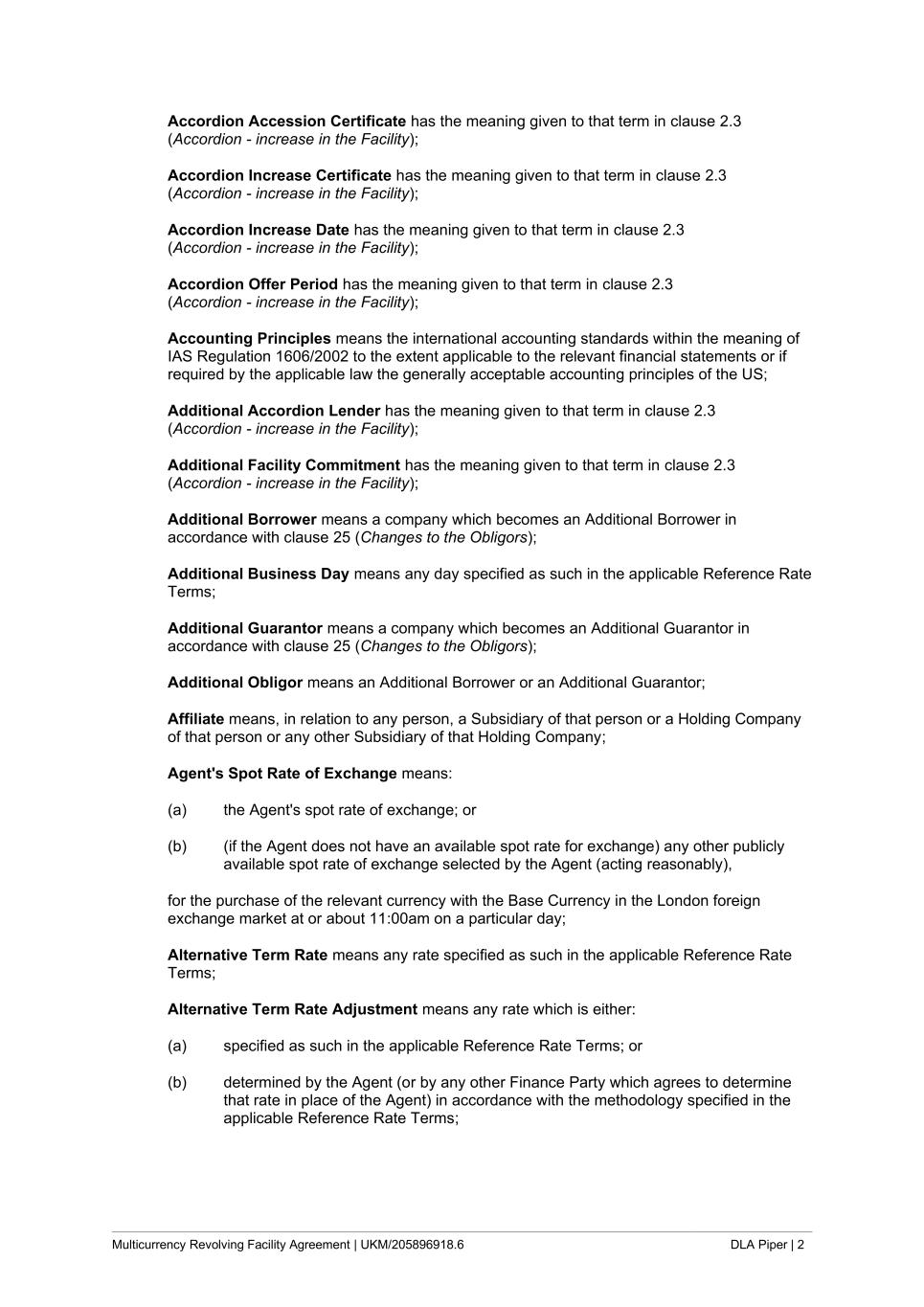 Multicurrency Revolving Facility Agreement | UKM/205896918.6 DLA Piper | 2 Accordion Accession Certificate has the meaning given to that term in clause 2.3 (Accordion - increase in the Facility); Accordion Increase Certificate has the meaning given to that term in clause 2.3 (Accordion - increase in the Facility); Accordion Increase Date has the meaning given to that term in clause 2.3 (Accordion - increase in the Facility); Accordion Offer Period has the meaning given to that term in clause 2.3 (Accordion - increase in the Facility); Accounting Principles means the international accounting standards within the meaning of IAS Regulation 1606/2002 to the extent applicable to the relevant financial statements or if required by the applicable law the generally acceptable accounting principles of the US; Additional Accordion Lender has the meaning given to that term in clause 2.3 (Accordion - increase in the Facility); Additional Facility Commitment has the meaning given to that term in clause 2.3 (Accordion - increase in the Facility); Additional Borrower means a company which becomes an Additional Borrower in accordance with clause 25 (Changes to the Obligors); Additional Business Day means any day specified as such in the applicable Reference Rate Terms; Additional Guarantor means a company which becomes an Additional Guarantor in accordance with clause 25 (Changes to the Obligors); Additional Obligor means an Additional Borrower or an Additional Guarantor; Affiliate means, in relation to any person, a Subsidiary of that person or a Holding Company of that person or any other Subsidiary of that Holding Company; Agent's Spot Rate of Exchange means: (a) the Agent's spot rate of exchange; or (b) (if the Agent does not have an available spot rate for exchange) any other publicly available spot rate of exchange selected by the Agent (acting reasonably), for the purchase of the relevant currency with the Base Currency in the London foreign exchange market at or about 11:00am on a particular day; Alternative Term Rate means any rate specified as such in the applicable Reference Rate Terms; Alternative Term Rate Adjustment means any rate which is either: (a) specified as such in the applicable Reference Rate Terms; or (b) determined by the Agent (or by any other Finance Party which agrees to determine that rate in place of the Agent) in accordance with the methodology specified in the applicable Reference Rate Terms;