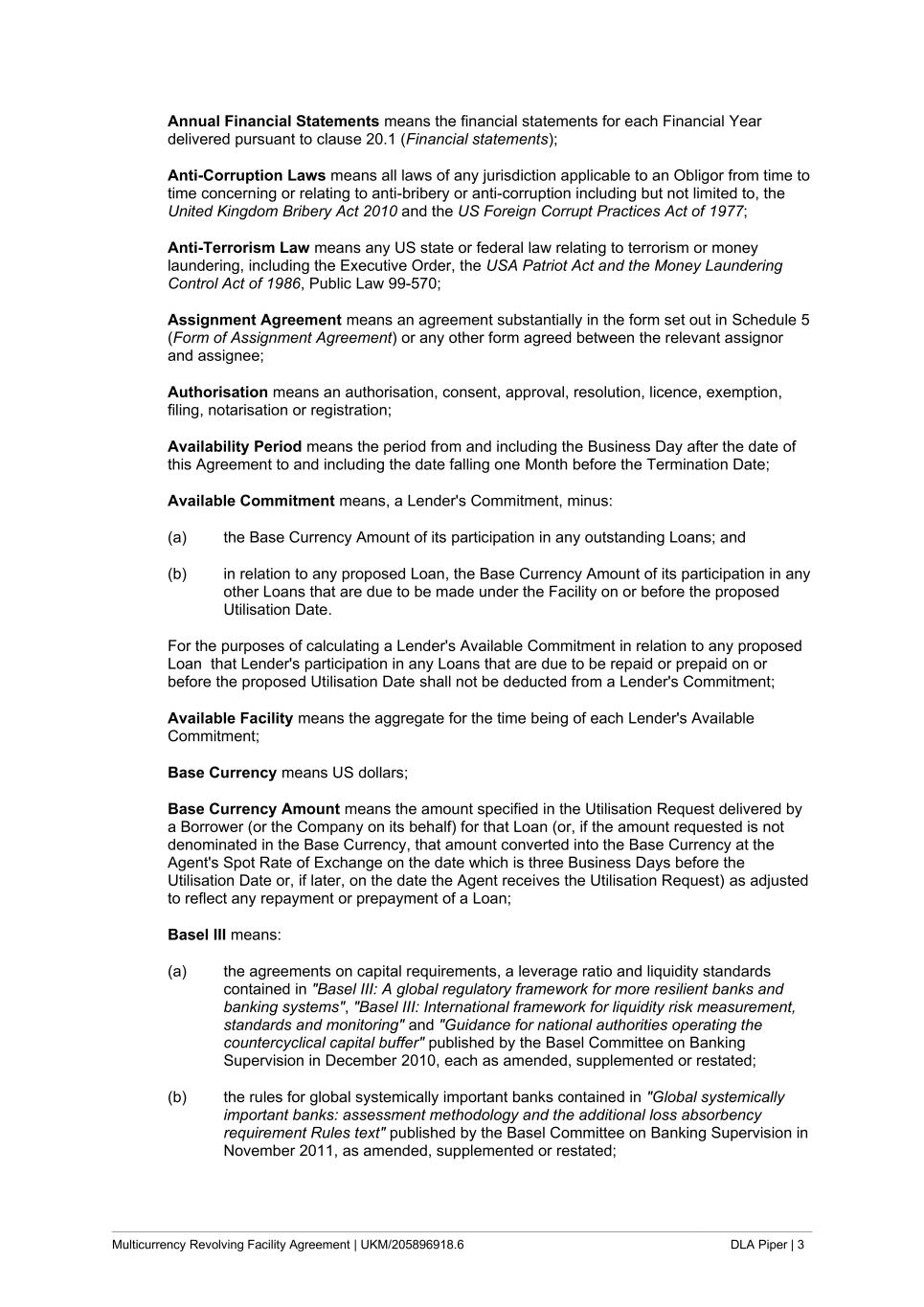 Multicurrency Revolving Facility Agreement | UKM/205896918.6 DLA Piper | 3 Annual Financial Statements means the financial statements for each Financial Year delivered pursuant to clause 20.1 (Financial statements); Anti-Corruption Laws means all laws of any jurisdiction applicable to an Obligor from time to time concerning or relating to anti-bribery or anti-corruption including but not limited to, the United Kingdom Bribery Act 2010 and the US Foreign Corrupt Practices Act of 1977; Anti-Terrorism Law means any US state or federal law relating to terrorism or money laundering, including the Executive Order, the USA Patriot Act and the Money Laundering Control Act of 1986, Public Law 99-570; Assignment Agreement means an agreement substantially in the form set out in Schedule 5 (Form of Assignment Agreement) or any other form agreed between the relevant assignor and assignee; Authorisation means an authorisation, consent, approval, resolution, licence, exemption, filing, notarisation or registration; Availability Period means the period from and including the Business Day after the date of this Agreement to and including the date falling one Month before the Termination Date; Available Commitment means, a Lender's Commitment, minus: (a) the Base Currency Amount of its participation in any outstanding Loans; and (b) in relation to any proposed Loan, the Base Currency Amount of its participation in any other Loans that are due to be made under the Facility on or before the proposed Utilisation Date. For the purposes of calculating a Lender's Available Commitment in relation to any proposed Loan that Lender's participation in any Loans that are due to be repaid or prepaid on or before the proposed Utilisation Date shall not be deducted from a Lender's Commitment; Available Facility means the aggregate for the time being of each Lender's Available Commitment; Base Currency means US dollars; Base Currency Amount means the amount specified in the Utilisation Request delivered by a Borrower (or the Company on its behalf) for that Loan (or, if the amount requested is not denominated in the Base Currency, that amount converted into the Base Currency at the Agent's Spot Rate of Exchange on the date which is three Business Days before the Utilisation Date or, if later, on the date the Agent receives the Utilisation Request) as adjusted to reflect any repayment or prepayment of a Loan; Basel III means: (a) the agreements on capital requirements, a leverage ratio and liquidity standards contained in "Basel III: A global regulatory framework for more resilient banks and banking systems", "Basel III: International framework for liquidity risk measurement, standards and monitoring" and "Guidance for national authorities operating the countercyclical capital buffer" published by the Basel Committee on Banking Supervision in December 2010, each as amended, supplemented or restated; (b) the rules for global systemically important banks contained in "Global systemically important banks: assessment methodology and the additional loss absorbency requirement Rules text" published by the Basel Committee on Banking Supervision in November 2011, as amended, supplemented or restated;