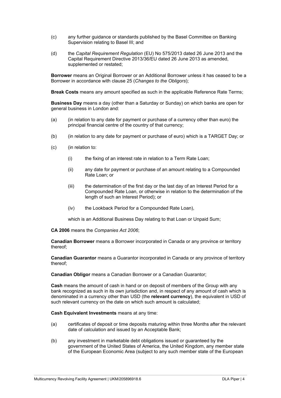 Multicurrency Revolving Facility Agreement | UKM/205896918.6 DLA Piper | 4 (c) any further guidance or standards published by the Basel Committee on Banking Supervision relating to Basel III; and (d) the Capital Requirement Regulation (EU) No 575/2013 dated 26 June 2013 and the Capital Requirement Directive 2013/36/EU dated 26 June 2013 as amended, supplemented or restated; Borrower means an Original Borrower or an Additional Borrower unless it has ceased to be a Borrower in accordance with clause 25 (Changes to the Obligors); Break Costs means any amount specified as such in the applicable Reference Rate Terms; Business Day means a day (other than a Saturday or Sunday) on which banks are open for general business in London and: (a) (in relation to any date for payment or purchase of a currency other than euro) the principal financial centre of the country of that currency; (b) (in relation to any date for payment or purchase of euro) which is a TARGET Day; or (c) (in relation to: (i) the fixing of an interest rate in relation to a Term Rate Loan; (ii) any date for payment or purchase of an amount relating to a Compounded Rate Loan; or (iii) the determination of the first day or the last day of an Interest Period for a Compounded Rate Loan, or otherwise in relation to the determination of the length of such an Interest Period); or (iv) the Lookback Period for a Compounded Rate Loan), which is an Additional Business Day relating to that Loan or Unpaid Sum; CA 2006 means the Companies Act 2006; Canadian Borrower means a Borrower incorporated in Canada or any province or territory thereof; Canadian Guarantor means a Guarantor incorporated in Canada or any province of territory thereof; Canadian Obligor means a Canadian Borrower or a Canadian Guarantor; Cash means the amount of cash in hand or on deposit of members of the Group with any bank recognized as such in its own jurisdiction and, in respect of any amount of cash which is denominated in a currency other than USD (the relevant currency), the equivalent in USD of such relevant currency on the date on which such amount is calculated; Cash Equivalent Investments means at any time: (a) certificates of deposit or time deposits maturing within three Months after the relevant date of calculation and issued by an Acceptable Bank; (b) any investment in marketable debt obligations issued or guaranteed by the government of the United States of America, the United Kingdom, any member state of the European Economic Area (subject to any such member state of the European