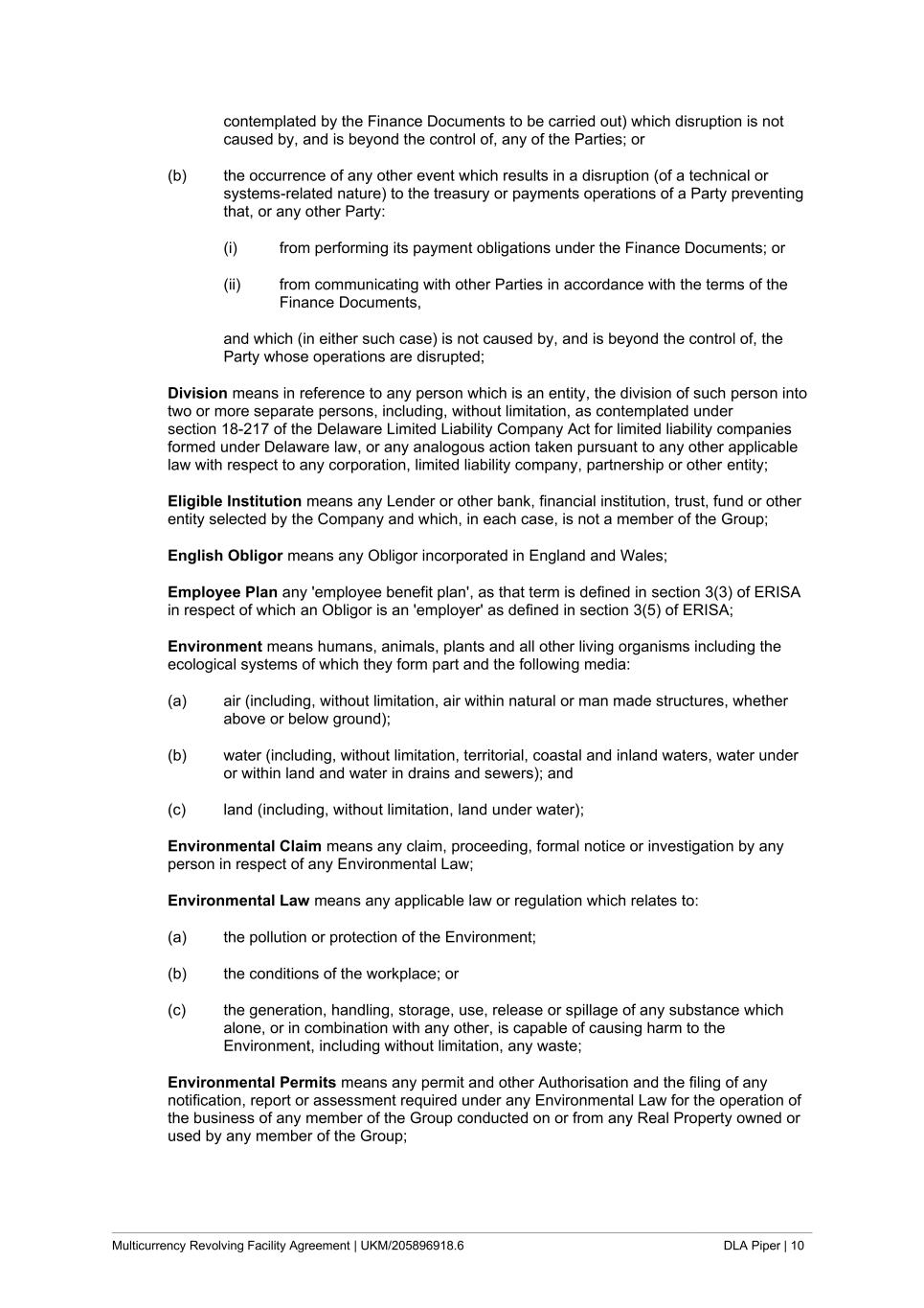 Multicurrency Revolving Facility Agreement | UKM/205896918.6 DLA Piper | 10 contemplated by the Finance Documents to be carried out) which disruption is not caused by, and is beyond the control of, any of the Parties; or (b) the occurrence of any other event which results in a disruption (of a technical or systems-related nature) to the treasury or payments operations of a Party preventing that, or any other Party: (i) from performing its payment obligations under the Finance Documents; or (ii) from communicating with other Parties in accordance with the terms of the Finance Documents, and which (in either such case) is not caused by, and is beyond the control of, the Party whose operations are disrupted; Division means in reference to any person which is an entity, the division of such person into two or more separate persons, including, without limitation, as contemplated under section 18-217 of the Delaware Limited Liability Company Act for limited liability companies formed under Delaware law, or any analogous action taken pursuant to any other applicable law with respect to any corporation, limited liability company, partnership or other entity; Eligible Institution means any Lender or other bank, financial institution, trust, fund or other entity selected by the Company and which, in each case, is not a member of the Group; English Obligor means any Obligor incorporated in England and Wales; Employee Plan any 'employee benefit plan', as that term is defined in section 3(3) of ERISA in respect of which an Obligor is an 'employer' as defined in section 3(5) of ERISA; Environment means humans, animals, plants and all other living organisms including the ecological systems of which they form part and the following media: (a) air (including, without limitation, air within natural or man made structures, whether above or below ground); (b) water (including, without limitation, territorial, coastal and inland waters, water under or within land and water in drains and sewers); and (c) land (including, without limitation, land under water); Environmental Claim means any claim, proceeding, formal notice or investigation by any person in respect of any Environmental Law; Environmental Law means any applicable law or regulation which relates to: (a) the pollution or protection of the Environment; (b) the conditions of the workplace; or (c) the generation, handling, storage, use, release or spillage of any substance which alone, or in combination with any other, is capable of causing harm to the Environment, including without limitation, any waste; Environmental Permits means any permit and other Authorisation and the filing of any notification, report or assessment required under any Environmental Law for the operation of the business of any member of the Group conducted on or from any Real Property owned or used by any member of the Group;