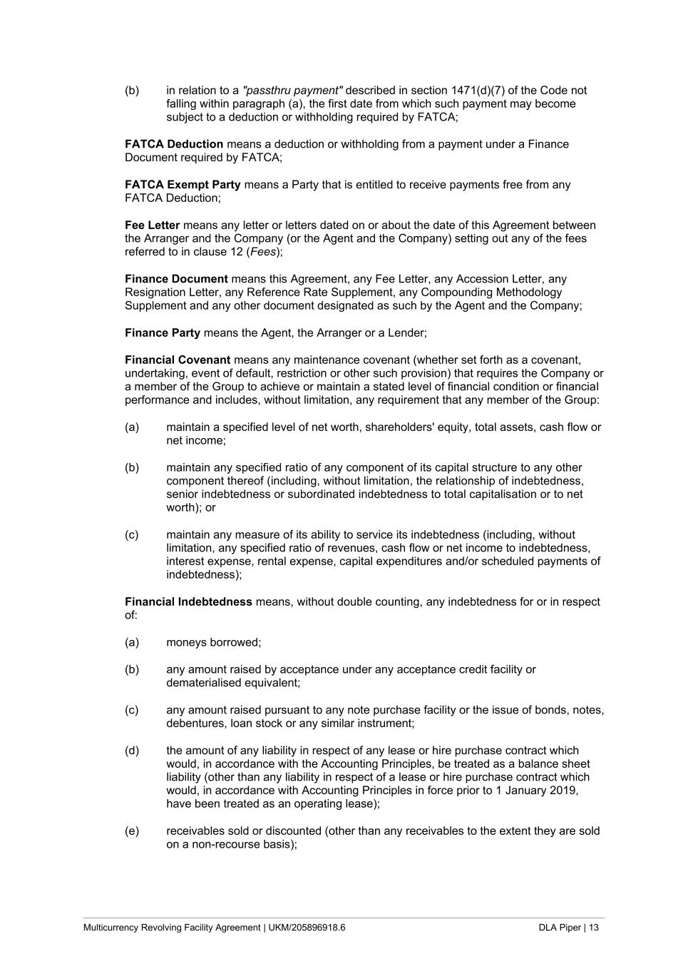 Multicurrency Revolving Facility Agreement | UKM/205896918.6 DLA Piper | 13 (b) in relation to a "passthru payment" described in section 1471(d)(7) of the Code not falling within paragraph (a), the first date from which such payment may become subject to a deduction or withholding required by FATCA; FATCA Deduction means a deduction or withholding from a payment under a Finance Document required by FATCA; FATCA Exempt Party means a Party that is entitled to receive payments free from any FATCA Deduction; Fee Letter means any letter or letters dated on or about the date of this Agreement between the Arranger and the Company (or the Agent and the Company) setting out any of the fees referred to in clause 12 (Fees); Finance Document means this Agreement, any Fee Letter, any Accession Letter, any Resignation Letter, any Reference Rate Supplement, any Compounding Methodology Supplement and any other document designated as such by the Agent and the Company; Finance Party means the Agent, the Arranger or a Lender; Financial Covenant means any maintenance covenant (whether set forth as a covenant, undertaking, event of default, restriction or other such provision) that requires the Company or a member of the Group to achieve or maintain a stated level of financial condition or financial performance and includes, without limitation, any requirement that any member of the Group: (a) maintain a specified level of net worth, shareholders' equity, total assets, cash flow or net income; (b) maintain any specified ratio of any component of its capital structure to any other component thereof (including, without limitation, the relationship of indebtedness, senior indebtedness or subordinated indebtedness to total capitalisation or to net worth); or (c) maintain any measure of its ability to service its indebtedness (including, without limitation, any specified ratio of revenues, cash flow or net income to indebtedness, interest expense, rental expense, capital expenditures and/or scheduled payments of indebtedness); Financial Indebtedness means, without double counting, any indebtedness for or in respect of: (a) moneys borrowed; (b) any amount raised by acceptance under any acceptance credit facility or dematerialised equivalent; (c) any amount raised pursuant to any note purchase facility or the issue of bonds, notes, debentures, loan stock or any similar instrument; (d) the amount of any liability in respect of any lease or hire purchase contract which would, in accordance with the Accounting Principles, be treated as a balance sheet liability (other than any liability in respect of a lease or hire purchase contract which would, in accordance with Accounting Principles in force prior to 1 January 2019, have been treated as an operating lease); (e) receivables sold or discounted (other than any receivables to the extent they are sold on a non-recourse basis);