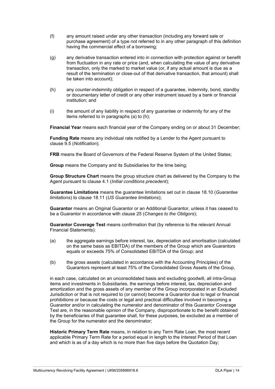 Multicurrency Revolving Facility Agreement | UKM/205896918.6 DLA Piper | 14 (f) any amount raised under any other transaction (including any forward sale or purchase agreement) of a type not referred to in any other paragraph of this definition having the commercial effect of a borrowing; (g) any derivative transaction entered into in connection with protection against or benefit from fluctuation in any rate or price (and, when calculating the value of any derivative transaction, only the marked to market value (or, if any actual amount is due as a result of the termination or close-out of that derivative transaction, that amount) shall be taken into account); (h) any counter-indemnity obligation in respect of a guarantee, indemnity, bond, standby or documentary letter of credit or any other instrument issued by a bank or financial institution; and (i) the amount of any liability in respect of any guarantee or indemnity for any of the items referred to in paragraphs (a) to (h); Financial Year means each financial year of the Company ending on or about 31 December; Funding Rate means any individual rate notified by a Lender to the Agent pursuant to clause 9.5 (Notification); FRB means the Board of Governors of the Federal Reserve System of the United States; Group means the Company and its Subsidiaries for the time being; Group Structure Chart means the group structure chart as delivered by the Company to the Agent pursuant to clause 4.1 (Initial conditions precedent); Guarantee Limitations means the guarantee limitations set out in clause 18.10 (Guarantee limitations) to clause 18.11 (US Guarantee limitations); Guarantor means an Original Guarantor or an Additional Guarantor, unless it has ceased to be a Guarantor in accordance with clause 25 (Changes to the Obligors); Guarantor Coverage Test means confirmation that (by reference to the relevant Annual Financial Statements): (a) the aggregate earnings before interest, tax, depreciation and amortisation (calculated on the same basis as EBITDA) of the members of the Group which are Guarantors equals or exceeds 75% of Consolidated EBITDA of the Group; and (b) the gross assets (calculated in accordance with the Accounting Principles) of the Guarantors represent at least 75% of the Consolidated Gross Assets of the Group, in each case, calculated on an unconsolidated basis and excluding goodwill, all intra-Group items and investments in Subsidiaries, the earnings before interest, tax, depreciation and amortization and the gross assets of any member of the Group incorporated in an Excluded Jurisdiction or that is not required to (or cannot) become a Guarantor due to legal or financial prohibitions or because the costs or legal and practical difficulties involved in becoming a Guarantor and/or in calculating the numerator and denominator of this Guarantor Coverage Test are, in the reasonable opinion of the Company, disproportionate to the benefit obtained by the beneficiaries of that guarantee shall, for these purposes, be excluded as a member of the Group for the numerator and the denominator; Historic Primary Term Rate means, in relation to any Term Rate Loan, the most recent applicable Primary Term Rate for a period equal in length to the Interest Period of that Loan and which is as of a day which is no more than five days before the Quotation Day;