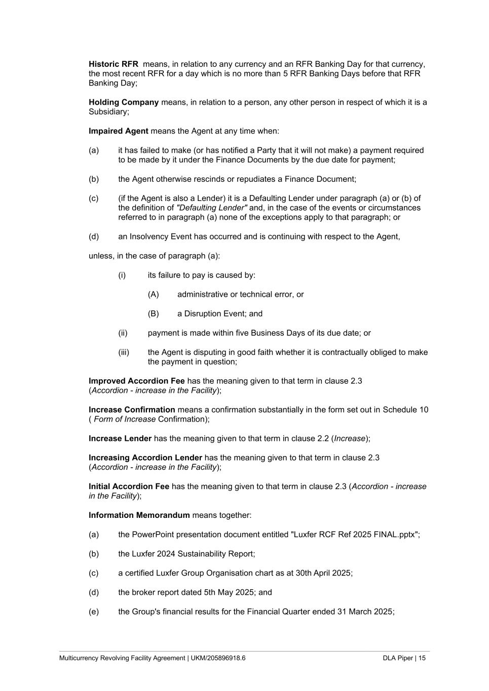 Multicurrency Revolving Facility Agreement | UKM/205896918.6 DLA Piper | 15 Historic RFR means, in relation to any currency and an RFR Banking Day for that currency, the most recent RFR for a day which is no more than 5 RFR Banking Days before that RFR Banking Day; Holding Company means, in relation to a person, any other person in respect of which it is a Subsidiary; Impaired Agent means the Agent at any time when: (a) it has failed to make (or has notified a Party that it will not make) a payment required to be made by it under the Finance Documents by the due date for payment; (b) the Agent otherwise rescinds or repudiates a Finance Document; (c) (if the Agent is also a Lender) it is a Defaulting Lender under paragraph (a) or (b) of the definition of "Defaulting Lender" and, in the case of the events or circumstances referred to in paragraph (a) none of the exceptions apply to that paragraph; or (d) an Insolvency Event has occurred and is continuing with respect to the Agent, unless, in the case of paragraph (a): (i) its failure to pay is caused by: (A) administrative or technical error, or (B) a Disruption Event; and (ii) payment is made within five Business Days of its due date; or (iii) the Agent is disputing in good faith whether it is contractually obliged to make the payment in question; Improved Accordion Fee has the meaning given to that term in clause 2.3 (Accordion - increase in the Facility); Increase Confirmation means a confirmation substantially in the form set out in Schedule 10 ( Form of Increase Confirmation); Increase Lender has the meaning given to that term in clause 2.2 (Increase); Increasing Accordion Lender has the meaning given to that term in clause 2.3 (Accordion - increase in the Facility); Initial Accordion Fee has the meaning given to that term in clause 2.3 (Accordion - increase in the Facility); Information Memorandum means together: (a) the PowerPoint presentation document entitled "Luxfer RCF Ref 2025 FINAL.pptx"; (b) the Luxfer 2024 Sustainability Report; (c) a certified Luxfer Group Organisation chart as at 30th April 2025; (d) the broker report dated 5th May 2025; and (e) the Group's financial results for the Financial Quarter ended 31 March 2025;