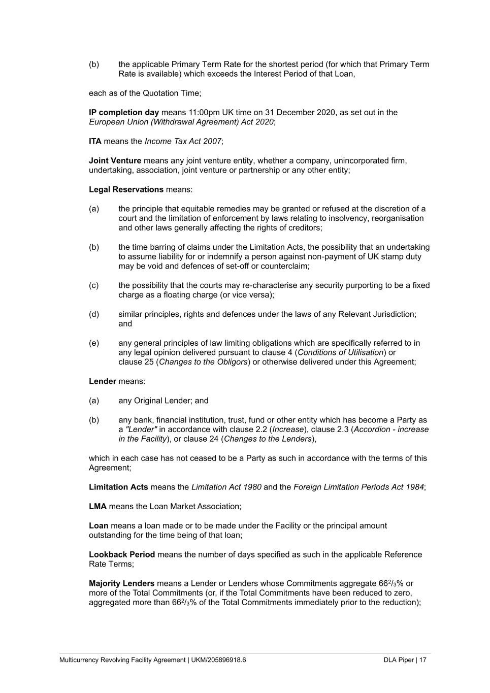 Multicurrency Revolving Facility Agreement | UKM/205896918.6 DLA Piper | 17 (b) the applicable Primary Term Rate for the shortest period (for which that Primary Term Rate is available) which exceeds the Interest Period of that Loan, each as of the Quotation Time; IP completion day means 11:00pm UK time on 31 December 2020, as set out in the European Union (Withdrawal Agreement) Act 2020; ITA means the Income Tax Act 2007; Joint Venture means any joint venture entity, whether a company, unincorporated firm, undertaking, association, joint venture or partnership or any other entity; Legal Reservations means: (a) the principle that equitable remedies may be granted or refused at the discretion of a court and the limitation of enforcement by laws relating to insolvency, reorganisation and other laws generally affecting the rights of creditors; (b) the time barring of claims under the Limitation Acts, the possibility that an undertaking to assume liability for or indemnify a person against non-payment of UK stamp duty may be void and defences of set-off or counterclaim; (c) the possibility that the courts may re-characterise any security purporting to be a fixed charge as a floating charge (or vice versa); (d) similar principles, rights and defences under the laws of any Relevant Jurisdiction; and (e) any general principles of law limiting obligations which are specifically referred to in any legal opinion delivered pursuant to clause 4 (Conditions of Utilisation) or clause 25 (Changes to the Obligors) or otherwise delivered under this Agreement; Lender means: (a) any Original Lender; and (b) any bank, financial institution, trust, fund or other entity which has become a Party as a "Lender" in accordance with clause 2.2 (Increase), clause 2.3 (Accordion - increase in the Facility), or clause 24 (Changes to the Lenders), which in each case has not ceased to be a Party as such in accordance with the terms of this Agreement; Limitation Acts means the Limitation Act 1980 and the Foreign Limitation Periods Act 1984; LMA means the Loan Market Association; Loan means a loan made or to be made under the Facility or the principal amount outstanding for the time being of that loan; Lookback Period means the number of days specified as such in the applicable Reference Rate Terms; Majority Lenders means a Lender or Lenders whose Commitments aggregate 662/3% or more of the Total Commitments (or, if the Total Commitments have been reduced to zero, aggregated more than 662/3% of the Total Commitments immediately prior to the reduction);