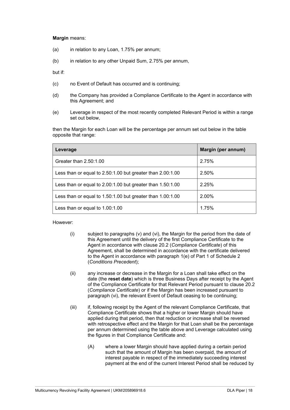 Multicurrency Revolving Facility Agreement | UKM/205896918.6 DLA Piper | 18 Margin means: (a) in relation to any Loan, 1.75% per annum; (b) in relation to any other Unpaid Sum, 2.75% per annum, but if: (c) no Event of Default has occurred and is continuing; (d) the Company has provided a Compliance Certificate to the Agent in accordance with this Agreement; and (e) Leverage in respect of the most recently completed Relevant Period is within a range set out below, then the Margin for each Loan will be the percentage per annum set out below in the table opposite that range: Leverage Margin (per annum) Greater than 2.50:1.00 2.75% Less than or equal to 2.50:1.00 but greater than 2.00:1.00 2.50% Less than or equal to 2.00:1.00 but greater than 1.50:1.00 2.25% Less than or equal to 1.50:1.00 but greater than 1.00:1.00 2.00% Less than or equal to 1.00:1.00 1.75% However: (i) subject to paragraphs (v) and (vi), the Margin for the period from the date of this Agreement until the delivery of the first Compliance Certificate to the Agent in accordance with clause 20.2 (Compliance Certificate) of this Agreement, shall be determined in accordance with the certificate delivered to the Agent in accordance with paragraph 1(e) of Part 1 of Schedule 2 (Conditions Precedent); (ii) any increase or decrease in the Margin for a Loan shall take effect on the date (the reset date) which is three Business Days after receipt by the Agent of the Compliance Certificate for that Relevant Period pursuant to clause 20.2 (Compliance Certificate) or if the Margin has been increased pursuant to paragraph (vi), the relevant Event of Default ceasing to be continuing; (iii) if, following receipt by the Agent of the relevant Compliance Certificate, that Compliance Certificate shows that a higher or lower Margin should have applied during that period, then that reduction or increase shall be reversed with retrospective effect and the Margin for that Loan shall be the percentage per annum determined using the table above and Leverage calculated using the figures in that Compliance Certificate and: (A) where a lower Margin should have applied during a certain period such that the amount of Margin has been overpaid, the amount of interest payable in respect of the immediately succeeding interest payment at the end of the current Interest Period shall be reduced by