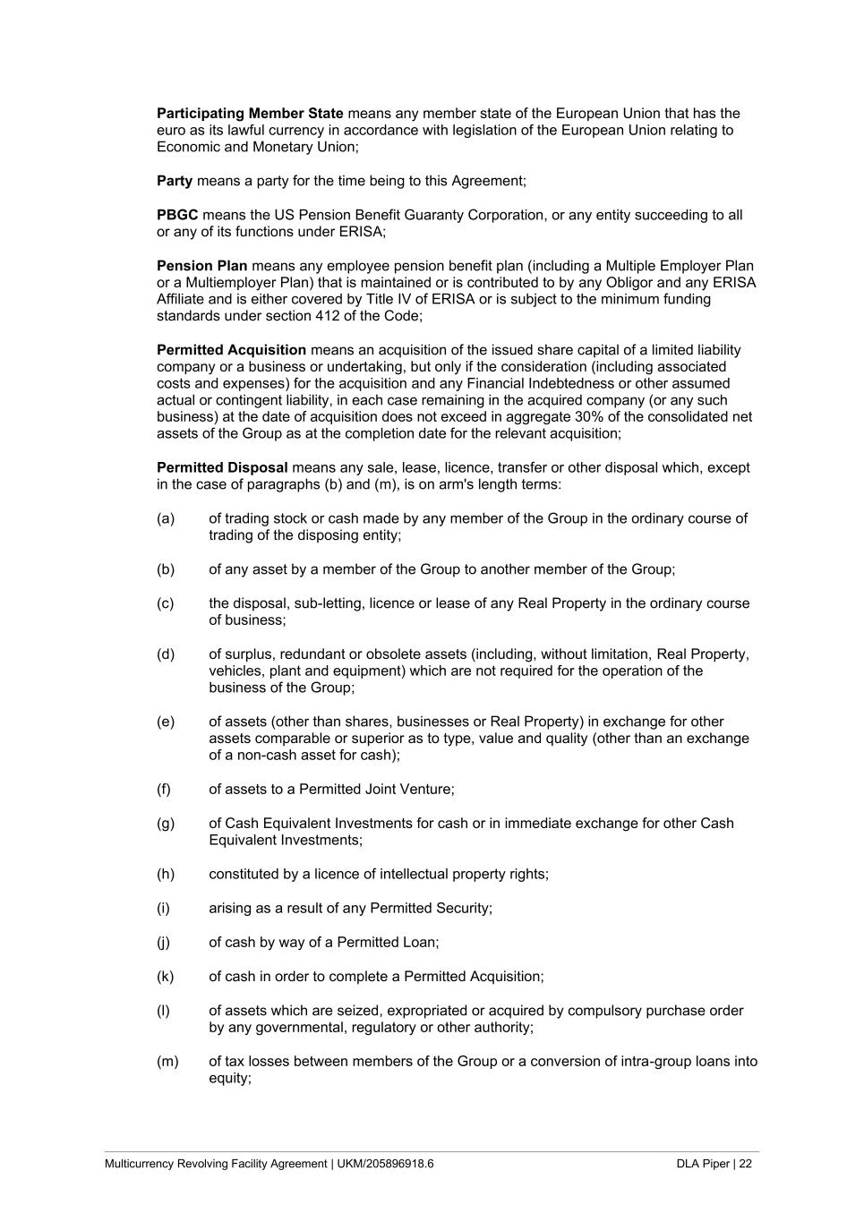 Multicurrency Revolving Facility Agreement | UKM/205896918.6 DLA Piper | 22 Participating Member State means any member state of the European Union that has the euro as its lawful currency in accordance with legislation of the European Union relating to Economic and Monetary Union; Party means a party for the time being to this Agreement; PBGC means the US Pension Benefit Guaranty Corporation, or any entity succeeding to all or any of its functions under ERISA; Pension Plan means any employee pension benefit plan (including a Multiple Employer Plan or a Multiemployer Plan) that is maintained or is contributed to by any Obligor and any ERISA Affiliate and is either covered by Title IV of ERISA or is subject to the minimum funding standards under section 412 of the Code; Permitted Acquisition means an acquisition of the issued share capital of a limited liability company or a business or undertaking, but only if the consideration (including associated costs and expenses) for the acquisition and any Financial Indebtedness or other assumed actual or contingent liability, in each case remaining in the acquired company (or any such business) at the date of acquisition does not exceed in aggregate 30% of the consolidated net assets of the Group as at the completion date for the relevant acquisition; Permitted Disposal means any sale, lease, licence, transfer or other disposal which, except in the case of paragraphs (b) and (m), is on arm's length terms: (a) of trading stock or cash made by any member of the Group in the ordinary course of trading of the disposing entity; (b) of any asset by a member of the Group to another member of the Group; (c) the disposal, sub-letting, licence or lease of any Real Property in the ordinary course of business; (d) of surplus, redundant or obsolete assets (including, without limitation, Real Property, vehicles, plant and equipment) which are not required for the operation of the business of the Group; (e) of assets (other than shares, businesses or Real Property) in exchange for other assets comparable or superior as to type, value and quality (other than an exchange of a non-cash asset for cash); (f) of assets to a Permitted Joint Venture; (g) of Cash Equivalent Investments for cash or in immediate exchange for other Cash Equivalent Investments; (h) constituted by a licence of intellectual property rights; (i) arising as a result of any Permitted Security; (j) of cash by way of a Permitted Loan; (k) of cash in order to complete a Permitted Acquisition; (l) of assets which are seized, expropriated or acquired by compulsory purchase order by any governmental, regulatory or other authority; (m) of tax losses between members of the Group or a conversion of intra-group loans into equity;