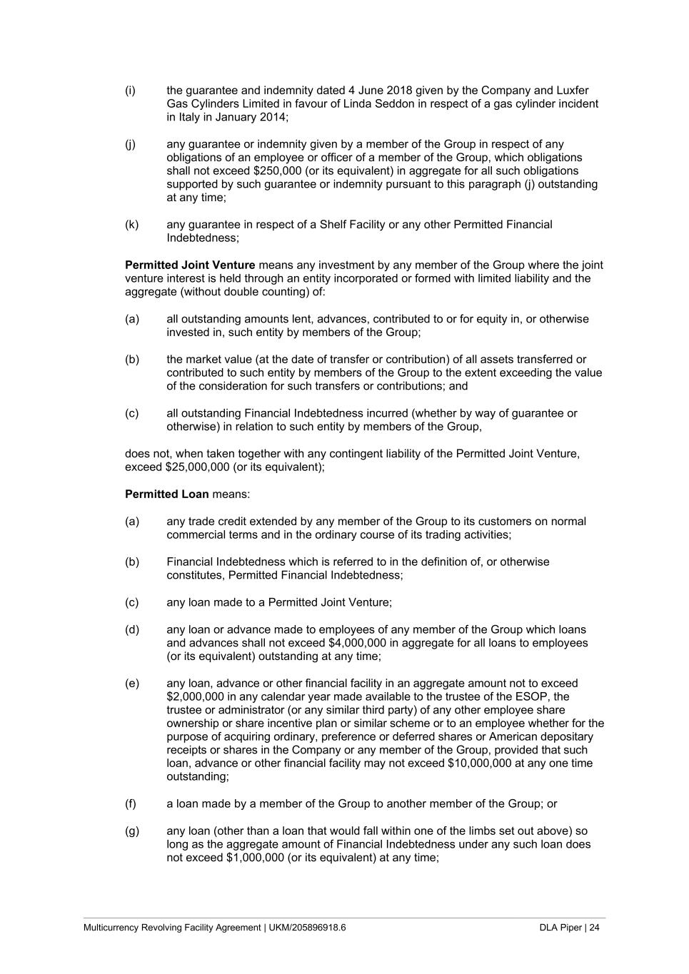 Multicurrency Revolving Facility Agreement | UKM/205896918.6 DLA Piper | 24 (i) the guarantee and indemnity dated 4 June 2018 given by the Company and Luxfer Gas Cylinders Limited in favour of Linda Seddon in respect of a gas cylinder incident in Italy in January 2014; (j) any guarantee or indemnity given by a member of the Group in respect of any obligations of an employee or officer of a member of the Group, which obligations shall not exceed $250,000 (or its equivalent) in aggregate for all such obligations supported by such guarantee or indemnity pursuant to this paragraph (j) outstanding at any time; (k) any guarantee in respect of a Shelf Facility or any other Permitted Financial Indebtedness; Permitted Joint Venture means any investment by any member of the Group where the joint venture interest is held through an entity incorporated or formed with limited liability and the aggregate (without double counting) of: (a) all outstanding amounts lent, advances, contributed to or for equity in, or otherwise invested in, such entity by members of the Group; (b) the market value (at the date of transfer or contribution) of all assets transferred or contributed to such entity by members of the Group to the extent exceeding the value of the consideration for such transfers or contributions; and (c) all outstanding Financial Indebtedness incurred (whether by way of guarantee or otherwise) in relation to such entity by members of the Group, does not, when taken together with any contingent liability of the Permitted Joint Venture, exceed $25,000,000 (or its equivalent); Permitted Loan means: (a) any trade credit extended by any member of the Group to its customers on normal commercial terms and in the ordinary course of its trading activities; (b) Financial Indebtedness which is referred to in the definition of, or otherwise constitutes, Permitted Financial Indebtedness; (c) any loan made to a Permitted Joint Venture; (d) any loan or advance made to employees of any member of the Group which loans and advances shall not exceed $4,000,000 in aggregate for all loans to employees (or its equivalent) outstanding at any time; (e) any loan, advance or other financial facility in an aggregate amount not to exceed $2,000,000 in any calendar year made available to the trustee of the ESOP, the trustee or administrator (or any similar third party) of any other employee share ownership or share incentive plan or similar scheme or to an employee whether for the purpose of acquiring ordinary, preference or deferred shares or American depositary receipts or shares in the Company or any member of the Group, provided that such loan, advance or other financial facility may not exceed $10,000,000 at any one time outstanding; (f) a loan made by a member of the Group to another member of the Group; or (g) any loan (other than a loan that would fall within one of the limbs set out above) so long as the aggregate amount of Financial Indebtedness under any such loan does not exceed $1,000,000 (or its equivalent) at any time;