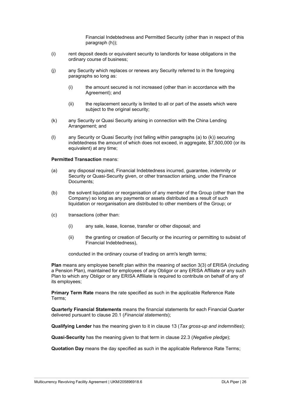 Multicurrency Revolving Facility Agreement | UKM/205896918.6 DLA Piper | 26 Financial Indebtedness and Permitted Security (other than in respect of this paragraph (h)); (i) rent deposit deeds or equivalent security to landlords for lease obligations in the ordinary course of business; (j) any Security which replaces or renews any Security referred to in the foregoing paragraphs so long as: (i) the amount secured is not increased (other than in accordance with the Agreement); and (ii) the replacement security is limited to all or part of the assets which were subject to the original security; (k) any Security or Quasi Security arising in connection with the China Lending Arrangement; and (l) any Security or Quasi Security (not falling within paragraphs (a) to (k)) securing indebtedness the amount of which does not exceed, in aggregate, $7,500,000 (or its equivalent) at any time; Permitted Transaction means: (a) any disposal required, Financial Indebtedness incurred, guarantee, indemnity or Security or Quasi-Security given, or other transaction arising, under the Finance Documents; (b) the solvent liquidation or reorganisation of any member of the Group (other than the Company) so long as any payments or assets distributed as a result of such liquidation or reorganisation are distributed to other members of the Group; or (c) transactions (other than: (i) any sale, lease, license, transfer or other disposal; and (ii) the granting or creation of Security or the incurring or permitting to subsist of Financial Indebtedness), conducted in the ordinary course of trading on arm's length terms; Plan means any employee benefit plan within the meaning of section 3(3) of ERISA (including a Pension Plan), maintained for employees of any Obligor or any ERISA Affiliate or any such Plan to which any Obligor or any ERISA Affiliate is required to contribute on behalf of any of its employees; Primary Term Rate means the rate specified as such in the applicable Reference Rate Terms; Quarterly Financial Statements means the financial statements for each Financial Quarter delivered pursuant to clause 20.1 (Financial statements); Qualifying Lender has the meaning given to it in clause 13 (Tax gross-up and indemnities); Quasi-Security has the meaning given to that term in clause 22.3 (Negative pledge); Quotation Day means the day specified as such in the applicable Reference Rate Terms;