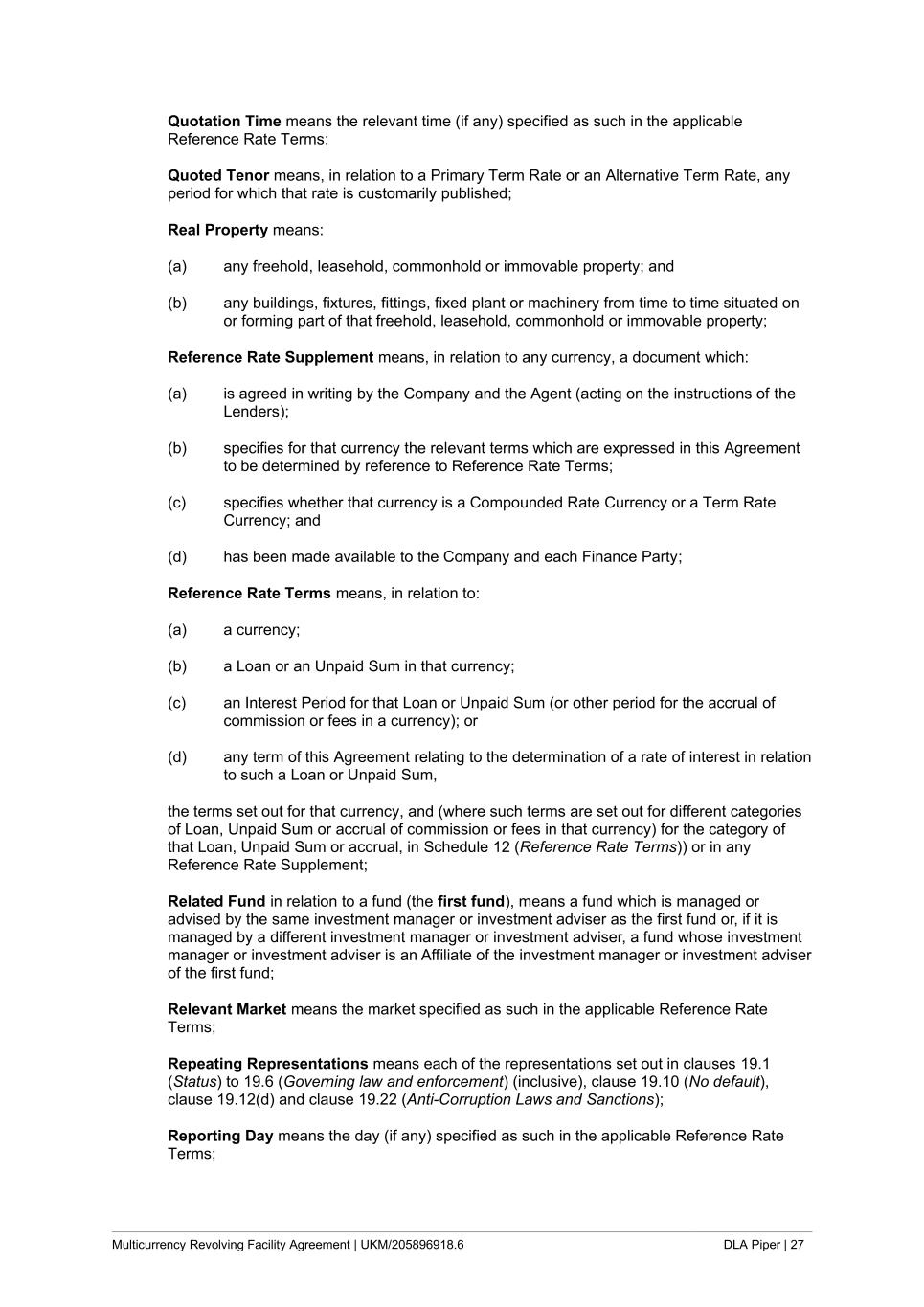 Multicurrency Revolving Facility Agreement | UKM/205896918.6 DLA Piper | 27 Quotation Time means the relevant time (if any) specified as such in the applicable Reference Rate Terms; Quoted Tenor means, in relation to a Primary Term Rate or an Alternative Term Rate, any period for which that rate is customarily published; Real Property means: (a) any freehold, leasehold, commonhold or immovable property; and (b) any buildings, fixtures, fittings, fixed plant or machinery from time to time situated on or forming part of that freehold, leasehold, commonhold or immovable property; Reference Rate Supplement means, in relation to any currency, a document which: (a) is agreed in writing by the Company and the Agent (acting on the instructions of the Lenders); (b) specifies for that currency the relevant terms which are expressed in this Agreement to be determined by reference to Reference Rate Terms; (c) specifies whether that currency is a Compounded Rate Currency or a Term Rate Currency; and (d) has been made available to the Company and each Finance Party; Reference Rate Terms means, in relation to: (a) a currency; (b) a Loan or an Unpaid Sum in that currency; (c) an Interest Period for that Loan or Unpaid Sum (or other period for the accrual of commission or fees in a currency); or (d) any term of this Agreement relating to the determination of a rate of interest in relation to such a Loan or Unpaid Sum, the terms set out for that currency, and (where such terms are set out for different categories of Loan, Unpaid Sum or accrual of commission or fees in that currency) for the category of that Loan, Unpaid Sum or accrual, in Schedule 12 (Reference Rate Terms)) or in any Reference Rate Supplement; Related Fund in relation to a fund (the first fund), means a fund which is managed or advised by the same investment manager or investment adviser as the first fund or, if it is managed by a different investment manager or investment adviser, a fund whose investment manager or investment adviser is an Affiliate of the investment manager or investment adviser of the first fund; Relevant Market means the market specified as such in the applicable Reference Rate Terms; Repeating Representations means each of the representations set out in clauses 19.1 (Status) to 19.6 (Governing law and enforcement) (inclusive), clause 19.10 (No default), clause 19.12(d) and clause 19.22 (Anti-Corruption Laws and Sanctions); Reporting Day means the day (if any) specified as such in the applicable Reference Rate Terms;