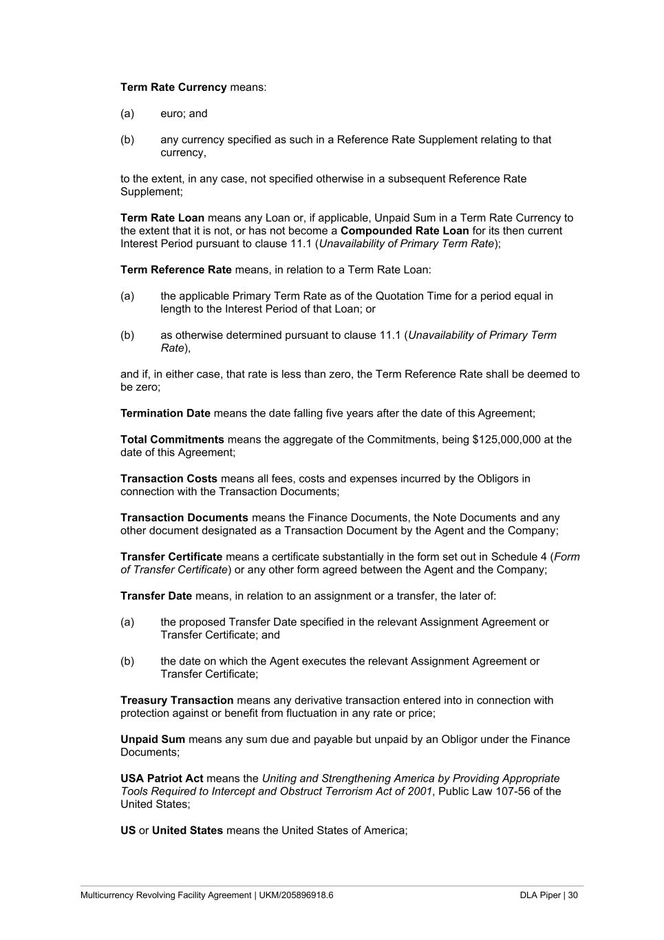 Multicurrency Revolving Facility Agreement | UKM/205896918.6 DLA Piper | 30 Term Rate Currency means: (a) euro; and (b) any currency specified as such in a Reference Rate Supplement relating to that currency, to the extent, in any case, not specified otherwise in a subsequent Reference Rate Supplement; Term Rate Loan means any Loan or, if applicable, Unpaid Sum in a Term Rate Currency to the extent that it is not, or has not become a Compounded Rate Loan for its then current Interest Period pursuant to clause 11.1 (Unavailability of Primary Term Rate); Term Reference Rate means, in relation to a Term Rate Loan: (a) the applicable Primary Term Rate as of the Quotation Time for a period equal in length to the Interest Period of that Loan; or (b) as otherwise determined pursuant to clause 11.1 (Unavailability of Primary Term Rate), and if, in either case, that rate is less than zero, the Term Reference Rate shall be deemed to be zero; Termination Date means the date falling five years after the date of this Agreement; Total Commitments means the aggregate of the Commitments, being $125,000,000 at the date of this Agreement; Transaction Costs means all fees, costs and expenses incurred by the Obligors in connection with the Transaction Documents; Transaction Documents means the Finance Documents, the Note Documents and any other document designated as a Transaction Document by the Agent and the Company; Transfer Certificate means a certificate substantially in the form set out in Schedule 4 (Form of Transfer Certificate) or any other form agreed between the Agent and the Company; Transfer Date means, in relation to an assignment or a transfer, the later of: (a) the proposed Transfer Date specified in the relevant Assignment Agreement or Transfer Certificate; and (b) the date on which the Agent executes the relevant Assignment Agreement or Transfer Certificate; Treasury Transaction means any derivative transaction entered into in connection with protection against or benefit from fluctuation in any rate or price; Unpaid Sum means any sum due and payable but unpaid by an Obligor under the Finance Documents; USA Patriot Act means the Uniting and Strengthening America by Providing Appropriate Tools Required to Intercept and Obstruct Terrorism Act of 2001, Public Law 107-56 of the United States; US or United States means the United States of America;