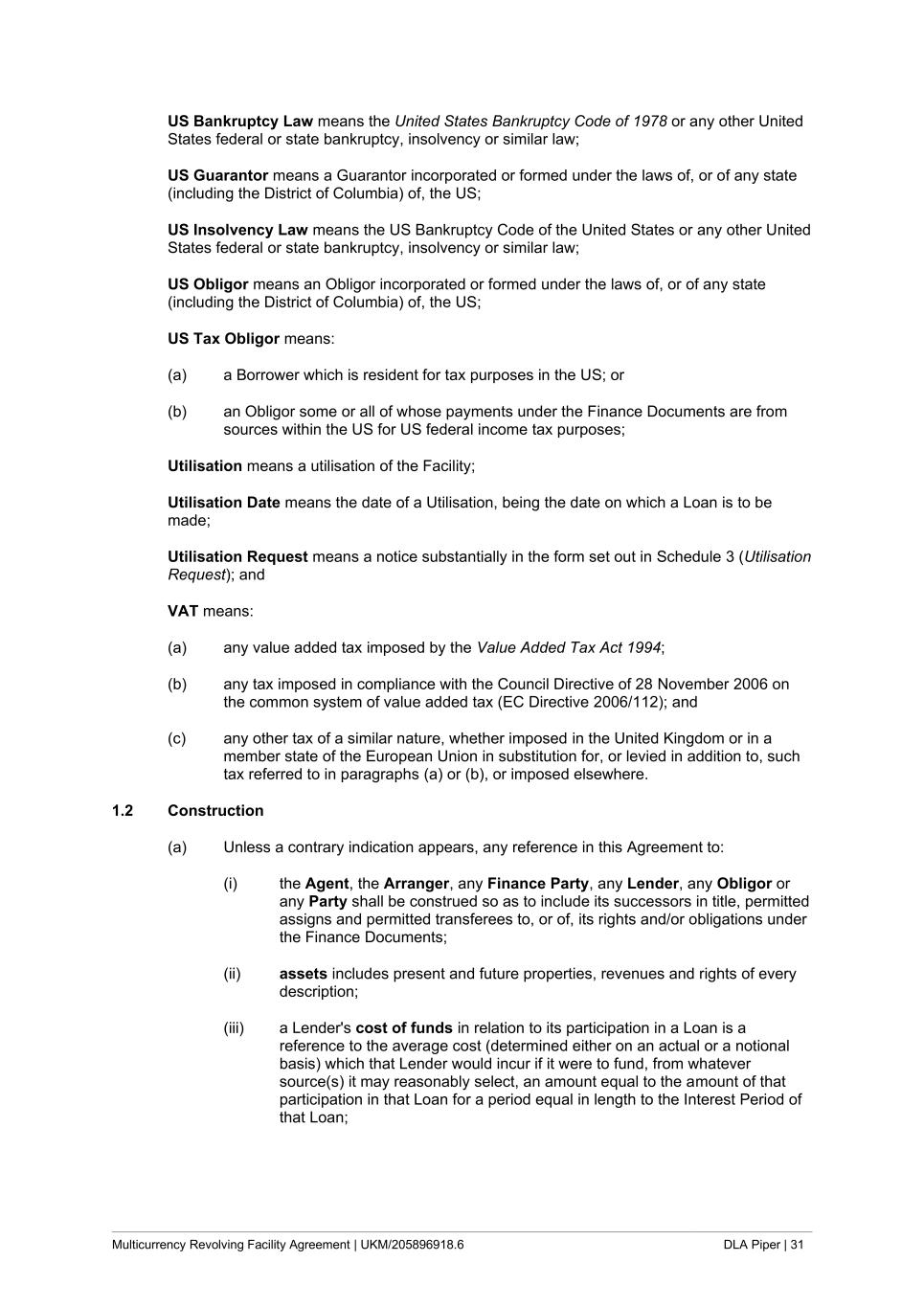 Multicurrency Revolving Facility Agreement | UKM/205896918.6 DLA Piper | 31 US Bankruptcy Law means the United States Bankruptcy Code of 1978 or any other United States federal or state bankruptcy, insolvency or similar law; US Guarantor means a Guarantor incorporated or formed under the laws of, or of any state (including the District of Columbia) of, the US; US Insolvency Law means the US Bankruptcy Code of the United States or any other United States federal or state bankruptcy, insolvency or similar law; US Obligor means an Obligor incorporated or formed under the laws of, or of any state (including the District of Columbia) of, the US; US Tax Obligor means: (a) a Borrower which is resident for tax purposes in the US; or (b) an Obligor some or all of whose payments under the Finance Documents are from sources within the US for US federal income tax purposes; Utilisation means a utilisation of the Facility; Utilisation Date means the date of a Utilisation, being the date on which a Loan is to be made; Utilisation Request means a notice substantially in the form set out in Schedule 3 (Utilisation Request); and VAT means: (a) any value added tax imposed by the Value Added Tax Act 1994; (b) any tax imposed in compliance with the Council Directive of 28 November 2006 on the common system of value added tax (EC Directive 2006/112); and (c) any other tax of a similar nature, whether imposed in the United Kingdom or in a member state of the European Union in substitution for, or levied in addition to, such tax referred to in paragraphs (a) or (b), or imposed elsewhere. 1.2 Construction (a) Unless a contrary indication appears, any reference in this Agreement to: (i) the Agent, the Arranger, any Finance Party, any Lender, any Obligor or any Party shall be construed so as to include its successors in title, permitted assigns and permitted transferees to, or of, its rights and/or obligations under the Finance Documents; (ii) assets includes present and future properties, revenues and rights of every description; (iii) a Lender's cost of funds in relation to its participation in a Loan is a reference to the average cost (determined either on an actual or a notional basis) which that Lender would incur if it were to fund, from whatever source(s) it may reasonably select, an amount equal to the amount of that participation in that Loan for a period equal in length to the Interest Period of that Loan;